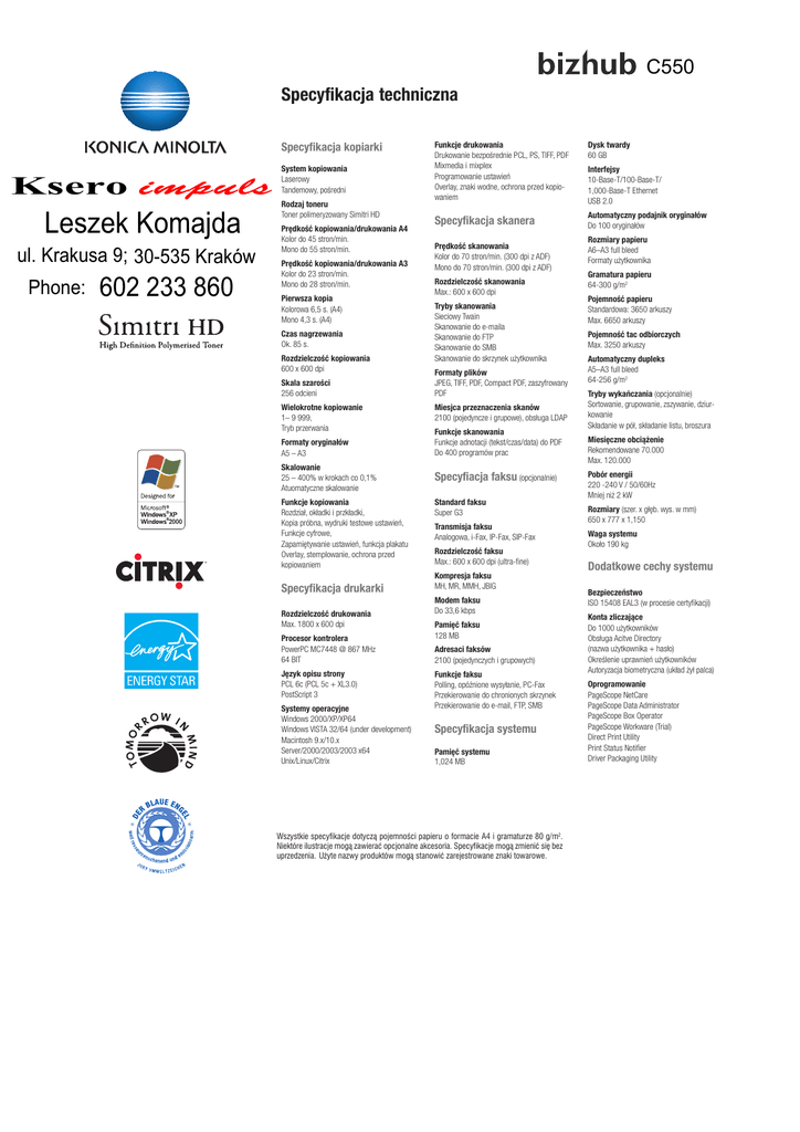 C550 Specyfikacja techniczna Specyfikacja kopiarki Ksero impuls Leszek Komajda ul. Krakusa 9; 30-535 Kraków Phone: 602 233 860 System kopiowania Laserowy Tandemowy, pośredni Rodzaj toneru Toner polimeryzowany Simitri HD Prędkość kopiowania/drukowania A4 Kolor do 45 stron/min. Mono do 55 stron/min. Prędkość kopiowania/drukowania A3 Kolor do 23 stron/min. Mono do 28 stron/min. Pierwsza kopia Kolorowa 6,5 s. (A4) Mono 4,3 s. (A4) Czas nagrzewania Ok. 85 s. Rozdzielczość kopiowania 600 x 600 dpi Skala szarości 256 odcieni Wielokrotne kopiowanie 1– 9 999, Tryb przerwania Formaty oryginałów A5 – A3 Skalowanie 25 – 400% w krokach co 0,1% Atuomatyczne skalowanie Funkcje kopiowania Rozdział, okładki i przkładki, Kopia próbna, wydruki testowe ustawień, Funkcje cyfrowe, Zapamiętywanie ustawień, funkcja plakatu Overlay, stemplowanie, ochrona przed kopiowaniem Specyfikacja drukarki Rozdzielczość drukowania Max. 1800 x 600 dpi Procesor kontrolera PowerPC MC7448 @ 867 MHz 64 BIT Język opisu strony PCL 6c (PCL 5c + XL3.0) PostScript 3 Systemy operacyjne Windows 2000/XP/XP64 Windows VISTA 32/64 (under development) Macintosh 9.x/10.x Server/2000/2003/2003 x64 Unix/Linux/Citrix Funkcje drukowania Drukowanie bezpośrednie PCL, PS, TIFF, PDF Mixmedia i mixplex Programowanie ustawień Overlay, znaki wodne, ochrona przed kopiowaniem Dysk twardy 60 GB Specyfikacja skanera Automatyczny podajnik oryginałów Do 100 oryginałów Prędkość skanowania Kolor do 70 stron/min. (300 dpi z ADF) Mono do 70 stron/min. (300 dpi z ADF) Rozdzielczość skanowania Max.: 600 x 600 dpi Tryby skanowania Sieciowy Twain Skanowanie do e-maila Skanowanie do FTP Skanowanie do SMB Skanowanie do skrzynek użytkownika Formaty plików JPEG, TIFF, PDF, Compact PDF, zaszyfrowany PDF Miesjca przeznaczenia skanów 2100 (pojedyncze i grupowe), obsługa LDAP Funkcje skanowania Funkcje adnotacji (tekst/czas/data) do PDF Do 400 programów prac Specyfiacja faksu (opcjonalnie) Standard faksu Super G3 Transmisja faksu Analogowa, i-Fax, IP-Fax, SIP-Fax Rozdzielczość faksu Max.: 600 x 600 dpi (ultra-fine) Kompresja faksu MH, MR, MMH, JBIG Modem faksu Do 33,6 kbps Pamięć faksu 128 MB Adresaci faksów 2100 (pojedynczych i grupowych) Funkcje faksu Polling, opóźnione wysyłanie, PC-Fax Przekierowanie do chronionych skrzynek Przekierowanie do e-mail, FTP, SMB Specyfikacja systemu Pamięć systemu 1,024 MB Wszystkie specyfikacje dotyczą pojemności papieru o formacie A4 i gramaturze 80 g/m2. Niektóre ilustracje mogą zawierać opcjonalne akcesoria. Specyfikacje mogą zmienić się bez uprzedzenia. UŜyte nazwy produktów mogą stanowić zarejestrowane znaki towarowe. Interfejsy 10-Base-T/100-Base-T/ 1,000-Base-T Ethernet USB 2.0 Rozmiary papieru A6–A3 full bleed Formaty użytkownika Gramatura papieru 64-300 g/m2 Pojemność papieru Standardowa: 3650 arkuszy Max. 6650 arkuszy Pojemność tac odbiorczych Max. 3250 arkuszy Automatyczny dupleks A5–A3 full bleed 64-256 g/m2 Tryby wykańczania (opcjonalnie) Sortowanie, grupowanie, zszywanie, dziurkowanie Składanie w pół, składanie listu, broszura Miesięczne obciążenie Rekomendowane 70.000 Max. 120.000 Pobór energii 220 -240 V / 50/60Hz Mniej niż 2 kW Rozmiary (szer. x głęb. wys. w mm) 650 x 777 x 1,150 Waga systemu Około 190 kg Dodatkowe cechy systemu Bezpieczeństwo ISO 15408 EAL3 (w procesie certyfikacji) Konta zliczające Do 1000 użytkowników Obsługa Acitve Directory (nazwa użytkownika + hasło) Określenie uprawnień użytkowników Autoryzacja biometryczna (układ żył palca) Oprogramowanie PageScope NetCare PageScope Data Administrator PageScope Box Operator PageScope Workware (Trial) Direct Print Utility Print Status Notifier Driver Packaging Utility
