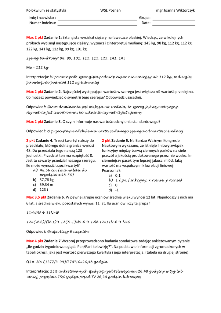 Kolokwium ze statystyki WSL Poznań Imię i nazwisko : Numer indeksu: mgr Joanna Wiktorczyk Grupa: Data: Max 2 pkt Zadanie 1: Sztangista wyciskał ciężary na ławeczce płaskiej. Wiedząc, że w kolejnych próbach wycisnął następujące ciężary, wyznacz i zinterpretuj medianę: 145 kg, 98 kg, 112 kg, 112 kg, 122 kg, 141 kg, 112 kg, 99 kg, 101 kg. Szereg punktowy: 98, 99, 101, 112, 112, 122, 141, 145 Me = 112 kg Interpretacja: W połowie prób sztangista podniósł ciężar nie mniejszy niż 112 kg, w drugiej połowie prób podniósł 112 kg lub mniej Max 2 pkt Zadanie 2. Najczęściej występująca wartość w szeregu jest większa niż wartość przeciętna. Co możesz powiedzieć o symetrii tego szeregu? Odpowiedź uzasadnij. Odpowiedź: Skoro dominanta jest większa niż średnia, to szereg jest asymetryczny. Asymetria jest lewostronna, bo wskaźnik asymetrii jest ujemny Max 2 pkt Zadanie 3. O czym informuje nas wartość odchylenia standardowego? Odpowiedź: O przeciętnym odchyleniu wartości danego szeregu od wartości średniej 2 pkt Zadanie 4. Trzeci kwartyl należy do przedziału, którego dolna granica wynosi 48. Do przedziału tego należą 123 jednostki. Przedział ten ma rozpiętość 8. Jest to czwarty przedział naszego szeregu. Ile może wynosić trzeci kwartyl? a) 48,56 cm (ma należeć do przedziału 48-56) 2 pkt Zadanie 5. Na Bardzo Ważnym Kongresie Naukowym wykazano, że istnieje liniowy związek funkcyjny między barwą ciemnych pasków na ciele pszczół a jakością produkowanego przez nie wosku. Im ciemniejszy pasek tym lepszej jakości miód. Jaką wartość ma współczynnik korelacji liniowej Pearson’a?: a) 0,1 b) 57,78 kg c) 59,34 m d) 123 t b) 1 (zw. funkcyjny, x rośnie, y rośnie) c) 0 d) -1 Max 3,5 pkt Zadanie 6. W pewnej grupie uczniów średnia wieku wynosi 12 lat. Najmłodszy z nich ma 6 lat, a średnia wieku pozostałych wynosi 11 lat. Ilu uczniów liczy ta grupa? 11=W/N 11N=W 12=(W-6)/(N-1) 12(N-1)=W-6 12N-12=11N-6 N=6 Odpowiedź: Grupa liczy 6 uczniów Max 4 pkt Zadanie 7 Wczoraj przeprowadzono badania sondażowa zadając ankietowanym pytanie „Ile godzin tygodniowo ogląda Pan/Pani telewizję?”. Na podstawie informacji zgromadzonych w tabeli określ, jaka jest wartość pierwszego kwartyla i jego interpretacja. (tabela na drugiej stronie). Q1 = 20+(1377/4-99)/378*10=26,48 godzin Interpretacja: 25% ankietowanych spędza przed telewizorem 26,48 godziny w tyg lub mniej, pozostałe 75% spędza przed TV 26,48 godzin lub więcej Kolokwium ze statystyki ilość ankietowanych Ilość godzin 10 20 30 40 50 - WSL Poznań 20 30 40 50 60 99 378 564 233 103 n cum n cum % 99 477 1041 1274 1377 7,1 34,64 75,59 92,51 100 mgr Joanna Wiktorczyk Tabela do zadań 7 i 8! ሻଶ ሺݔ െ ݔҧ ݊ 35 739 30 618 564 28 193 45 423 Max 1,5 pkt Zadanie 8. Na podstawie danych z tabeli oblicz i zinterpretuj wartość wariancji. (tabela powyżej) ݏଶ ൌ 140 537/1376=102,13 godzin2 Interpretacja: Wariancja ze względu na trudno interpretowalną jednostkę nie jest interpretowana Max 11 pkt Zadanie 9. Poniższe zestawienie przedstawia poziom kosztów (w tyś zł) w zależności od wielkości produkcji (w tyś szt) w zakładzie „Beta”. Produkcja x 3 4 7 9 8 11 Koszty y 10 9 17 20 19 27 x-średnia rednia Y - średnia rednia (x(x-sr)(ysr)(y-sr) (x(x-sr)2 (y(y-sr)2 -4 -7 28 16 49 -3 -8 24 9 64 0 0 0 0 0 2 3 6 4 9 1 2 2 1 4 4 10 40 16 100 100 46 226 Co jest zmienną objaśnianą? Wysokość kosztów Co objaśniającą? Wielkość produkcji Sporządź wykres: Oblicz współczynnik korelacji liniowej Pearson’a: rxy=100/pierwiastek(46*226)=0,98 a1=100/46=2,17 a0=17-2,17*7=1,81 Jaki jest poziom kosztów stałych (np. przy przestoju produkcyjnym)? 1,81 tyś Wraz ze spadkiem produkcji o 1000 sztuk o ile zmienia się wielkość kosztów? Mamy do czynienia ze wzrostem czy spadkiem kosztów w opisanej sytuacji? Spadek o 2,17 tyś zł