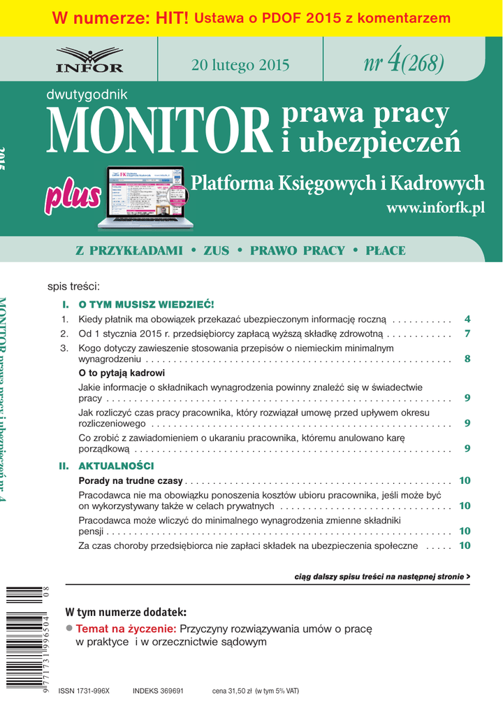 W numerze: HIT! Ustawa o PDOF 2015 z komentarzem nr 4(268) 20 lutego 2015 dwutygodnik MONITOR prawa pracy i ubezpieczeń Platforma Księgowych i Kadrowych P plus www.inforfk.pl Z PRZYKŁADAMI • ZUS • PRAWO PRACY • PŁACE spis treści: I. 1. 2. 3. O TYM MUSISZ WIEDZIEĆ! Kiedy płatnik ma obowiązek przekazać ubezpieczonym informację roczną . . . . . . . . . . . Od 1 stycznia 2015 r. przedsiębiorcy zapłacą wyższą składkę zdrowotną . . . . . . . . . . . . Kogo dotyczy zawieszenie stosowania przepisów o niemieckim minimalnym wynagrodzeniu . . . . . . . . . . . . . . . . . . . . . . . . . . . . . . . . . . . . . . . . . . . . . . . . . . . . . . . O to pytają kadrowi Jakie informacje o składnikach wynagrodzenia powinny znaleźć się w świadectwie pracy . . . . . . . . . . . . . . . . . . . . . . . . . . . . . . . . . . . . . . . . . . . . . . . . . . . . . . . . . . . . . . Jak rozliczyć czas pracy pracownika, który rozwiązał umowę przed upływem okresu rozliczeniowego . . . . . . . . . . . . . . . . . . . . . . . . . . . . . . . . . . . . . . . . . . . . . . . . . . . . . . Co zrobić z zawiadomieniem o ukaraniu pracownika, któremu anulowano karę porządkową . . . . . . . . . . . . . . . . . . . . . . . . . . . . . . . . . . . . . . . . . . . . . . . . . . . . . . . . . II. AKTUALNOŚCI Porady na trudne czasy . . . . . . . . . . . . . . . . . . . . . . . . . . . . . . . . . . . . . . . . . . . . . . . . Pracodawca nie ma obowiązku ponoszenia kosztów ubioru pracownika, jeśli może być on wykorzystywany także w celach prywatnych . . . . . . . . . . . . . . . . . . . . . . . . . . . . . . . Pracodawca może wliczyć do minimalnego wynagrodzenia zmienne składniki pensji . . . . . . . . . . . . . . . . . . . . . . . . . . . . . . . . . . . . . . . . . . . . . . . . . . . . . . . . . . . . . . Za czas choroby przedsiębiorca nie zapłaci składek na ubezpieczenia społeczne . . . . . 4 7 8 9 9 9 10 10 10 10 9 771731 996504 08 ciąg dalszy spisu treści na następnej stronie > W tym numerze dodatek: ● Temat na życzenie: Przyczyny rozwiązywania umów o pracę w praktyce i w orzecznictwie sądowym ISSN 1731-996X INDEKS 369691 cena 31,50 zł (w tym 5% VAT) POLECAMY W 2015 ROKU! Dodatki specjalnie na życzenie Czytelników ◗ Rozporządzenia wykonawcze do Kodeksu pracy 2015 z komentarzem ◗ Rozporządzenia wykonawcze do ustawy o systemie ubezpieczeń społecznych 2015 z komentarzem ◗ Ustawa zasiłkowa 2015 z komentarzem ◗ Sporządzanie i korygowanie listy płac w praktyce ◗ Urlopy wypoczynkowe – ustalanie wymiaru, udzielanie i naliczanie wynagrodzenia ◗ Umowy cywilnoprawne po zmianach – praktyczne rozliczenia Informacje i zamówienia: Biuro Obsługi Klienta: tel. 801 626 666, (22) 761 30 30, e-mail: [email protected] Prawidłowe ustalenie podstawy wymiaru zasiłku dla osób, które nie przepracowały ani jednego dnia, pozwoli uniknąć nadpłaty zasiłku . . . . . . . . . . . . . . . . . . . . . . . 1. Zmiany prawa – weszły w życie 29.01.–20.02.2015 r. . . . . . . . . . . . . . . . . . . . . . . . . . . 1.1. Zmiany w przysługiwaniu żołnierzom równoważników pieniężnych w zamian za umundurowanie i wyekwipowanie niewydane w naturze . . . . . . . . . . . . . . . . . . 1.2. Ustawa budżetowa na 2015 r. . . . . . . . . . . . . . . . . . . . . . . . . . . . . . . . . . . . . . . . 1.3. Zmiany w wymaganiach wobec kierowników i wychowawców wypoczynku dla dzieci i młodzieży szkolnej . . . . . . . . . . . . . . . . . . . . . . . . . . . . . . . . . . . . . . . 1.4. Zmiany w programie badań statystycznych statystyki publicznej na 2015 r. . . . . . . 1.5. Opiekunowie osób niepełnosprawnych nie opłacą podatku od odsetek od wypłaconych kwot zaległych zasiłków . . . . . . . . . . . . . . . . . . . . . . . . . . . . . . . 1.6. Zmiany w drugiej ustawie antykryzysowej . . . . . . . . . . . . . . . . . . . . . . . . . . . . . . 1.7. Nowe wzory wniosków w sprawie przyznawania pracodawcom korzystającym z rozwiązań na rzecz ochrony miejsc pracy: – świadczeń dla pracowników . . . . . . . . . . . . . . . . . . . . . . . . . . . . . . . . . . . . . . . – dofinansowań kosztów szkolenia pracowników . . . . . . . . . . . . . . . . . . . . . . . . . 1.8. Obowiązki oddelegowanych żołnierzy SWW w zakresie zachowania informacji niejawnych . . . . . . . . . . . . . . . . . . . . . . . . . . . . . . . . . . . . . . . . . . . . . . . . . . . . . 1.9. Aktualizacja w podstawach programowych kształcenia zawodowego . . . . . . . . . . . 1.10. Uzupełnienie spraw osobowych wynikających ze stosunku służbowego funkcjonariuszy Straży Granicznej . . . . . . . . . . . . . . . . . . . . . . . . . . . . . . . . . . . . 1.11. Uproszczony system oceny kompetencji kandydata do służby w Służbie Celnej . . . . . . . . . . . . . . . . . . . . . . . . . . . . . . . . . . . . . . . . . 1.12. Zmiany we wniosku marszałka województwa o określenie warunków zwrotu, odstąpienie od dochodzenia zwrotu lub umorzenie należności FGŚP . . . . . . . . . . III. TEMAT NUMERU 1. Jak prawidłowo wystawić dla ZUS zaświadczenie o przychodzie emeryta/rencisty za 2014 r. . . . . . . . . . . . . . . . . . . . . . . . . . . . . . . . . . . . . . . . . . . . . . . . . . . . . . . . . . . . Zaświadczenie płatnika składek . . . . . . . . . . . . . . . . . . . . . . . . . . . . . . . . . . . . . . . . . . . Rozliczenie w stosunku rocznym . . . . . . . . . . . . . . . . . . . . . . . . . . . . . . . . . . . . . . . . . . Miesięczny wariant rozliczenia . . . . . . . . . . . . . . . . . . . . . . . . . . . . . . . . . . . . . . . . . . . . Możliwy zwrot lub wyrównanie świadczenia. . . . . . . . . . . . . . . . . . . . . . . . . . . . . . . . . . . 10 11 11 11 12 12 13 13 13 14 14 15 15 15 16 17 17 21 22 23 ZMIANY 2015! Prenumeratorzy w 2015 r. w MONITORZE prawa pracy i ubezpieczeń przeczytają m.in. o: ◗ zawieraniu umów na czas określony po nowelizacji przepi