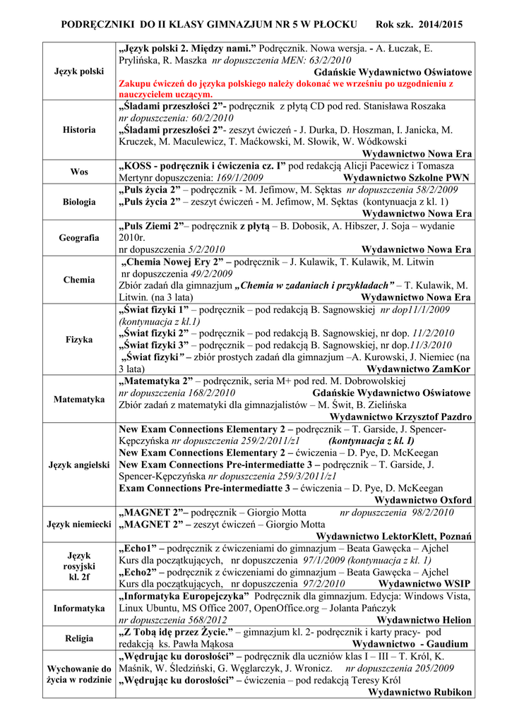 PODRĘCZNIKI DO II KLASY GIMNAZJUM NR 5 W PŁOCKU Język polski Rok szk. 2014/2015 „Język polski 2. Między nami.” Podręcznik. Nowa wersja. - A. Łuczak, E. Prylińska, R. Maszka nr dopuszczenia MEN: 63/2/2010 Gdańskie Wydawnictwo Oświatowe Zakupu ćwiczeń do języka polskiego należy dokonać we wrześniu po uzgodnieniu z nauczycielem uczącym. Historia Wos Biologia Geografia Chemia Fizyka Matematyka Język angielski Język niemiecki Język rosyjski kl. 2f Informatyka Religia Wychowanie do życia w rodzinie „Śladami przeszłości 2”- podręcznik z płytą CD pod red. Stanisława Roszaka nr dopuszczenia: 60/2/2010 „Śladami przeszłości 2”- zeszyt ćwiczeń - J. Durka, D. Hoszman, I. Janicka, M. Kruczek, M. Maculewicz, T. Maćkowski, M. Słowik, W. Wódkowski Wydawnictwo Nowa Era „KOSS - podręcznik i ćwiczenia cz. I” pod redakcją Alicji Pacewicz i Tomasza Mertynr dopuszczenia: 169/1/2009 Wydawnictwo Szkolne PWN „Puls życia 2” – podręcznik - M. Jefimow, M. Sęktas nr dopuszczenia 58/2/2009 „Puls życia 2” – zeszyt ćwiczeń - M. Jefimow, M. Sęktas (kontynuacja z kl. 1) Wydawnictwo Nowa Era „Puls Ziemi 2”– podręcznik z płytą – B. Dobosik, A. Hibszer, J. Soja – wydanie 2010r. nr dopuszczenia 5/2/2010 Wydawnictwo Nowa Era „Chemia Nowej Ery 2” – podręcznik – J. Kulawik, T. Kulawik, M. Litwin nr dopuszczenia 49/2/2009 Zbiór zadań dla gimnazjum „Chemia w zadaniach i przykładach” – T. Kulawik, M. Litwin. (na 3 lata) Wydawnictwo Nowa Era „Świat fizyki 1” – podręcznik – pod redakcją B. Sagnowskiej nr dop11/1/2009 (kontynuacja z kl.1) „Świat fizyki 2” – podręcznik – pod redakcją B. Sagnowskiej, nr dop. 11/2/2010 „Świat fizyki 3” – podręcznik – pod redakcją B. Sagnowskiej, nr dop.11/3/2010 „Świat fizyki” – zbiór prostych zadań dla gimnazjum –A. Kurowski, J. Niemiec (na 3 lata) Wydawnictwo ZamKor „Matematyka 2” – podręcznik, seria M+ pod red. M. Dobrowolskiej nr dopuszczenia 168/2/2010 Gdańskie Wydawnictwo Oświatowe Zbiór zadań z matematyki dla gimnazjalistów – M. Świt, B. Zielińska Wydawnictwo Krzysztof Pazdro New Exam Connections Elementary 2 – podręcznik – T. Garside, J. SpencerKępczyńska nr dopuszczenia 259/2/2011/z1 (kontynuacja z kl. I) New Exam Connections Elementary 2 – ćwiczenia – D. Pye, D. McKeegan New Exam Connections Pre-intermediatte 3 – podręcznik – T. Garside, J. Spencer-Kępczyńska nr dopuszczenia 259/3/2011/z1 Exam Connections Pre-intermediatte 3 – ćwiczenia – D. Pye, D. McKeegan Wydawnictwo Oxford „MAGNET 2”– podręcznik – Giorgio Motta nr dopuszczenia 98/2/2010 „MAGNET 2” – zeszyt ćwiczeń – Giorgio Motta Wydawnictwo LektorKlett, Poznań „Echo1” – podręcznik z ćwiczeniami do gimnazjum – Beata Gawęcka – Ajchel Kurs dla początkujących, nr dopuszczenia 97/1/2009 (kontynuacja z kl. 1) „Echo2” – podręcznik z ćwiczeniami do gimnazjum – Beata Gawęcka – Ajchel Kurs dla początkujących, nr dopuszczenia 97/2/2010 Wydawnictwo WSIP „Informatyka Europejczyka” Podręcznik dla gimnazjum. Edycja: Windows Vista, Linux Ubuntu, MS Office 2007, OpenOffice.org – Jolanta Pańczyk nr dopuszczenia 568/2012 Wydawnictwo Helion „Z Tobą idę przez Życie.” – gimnazjum kl. 2- podręcznik i karty pracy- pod redakcją ks. Pawła Mąkosa Wydawnictwo - Gaudium „Wędrując ku dorosłości” – podręcznik dla uczniów klas I – III – T. Król, K. Maśnik, W. Śledziński, G. Węglarczyk, J. Wronicz. nr dopuszczenia 205/2009 „Wędrując ku dorosłości” – ćwiczenia – pod redakcją Teresy Król Wydawnictwo Rubikon