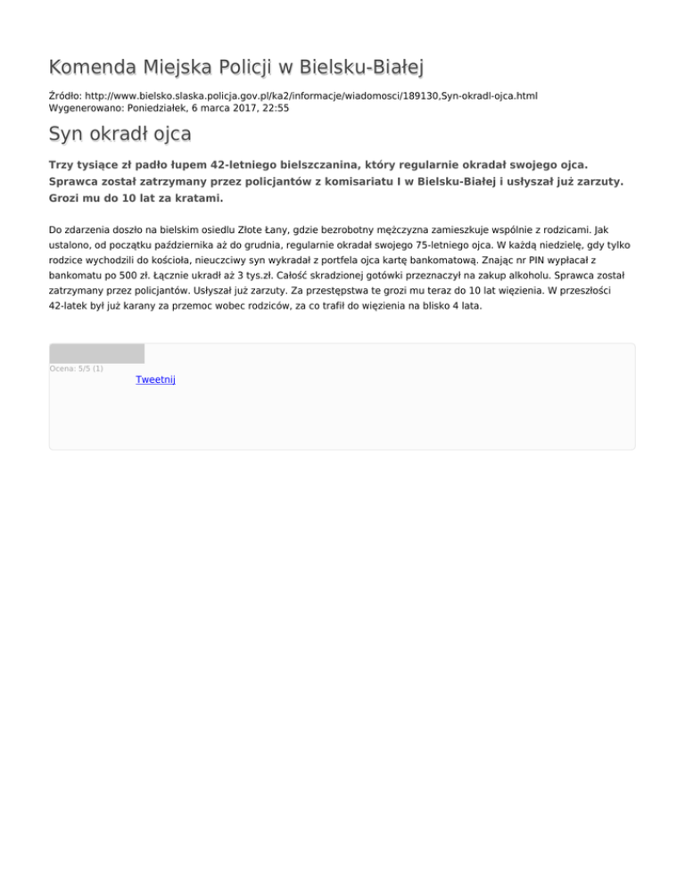 Komenda Miejska Policji w Bielsku-Białej Źródło: http://www.bielsko.slaska.policja.gov.pl/ka2/informacje/wiadomosci/189130,Syn-okradl-ojca.html Wygenerowano: Poniedziałek, 6 marca 2017, 22:55 Syn okradł ojca Trzy tysiące zł padło łupem 42-letniego bielszczanina, który regularnie okradał swojego ojca. Sprawca został zatrzymany przez policjantów z komisariatu I w Bielsku-Białej i usłyszał już zarzuty. Grozi mu do 10 lat za kratami. Do zdarzenia doszło na bielskim osiedlu Złote Łany, gdzie bezrobotny mężczyzna zamieszkuje wspólnie z rodzicami. Jak ustalono, od początku października aż do grudnia, regularnie okradał swojego 75-letniego ojca. W każdą niedzielę, gdy tylko rodzice wychodzili do kościoła, nieuczciwy syn wykradał z portfela ojca kartę bankomatową. Znając nr PIN wypłacał z bankomatu po 500 zł. Łącznie ukradł aż 3 tys.zł. Całość skradzionej gotówki przeznaczył na zakup alkoholu. Sprawca został zatrzymany przez policjantów. Usłyszał już zarzuty. Za przestępstwa te grozi mu teraz do 10 lat więzienia. W przeszłości 42-latek był już karany za przemoc wobec rodziców, za co trafił do więzienia na blisko 4 lata. Ocena: 5/5 (1) Tweetnij
