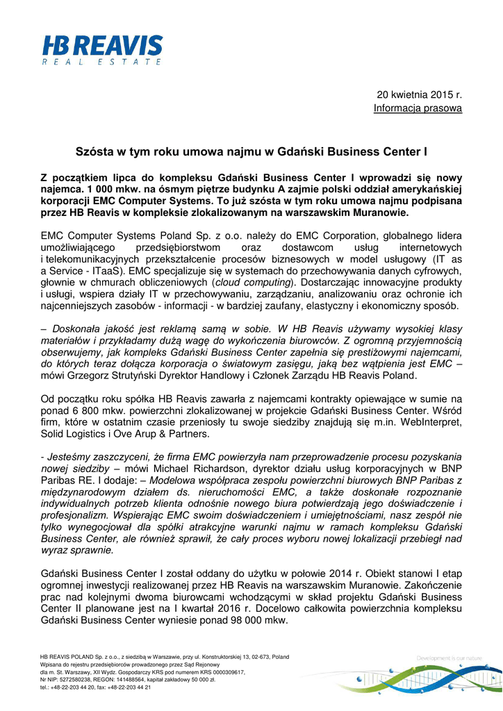 20 kwietnia 2015 r. Informacja prasowa Szósta w tym roku umowa najmu w Gdański Business Center I Z początkiem lipca do kompleksu Gdański Business Center I wprowadzi się nowy najemca. 1 000 mkw. na ósmym piętrze budynku A zajmie polski oddział amerykańskiej korporacji EMC Computer Systems. To już szósta w tym roku umowa najmu podpisana przez HB Reavis w kompleksie zlokalizowanym na warszawskim Muranowie. EMC Computer Systems Poland Sp. z o.o. należy do EMC Corporation, globalnego lidera umożliwiającego przedsiębiorstwom oraz dostawcom usług internetowych i telekomunikacyjnych przekształcenie procesów biznesowych w model usługowy (IT as a Service - ITaaS). EMC specjalizuje się w systemach do przechowywania danych cyfrowych, głownie w chmurach obliczeniowych (cloud computing). Dostarczając innowacyjne produkty i usługi, wspiera działy IT w przechowywaniu, zarządzaniu, analizowaniu oraz ochronie ich najcenniejszych zasobów - informacji - w bardziej zaufany, elastyczny i ekonomiczny sposób. – Doskonała jakość jest reklamą samą w sobie. W HB Reavis używamy wysokiej klasy materiałów i przykładamy dużą wagę do wykończenia biurowców. Z ogromną przyjemnością obserwujemy, jak kompleks Gdański Business Center zapełnia się prestiżowymi najemcami, do których teraz dołącza korporacja o światowym zasięgu, jaką bez wątpienia jest EMC – mówi Grzegorz Strutyński Dyrektor Handlowy i Członek Zarządu HB Reavis Poland. Od początku roku spółka HB Reavis zawarła z najemcami kontrakty opiewające w sumie na ponad 6 800 mkw. powierzchni zlokalizowanej w projekcie Gdański Business Center. W ród firm, które w ostatnim czasie przeniosły tu swoje siedziby znajdują się m.in. WebInterpret, Solid Logistics i Ove Arup & Partners. - Jesteśmy zaszczyceni, że firma EMC powierzyła nam przeprowadzenie procesu pozyskania nowej siedziby – mówi Michael Richardson, dyrektor działu usług korporacyjnych w BNP Paribas RE. I dodaje: – Modelowa współpraca zespołu powierzchni biurowych BNP Paribas z międzynarodowym działem ds. nieruchomości EMC, a także doskonałe rozpoznanie indywidualnych potrzeb klienta odnośnie nowego biura potwierdzają jego doświadczenie i profesjonalizm. Wspierając EMC swoim doświadczeniem i umiejętnościami, nasz zespół nie tylko wynegocjował dla spółki atrakcyjne warunki najmu w ramach kompleksu Gdański Business Center, ale również sprawił, że cały proces wyboru nowej lokalizacji przebiegł nad wyraz sprawnie. Gdański Business Center I został oddany do użytku w połowie 2014 r. Obiekt stanowi I etap ogromnej inwestycji realizowanej przez HB Reavis na warszawskim Muranowie. Zakończenie prac nad kolejnymi dwoma biurowcami wchodzącymi w skład projektu Gdański Business Center II planowane jest na I kwartał 2016 r. Docelowo całkowita powierzchnia kompleksu Gdański Business Center wyniesie ponad 98 000 mkw. HB REAVIS POLAND Sp. z o.o., z siedzibą w Warszawie, przy ul. Konstruktorskiej 13, 02-673, Poland Wpisana do rejestru przedsiębiorców prowadzonego przez Sąd Rejonowy dla m. St. Warszawy, XII Wydz. Gospodarczy KRS pod numerem KRS 0000309617, Nr NIPŚ 5272580238, REGONŚ 141488564, kapitał zakładowy 50 000 zł. tel.: +48-22-203 44 20, fax: +48-22-203 44 21 www.hbreavis.com O grupie HB Reavis HB Reavis to międzynarodowa grupa deweloperska założona w 1993 roku w Bratysławie, działająca na kluczowych rynkach Europy rodkowo-Wschodniej (Polska, Czechy, Słowacja, Węgry) oraz w Wielkiej Brytanii i Turcji. Dotychczas grupa zrealizowała 750 000 mkw. nowoczesnej powierzchni biurowej, handloworozrywkowej i logistycznej, a kolejny 1 milion mkw. znajduje się obecnie w realizacji lub w procesach przygotowawczych. HB Reavis wykorzystuje zintegrowany model biznesu, który obejmuje działania deweloperskie i wykonawcze oraz zarządzanie majątkiem i inwestycjami. W całej Europie Grupa zatrudnia ponad 400 osób oraz dysponuje aktywami w wysoko ci 1,58 miliarda euro, o warto ci netto na poziomie 917 milionów euro, co zapewnia jej silną pozycję rynkową. Więcej informacji znajduje się na stronie internetowej http://www.hbreavis.com. Informacje dla mediów: Monika Kalinowska PR Manager HB Reavis E-mail: [email protected] Kom.: +48 696 803 116 Magdalena Sobota Account Manager Grayling E-mail: [email protected] Kom.: +48 609 099 041 HB REAVIS POLAND Sp. z o.o., z siedzibą w Warszawie, przy ul. Konstruktorskiej 13, 02-673, Poland Wpisana do rejestru przedsiębiorców prowadzonego przez Sąd Rejonowy dla m. St. Warszawy, XII Wydz. Gospodarczy KRS pod numerem KRS 0000309617, Nr NIPŚ 5272580238, REGONŚ 141488564, kapitał zakładowy 50 000 zł. tel.: +48-22-203 44 20, fax: +48-22-203 44 21 www.hbreavis.com