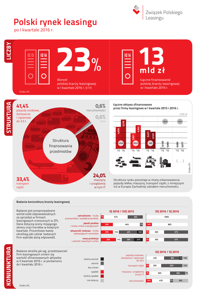 Polski rynek leasingu LICZBY po I kwartale 2016 r. IQ’I5 IQ’I6 23% 13 IQ’I6 mld zł Łączne finansowanie polskiej branży leasingowej w I kwartale 2016 r. Wzrost polskiej branży leasingowej w I kwartale 2016 r. (r/r) 0,6% nieruchomości mld zł 0,6% -55,4% +52,3% -8,8% '15 '16 '15 '16 '15 '16 '15 '16 0,077 0,185 +33,6% '15 '16 Źródło: ZPL 24,0% maszyny i urządzenia w tym IT transport ciężki -9,2% 3,123 2,851 Struktura finansowania przedmiotów 33,4% 3,423 4,342 5,378 inne 0,085 pojazdy osobowe, dostawcze i ciężarowe do 3 5 t Łączne aktywa sfinansowane przez firmy leasingowe w I kwartale 2015 i 2016 r. 0,083 41,4% 4,026 STRUKTURA Źródło: ZPL Struktura rynku pozostaje w miarę zrównoważona: pojazdy lekkie, maszyny, transport ciężki, z mniejszym niż w Europie Zachodniej udziałem nieruchomości. Badania koniunktury branży leasingowej KONIUNKTURA Badanie jest przeprowadzane wśród osób odpowiedzialnych za sprzedaż w firmach leasingowych zrzeszonych w ZPL. Dane dotyczą oceny mijającego okresu oraz trendów w kolejnym kwartale. Procentowe kwoty określają jaki udział badanych firm wybrało daną odpowiedź. IQ 2016 / IVQ 2015 zatrudnienie – liczba pracowników i współpracowników Badanie określa jak wg. przedstawicieli firm leasingowych zmieni się wartość sfinansowanych aktywów w II kwartale 2016 r. w porównaniu do I kwartału 2016 r. 57% jakość portfela – liczba umów rozwiązanych 29% aktywność rynkowa – liczba wpływających wniosków 29% nowa produkcja – wartość zawartych umów istotny wzrost wzrost bez zmian spadek istotny spadek nie dotyczy Źródło: ZPL 7% 36% IIQ 2016 / IQ 2016 36% 100% 64% 14% 14% 7% 43% 29% 14% 21% 14% 7% 36% 57% 7% 36% 57% IIQ 2016 / IQ 2016 pojazdy osobowe, dostawcze i ciężarowe do 3,5 t transport ciężki 7% maszyny i urządzenia w tym IT 7% nieruchomości 86% 14% 43% 36% 7% 14% 29% 50% 14% 50% 43% 36% 7% 36% 7%