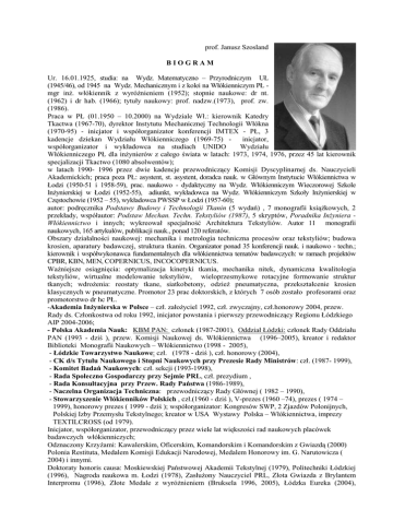 prof. Janusz Szosland BIOGRAM Ur. 16.01.1925, studia: na Wydz. Matematyczno – Przyrodniczym UŁ (1945/46), od 1945 na Wydz. Mechanicznym i z kolei na Włókienniczym PŁ mgr inŜ. włókiennik z wyróŜnieniem (1952); stopnie naukowe: dr nt. (1962) i dr hab. (1966); tytuły naukowy: prof. nadzw.(1973), prof. zw. (1986). Praca w PŁ (01.1950 – 10.2000) na Wydziale Wł.: kierownik Katedry Tkactwa (1967-70), dyrektor Instytutu Mechanicznej Technologii Włókna (1970-95) - inicjator i współorganizator konferencji IMTEX - PŁ, 3 kadencje dziekan Wydziału Włókienniczego (1969-75) inicjator, współorganizator i wykładowca na studiach UNIDO Wydziału Włókienniczego PŁ dla inŜynierów z całego świata w latach: 1973, 1974, 1976, przez 45 lat kierownik specjalizacji Tkactwo (1080 absolwentów); w latach 1990- 1996 przez dwie kadencje przewodniczący Komisji Dyscyplinarnej ds. Nauczycieli Akademickich; praca poza PŁ: asystent, st. asystent, doradca nauk. w Głównym Instytucie Włókiennictwa w Łodzi (1950-51 i 1958-59), prac. naukowo - dydaktyczny na Wydz. Włókienniczym Wieczorowej Szkole InŜynierskiej w Łodzi (1952-55), adiunkt, wykładowca na Wydz. Włókienniczym Szkoły InŜynierskiej w Częstochowie (1952 – 55), wykładowca PWSSP w Łodzi (1957-60); autor: podręcznika Podstawy Budowy i Technologii Tkanin (5 wydań) , 7 monografii ksiąŜkowych, 2 przekłady, współautor: Podstaw Mechan. Techn. Tekstyliów (1987), 5 skryptów, Poradnika InŜyniera Włókiennictwo i innych; wykreował specjalność Architektura Tekstyliów. Autor 11 monografii naukowych, 165 artykułów, publikacji nauk., ponad 120 referatów. Obszary działalności naukowej: mechanika i metrologia techniczna procesów oraz tekstyliów; budowa krosien, aparatury badawczej, struktura tkanin. Organizator ponad 35 konferencji nauk. i naukowo - techn.; kierownik i współwykonawca fundamentalnych dla włókiennictwa tematów badawczych: w ramach projektów CPBR, KBN, MEN, COPERNICUS, INCOCOPERNICUS. WaŜniejsze osiągnięcia: optymalizacja kinetyki tkania, mechanika nitek, dynamiczna kwalitologia tekstyliów, wirtualne modelowanie tekstyliów, wieloprzesmykowe rotacyjne formowanie struktur tkanych; wdroŜenia: reostaty tkane, siatkobetony, odzieŜ pneumatyczna, przekształcenie krosien klasycznych w pneumatyczne. Promotor 23 prac doktorskich, z których 7 osób zostało profesorami oraz promotorstwo dr hc PŁ. -Akademia InŜynierska w Polsce – czł. załoŜyciel 1992, czł. zwyczajny, czł.honorowy 2004, przew. Rady ds. Członkostwa od roku 1992, inicjator powstania i pierwszy przewodniczący Regionu Łódzkiego AIP 2004-2006; - Polska Akademia Nauk: KBM PAN: członek (1987-2001), Oddział Łódzki: członek Rady Oddziału PAN (1993 - dziś ), przew. Komisji Naukowej ds. Włókiennictwa (1996–2005), kreator i redaktor Biblioteki Monografii Naukowych – Włókiennictwo (1998 - 2005), - Łódzkie Towarzystwo Naukowe: czł. (1978 - dziś ), czł. honorowy (2004), - CK d/s Tytułu Naukowego i Stopni Naukowych przy Prezesie Rady Ministrów: czł. (1987- 1999), - Komitet Badań Naukowych: czł. sekcji (1993-1998), - Rada Społeczno Gospodarczy przy Sejmie PRL, czł. prezydium , - Rada Konsultacyjna przy Przew. Rady Państwa (1986-1989), - Naczelna Organizacja Techniczna: przewodniczący Rady Głównej ( 1982 – 1990), - Stowarzyszenie Włókienników Polskich , czł.(1960 - dziś ), V-prezes (1960 –74), prezes ( 1974 – 1999), honorowy prezes ( 1999 - dziś ); współorganizator: Kongresów SWP, 2 Zjazdów Polonijnych, Polskiej Izby Przemysłu Tekstylnego; kreator w USA Wystawy Polska – Włókiennictwa, imprezy TEXTILCROSS (od 1979). Inicjator, współorganizator, przewodniczący przez wiele lat większości rad naukowych placówek badawczych włókienniczych; Odznaczony KrzyŜami: Kawalerskim, Oficerskim, Komandorskim i Komandorskim z Gwiazdą (2000) Polonia Restituta, Medalem Komisji Edukacji Narodowej, Medalem Honorowy im. G. Narutowicza ( 2004) i innymi. Doktoraty honoris causa: Moskiewskiej Państwowej Akademii Tekstylnej (1979), Politechniki Łódzkiej (1996), Nagroda naukowa m. Łodzi (1978), ZasłuŜony Nauczyciel PRL, Złota Gwiazda z Brylantem Interpromu (1996), Złote Medale z wyróŜnieniem (Bruksela 1996, 2005), Łódzka Eureka (2004), Odznaki Honorowe w tym: m. Łodzi, ZasłuŜony dla PŁ, 7 Nagród Ministra Szkolnictwa WyŜszego.