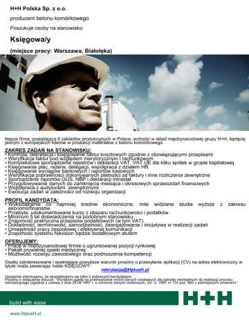 H+H Polska Sp. z o.o. producent betonu komórkowego Poszukuje osoby na stanowisko: Księgowa/y (miejsce pracy: Warszawa, Białołęka) Nasza firma, posiadająca 6 zakładów produkcyjnych w Polsce, wchodzi w skład międzynarodowej grupy H+H, będącej jednym z europejskich liderów w produkcji materiałów z betonu komórkowego. ZAKRES ZADAŃ NA STANOWISKU: • Kontrola, dekretacja i księgowanie faktur kosztowych zgodnie z obowiązującymi przepisami • Weryfikacja faktur pod względem merytorycznym i rachunkowym • Kompleksowe sporządzanie rejestrów i deklaracji VAT, VAT UE dla kilku spółek w grupie kapitałowej • Księgowanie płac, rezerw, delegacji, współpraca z działem HR • Księgowanie wyciągów bankowych i raportów kasowych • Weryfikacja poprawności dokonywanych płatności za faktury i inne rozliczenia zewnętrzne • Sporządzanie raportów GUS, NBP i deklaracji Intrastat • Przygotowywanie danych do zamknięcia miesiąca i okresowych sprawozdań finansowych • Współpraca z audytorami zewnętrznymi • Ewolucja zadań w zależności od rozwoju organizacji PROFIL KANDYDATA: • Wykształcenie co najmniej średnie ekonomiczne, mile widziane studia wyższe ekonomii/finansów • Przebyte, udokumentowane kursy z obszaru rachunkowości i podatków • Minimum 5 lat doświadczenia na podobnym stanowisku • Znajomość praktyczna przepisów podatkowych (w tym VAT) • Dokładność, terminowość, samodzielność, zaangażowanie i inicjatywa w realizacji zadań • Umiejętność pracy zespołowej i efektywnej komunikacji • Znajomość systemu Navision będzie dodatkowym atutem z zakresu OFERUJEMY: • Pracę w międzynarodowej firmie o ugruntowanej pozycji rynkowej • Pakiet prywatnej opieki medycznej • Możliwość rozwoju zawodowego oraz podnoszenia kompetencji Osoby zainteresowane i spełniające powyższe warunki prosimy o przesyłanie aplikacji (CV) na adres elektroniczny w tytule maila zawierając hasło KSIĘGOWY: [email protected] Uprzejmie informujemy, że skontaktujemy się tylko z wybranymi kandydatami. Prosimy o dołączenie klauzuli: "Wyrażam zgodę na przetwarzanie moich danych osobowych dla potrzeb niezbędnych do realizacji procesu rekrutacyjnego (zgodnie z ustawą z dnia 29.08.1997 r. o ochronie danych osobowych, Dz. U. 1997 nr 133 poz. 883 z późniejszymi zmianami." build with ease www.HplusH.pl