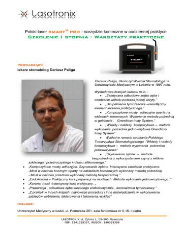 Polski laser SMARTM PRO - narzędzie konieczne w codziennej praktyce Szkolenie I stopnia - Warsztaty praktyczne Prowadzący: lekarz stomatolog Dariusz Paliga Dariusz Paliga, Ukończył Wydział Stomatologii na Uniwersytecie Medycznym w Lublinie w 1997 roku. Wykładowca licznych kursów m.in. : „Estetyczna odbudowa zrębu zęba i osadzenie wkładu podczas jednej wizyty.” „Uzupełnienia tymczasowe –nieodłączny element leczenia protetycznego.” „Kompozytowe mosty adhezyjne oparte na wkładach koronowych. Wykonanie metodą pośrednią w gabinecie . Grandioso Inlay System.” „Wkłady i nakłady kompozytowe – metoda wykonania pośrednia jednowizytowa.Grandioso Inlay System” Wykład w ramach spotkania Polskiego Towarzystwa Stomatologicznego :”Wkłady i nakłady kompozytowe – metoda wykonania pośrednia jednowizytowa” „Szynowanie zębów – metoda bezpośrednia z wykorzystaniem szyny z włókna szklanego i przeźroczystego indeksu silikonowego.” „Kompozytowe mosty adhezyjne. Szynowanie zębów. Intensywne szkolenie praktyczne: -Most w odcinku bocznym oparty na nakładach koronowych wykonany metodą pośrednią. - Most w odcinku przednim wykonany metodą bezpośrednią.” „Endokorona – Praktyczny kurs preparacji na modelach. Metoda wykonania jednowizytowego .” „Korona, most -intensywny kurs praktyczny. „ „Preparacja , odbudowa zęba leczonego endodontycznie , korona/most tymczasowy.” „Z praktyk w innych krajach: najnowsze procedury i inne doświadczenia w wykonywaniu zabiegów wybielania, lakierowania i lakowania.-wykład” miejsce: Uniwersytet Medyczny w Łodzi, ul. Pomorska 251, sala fantomowa nr 0.15, I piętro LASOTRONIX ul. Żytnia 1, 05-500 Piaseczno NIP: 5341265357, REGON: 140055389 Wstęp teoretyczny (2 godziny) 1. Zasady użytkowania lasera. Dlaczego jest to proste? 2. Zimne lasery w codziennej praktyce: kiedy biostymulacja, a kiedy fotoaktywna dezynfekcja? 3. Zastosowanie lasera w codziennej praktyce stomatologicznej: stomatologia zachowawcza protetyka chirurgia i biostymulacja – duet doskonały periodontologia i endodoncja – termiczna i chemiczna dezynfekcja laserowa wybielanie 3. Zabiegi dla higienistki, czyli jak się odciążyć w pracy. 4. Przeciwwskazania do zabiegów laserowych, uwagi końcowe. przerwa kawowa Część praktyczna (4 godziny) Praca na modelach symulujących warunki jamy ustnej. Uczestnicy wykonają: 1. zabiegi proste /codzienne: wycięcie dziąsła przy ubytku klasy II, III, V odsłonięcie trzeciego trzonowca korona zęba - usunięcie nadmiaru dziąsła endodoncja - sterylizacja kanału korzeniowego 2. zabiegi trudniejsze /codzienne: wydłużenie korony klinicznej przy złamaniu przedtrzonowca odsłonięcie korzenia pod wkład 3. zabiegi trudniejsze /rzadsze: licówka - korekty dziąsła przy przeroście - ząb cofnięty w łuku 4. Biostymulacja po zabiegach chirurgicznych oraz codzienne zabiegi regeneracyjne i przeciwbólowe. Ćwiczenie zdobytych umiejętności na preparatach zwierzęcych. Uczestnicy kursu będą mieli możliwość zastosowania lasera na tkankach miękkich pod okiem instruktora. LASOTRONIX ul. Żytnia 1, 05-500 Piaseczno NIP: 5341265357, REGON: 140055389 Warsztaty praktyczne z lasera SMARTM PRO to szkolenie dla wszystkich którzy: Mają problem z ,,krwawiącymi ubytkami" klasy II, III, V i muszą przenosić z tego powodu pacjenta na kolejną wizytę. Często nie mają gdzie umieścić nici retrakcyjnej przy filarze protetycznym i tracą masę wyciskową i czas na kolejne nieudane wyciski protetyczne. Nie wiedzą jak rozwiązać problem złamanych poddziąsłowo zębów i korzeni. Praca polskim laserem SMARTM PRO jest dla wszystkich tych, którzy chcą upraszczać swoją pracę i jednocześnie czynić ją pewniejszą i skuteczniejszą. Liczba miejsc ograniczona. Koszt warsztatów: 750 zł/os. Raiffeisen Polbank Bank Warsaw PL 29 1750 0009 0000 0000 2063 7293 Płatność z dopiskiem: Imię Nazwisko Warsztaty Laserowe Zapisy na szkolenie przyjmują bezpośrednio nasi Regionalni Przedstawiciele Medyczni: LASOTRONIX ul. Żytnia 1, 05-500 Piaseczno NIP: 5341265357, REGON: 140055389