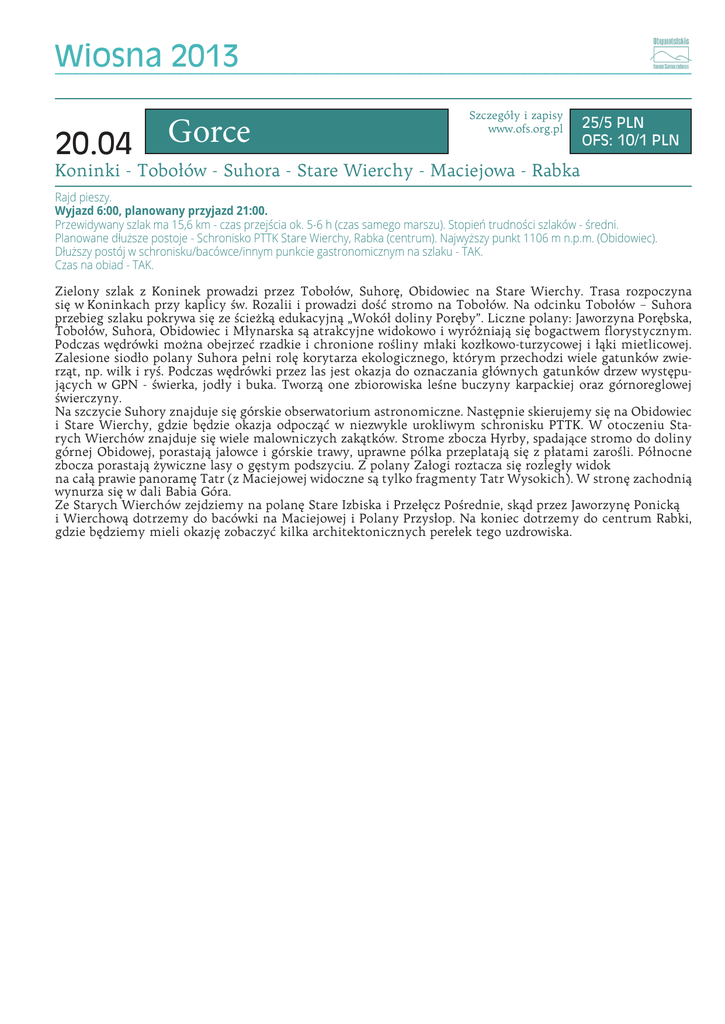 Wiosna 2013 _____________________________________________________________ 20.04 Gorce Szczegóły i zapisy www.ofs.org.pl 25/5 PLN OFS: 10/1 PLN Koninki - Tobołów - Suhora - Stare Wierchy - Maciejowa - Rabka Rajd pieszy. Wyjazd 6:00, planowany przyjazd 21:00. Przewidywany szlak ma 15,6 km - czas przejścia ok. 5-6 h (czas samego marszu). Stopień trudności szlaków - średni. Planowane dłuższe postoje - Schronisko PTTK Stare Wierchy, Rabka (centrum). Najwyższy punkt 1106 m n.p.m. (Obidowiec). Dłuższy postój w schronisku/bacówce/innym punkcie gastronomicznym na szlaku - TAK. Czas na obiad - TAK. Zielony szlak z Koninek prowadzi przez Tobołów, Suhorę, Obidowiec na Stare Wierchy. Trasa rozpoczyna się w Koninkach przy kaplicy św. Rozalii i prowadzi dość stromo na Tobołów. Na odcinku Tobołów – Suhora przebieg szlaku pokrywa się ze ścieżką edukacyjną „Wokół doliny Poręby”. Liczne polany: Jaworzyna Porębska, Tobołów, Suhora, Obidowiec i Młynarska są atrakcyjne widokowo i wyróżniają się bogactwem florystycznym. Podczas wędrówki można obejrzeć rzadkie i chronione rośliny młaki kozłkowo-turzycowej i łąki mietlicowej. Zalesione siodło polany Suhora pełni rolę korytarza ekologicznego, którym przechodzi wiele gatunków zwierząt, np. wilk i ryś. Podczas wędrówki przez las jest okazja do oznaczania głównych gatunków drzew występujących w GPN - świerka, jodły i buka. Tworzą one zbiorowiska leśne buczyny karpackiej oraz górnoreglowej świerczyny. Na szczycie Suhory znajduje się górskie obserwatorium astronomiczne. Następnie skierujemy się na Obidowiec i Stare Wierchy, gdzie będzie okazja odpocząć w niezwykle urokliwym schronisku PTTK. W otoczeniu Starych Wierchów znajduje się wiele malowniczych zakątków. Strome zbocza Hyrby, spadające stromo do doliny górnej Obidowej, porastają jałowce i górskie trawy, uprawne pólka przeplatają się z płatami zarośli. Północne zbocza porastają żywiczne lasy o gęstym podszyciu. Z polany Załogi roztacza się rozległy widok na całą prawie panoramę Tatr (z Maciejowej widoczne są tylko fragmenty Tatr Wysokich). W stronę zachodnią wynurza się w dali Babia Góra. Ze Starych Wierchów zejdziemy na polanę Stare Izbiska i Przełęcz Pośrednie, skąd przez Jaworzynę Ponicką i Wierchową dotrzemy do bacówki na Maciejowej i Polany Przysłop. Na koniec dotrzemy do centrum Rabki, gdzie będziemy mieli okazję zobaczyć kilka architektonicznych perełek tego uzdrowiska. 11.05 Beskid Żywiecki Szczegóły i zapisy www.ofs.org.pl 25/5 PLN OFS: 10/1 PLN Przełęcz Krowiarki - Polica - Hala Śmietanowa - Hala Krupowa - Zawoja Rajd pieszy. Wyjazd 8:00, planowany przyjazd 20:00. Przewidywany szlak ma ok. 6-7 h (czas samego marszu). Stopień trudności szlaków - średni. Planowane dłuższe postoje - Schronisko PTTK Hala Krupowa, Zawoja (centrum). Dłuższy postój w schronisku/bacówce/innym punkcie gastronomicznym na szlaku - TAK. Czas na obiad - TAK. Znaki prowadzące z Przełęczy Krowiarki (Przełęczy Lipnickiej), pną się od razu stromo, po schodkach w skarpie na pierwsze wzniesienie Pasma Policy - Wyżni Syhlec (1121 m). Potem trakt wyrównuje się i łagodnie pokonuje kolejne odcinki. Szlak cały czas wiedzie lasem, z rzadka odsłaniając widoki na Babią Górę lub Policę. Po pokonaniu Wyżnego Syhlca, którego szczyt poznasz po obszernym, płaskim terenie, szlak wspina się na Broskę (1236 m), obchodzi ją łukiem i kieruje w stronę Hali Śmietanowej (Kiczorki, 1298 m). Odcinek ten jest łagodniejszy; większego wysiłku wymaga dopiero na ostatnim fragmencie. Ze szczytu Kiczorki w kierunku zachodnim rozciąga się ciekawy widok na Pasmo Jałowieckie i dolinę Skawicy oraz odległe wzniesienia Beskidu Małego. Z Hali Śmietanowej można podziwiać Babią Górę. Znaki czerwone skręcają w prawo, w stronę Policy. Wierzchołek osiąga się po 45 minutach. Dociera tu również szlak niebieski, łączący Pasmo Policy z Pasmem Orawsko - Podhalańskim i Gorcami. Stąd już tylko ok. 20 minut do węzła szlaków turystycznych przy schronisku PTTK na Hali Krupowej, gdzie będzie czas na odpoczynek. Po odpoczynku zejdziemy do Zawoi, przez Kucałowską Halę ku Złotej Grapie, którą omija północnym zboczem. Następnie szlak wiedzie stromo opadającym grzbietem Policy, porośniętym gęstym lasem świerkowym, na Spalenicę i Jaworzynę z licznymi szałasami pasterskimi, skąd między polami uprawnymi i pastwiskami schodzi się stromo w dół do centrum Zawoi.