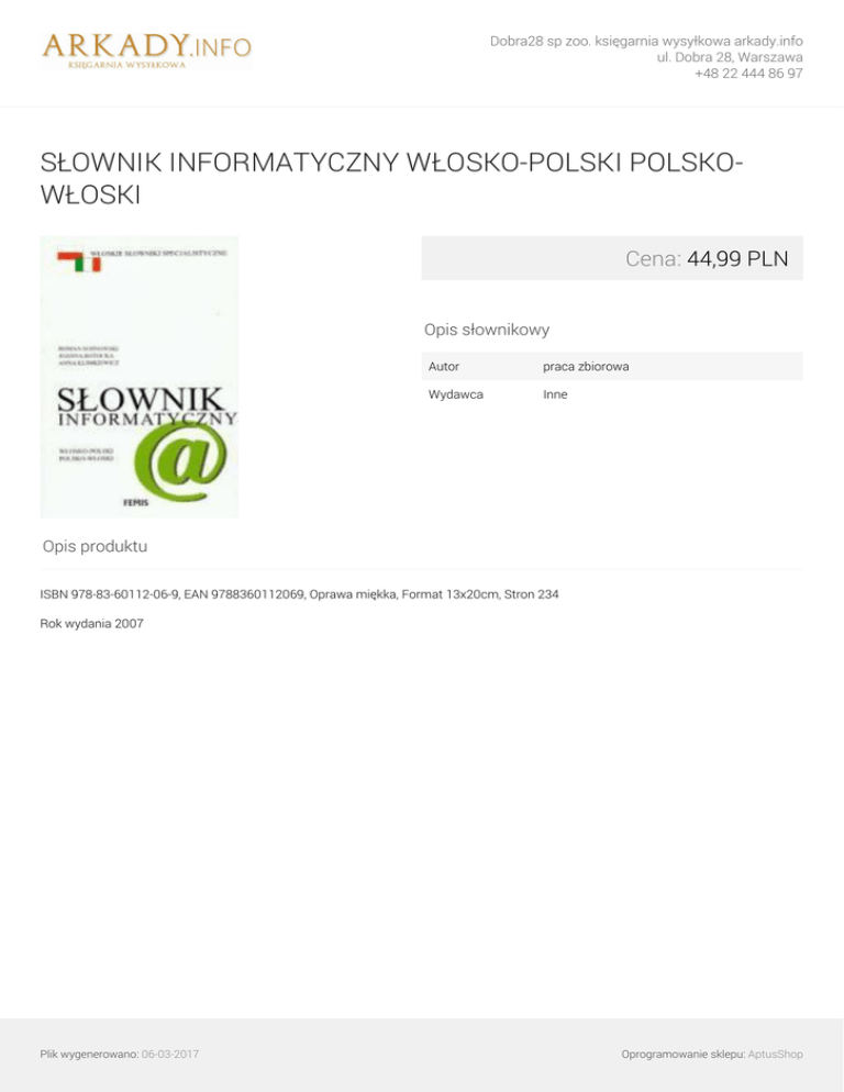 Dobra28 sp zoo. księgarnia wysyłkowa arkady.info ul. Dobra 28, Warszawa +48 22 444 86 97 SŁOWNIK INFORMATYCZNY WŁOSKO-POLSKI POLSKOWŁOSKI Cena: 44,99 PLN Opis słownikowy Autor praca zbiorowa Wydawca Inne Opis produktu ISBN 978-83-60112-06-9, EAN 9788360112069, Oprawa miękka, Format 13x20cm, Stron 234 Rok wydania 2007 Plik wygenerowano: 06-03-2017 Powered by TCPDF (www.tcpdf.org) Oprogramowanie sklepu: AptusShop