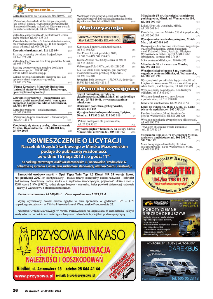 Ogłoszenia... Zatrudnię szewca na ½ etatu, tel. 501 510 987 (107) Zatrudnię do zakładu stolarskiego specjalistę ds. obsługi klienta. Wymagania: doświadczenie i znajomość branży stolarskiej. Oferty na e-mail: [email protected] , tel. 25 758 67 14 (108) Zatrudnię ekspedientkę do delikatesów Heman, Dębe Wielkie, tel. 604 535 086 (111) Zatrudnię hydraulika z 5- letnim doświadczeniem, mile widziane prawo jazdy kat. B, bez nałogów, praca od zaraz, tel. 606 758 230 (112) Zatrudnię brukarzy, tel. 516 123 934 (113) Przyjmę uczennicę do salonu fryzjerskiego, tel. 660 573 590 (114) Zatrudnię kierowcę na tira, kraj, plandeka, Mińsk, tel. 605 477 779 (115) Przyjmę do pracy młodą, uczciwą do sklepu alkoholowego, tel. 508 545 600, CV na adres: [email protected] (116) Zakład betoniarski zatrudni kierowcę kat. C z uprawnieniami na pompo – gruszkę, tel. 606 925 226 (117) Firma Kowalczyk Materiały Budowlane zatrudni stażystów do działu handlowego, [email protected] (118) Zatrudnię sprzedawcę – magazyniera używanych części samochodowych, wymagana znajomość komputera, Mińsk Mazowiecki, tel. 601 409 104 (119) Zatrudnię tynkarza – tynki agregatem, tel. 503 839 018 (120) Zatrudnię do prac remontowo – budowlanych, tel. 504 123 178 (121) Zaopiekuję się starszą osobą, tylko na terenie Mińska. Doświadczenie. Tel. 518 310 426, 25 799 20 53 (122) Możliwość współpracy dla osób ambitnych, przedsiębiorczych i potrafiących zarządzać sobą. Wysokie zarobki, tel. 600 652 889 (123) Motoryzacja Volkswagen NEW BEETLE CABRIO, stan bardzo dobry, tel. 608 410 762 LA Mam do wynajęcia na parkingu strzeżonym w Mińsku Mazowieckim ul. Warszawskie Przedmieście 32 odbędzie się sprzedaż z wolnej ręki, ruchomości stanowiącej własność Skarbu Państwa tj.: Samochód osobowy marki – Opel Tigra Twin Top 1.3 Diesel MR`05 wersja Sport, rok produkcji 2007, nr identyfikacyjny – trwale zatarty, nieczytelny, rodzaj nadwozia – kabriolet 2-drzwiowy 2-osobowy, rodzaj silnika – z zapłonem samoczynnym, pojemność silnika i moc – 1248 ccm / 51kW (69KM), rodzaj skrzyni biegów – manualna, kolor powłoki lakierniczej nadwozia – czarny 2-warstwowy z efektem metalicznym. Cena wywoławcza – 5.333,33 zł Wyżej wymieniony pojazd można oglądać w dniu sprzedaży w godzinach 1000 – 1100. na parkingu strzeżonym w Mińsku Mazowieckim ul. Warszawskie Przedmieście 32. Naczelnik Urzędu Skarbowego w Mińsku Mazowieckim nie odpowiada za uszkodzenia i ukryte wady w/w ruchomości oraz zastrzega sobie prawo odwołania licytacji bez podania przyczyny. Co słychać? - nr 19 (814) 2013 (154) mieszkanie dwupokojowe, Mińsk (167) Maz., tel. 662 008 842 Do wynajęcia komfortowe mieszkanie, trzypokojoKupię auta i motory, całe, uszkodzone, we, z osobną kuchnią, dużym balkonem, 2,5 l, 150 KM, benzyna, (23) tel. 510 492 525 tel. 608na 410 762 automat, 2009 r. ul. Dąbrówki, 60 m2, 3 pokoje, III piętro. Fiat Punto 1.8, rok produkcji 2000, Wyposażone w meble i sprzęt AGD. Ciche (25) tel. 502 616 419, 508 858 483 i przyjemne, kontakt: 501 716 287 (186) Toyota Avensis`97, 235 tys., cena 11 500 zł, M3 w centrum Mińska, tel. 518 044 575 (188) (26) tel. 515 083 891 Mieszkanie 56 m2 w centrum Mińska, Volkswagen Polo 1997 r., tel. 601 218 247 (28) tel. 796 781 953 (191) Kia Rio’ 2008, 1400, benzyna, gaz, pierwszy Wynajmę lokal usługowy 8 m2, wszystkie właściciel z salonu, przebieg 58 tys./km., wygody, w centrum Mińska, ul. Warszawska, (27) tel. 693 646 318 tel. 785 925 790 (193) Sprzedam koła do toyoty – 175/70 R14, do forda – Wynajmę lokal po zakładzie fryzjerskim, 80 m2, (28) 195/60 R14, tel. 695 429 117 I piętro, ul. Warszawska 97, vis a vis ZUS-u, przy Alior Banku, w dobrej cenie, tel. 602 230 929 (196) Wynajmę pokój na poddaszu, z oddzielnym wejściem, tel. 518 452 027 (197) Sprzęt budowlany, ogrodniczy, Wynajmę domek na wsi, umeblowany elektronarzędzia, Mińsk Maz., ul. Andriollego z podwórkiem, tel. 515 278 078 (201) 16, tel. 25 758 60 41, www.wypozyczalnia– minsk.com (1) Kawalerka umeblowana, tel. 25 758 60 54 (202) Osuszacze powietrza, glebogryzarka, Lokal do wynajęcia, 46 m2 i 63 m2, ul. Cicha (2) tel. 606 445 143 (vis a vis szpitala), tel. 502 295 208 (203) Wynajmę lokal usługowo-biurowy, I piętro, Pawilon handlowy, 35 m2, Stanisławów (4) 50 m2, ul. I PLM 5, tel. 515 046 018 przy ul. Warszawskiej, tel. 601 204 520 (204) Wynajmę mieszkanie dwupokojowe blisko stacji, Pokoje noclegowe dla pracowników, tel. 601 090 774 (205) (203) tel. 25 758 50 62 Wynajem chłodni na wesela i komunie, Wynajmę piętro w kamienicy na usługi, Mińsk tel. 25 759 13 55 (206) (523) Mazowiecki, centrum, tel. 608 410 762 Mieszkanie 4 pokoje, 72 m2, centrum Mińska, częściowo umeblowane, tel. 501 395 272, 509 716 192 (207) Mam do wynajęcia kawalerkę ok. 34 m2 (nieumeblowaną) na ul. Warszawskiej, MMz, tel. 606 958 128 (208) (116) Naczelnik Urzędu Skarbowego w Mińsku Mazowieckim podaje do publicznej wiadomości, że w dniu 16 maja 2013 r. o godz. 1100 26 (521) Kawalerka, centrum Mińska, 750 zł + prąd, woda, (136) tel. 502 360 005 TEM OBWIESZCZENIE O LICYTACJI Kwota oszacowania – 16.000,00 zł. Mieszkanie 55 m2, (kawalerka) z miejscem parkingowym, Mińsk, ul. Warszawska 114, tel. 602 797 469 Lokal 300 m2, do wynajęcia, Mińsk, tel. 509 241 141 Wynajmę IE DROŻSZY! BĘDZ