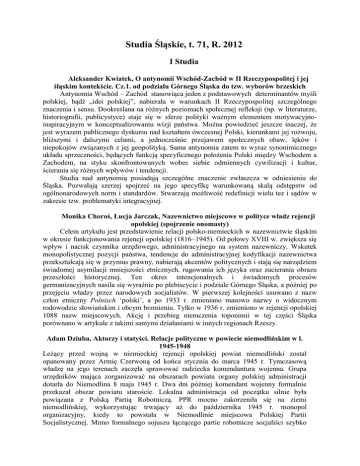 Studia Śląskie, t. 71, R. 2012 I Studia Aleksander Kwiatek, O antynomii Wschód-Zachód w II Rzeczypospolitej i jej śląskim kontekście. Cz.1. od podziału Górnego Śląska do tzw. wyborów brzeskich Antynomia Wschód – Zachód stanowiąca jeden z podstawowych determinantów myśli polskiej, bądź „idei polskiej”, nabierała w warunkach II Rzeczypospolitej szczególnego znaczenia i sensu. Dookreślana na różnych poziomach społecznej refleksji (np. w literaturze, historiografii, publicystyce) staje się w sferze polityki ważnym elementem motywacyjnoinspiracyjnym w konceptualizowaniu wizji państwa. Można powiedzieć jeszcze inaczej, że jest wyrazem publicznego dyskursu nad kształtem ówczesnej Polski, kierunkami jej rozwoju, bliższymi i dalszymi celami, a jednocześnie przejawem społecznych obaw, lęków i niepokojów związanych z jej geopolityką. Sama antynomia zatem to wyraz synonimicznego układu sprzeczności, będących funkcją specyficznego położenia Polski między Wschodem a Zachodem, na styku skonfrontowanych wobec siebie odmiennych cywilizacji i kultur, ścierania się różnych wpływów i tendencji. Studia nad antynomią posiadają szczególne znaczenie zwłaszcza w odniesieniu do Śląska. Pozwalają szerzej spojrzeć na jego specyfikę warunkowaną skalą odstępstw od ogólnonarodowych norm i standardów. Stwarzają możliwość redefinicji wielu tez i sądów w zakresie tzw. problematyki integracyjnej. Monika Choroś, Łucja Jarczak, Nazewnictwo miejscowe w polityce władz rejencji opolskiej (spojrzenie onomasty) Celem artykułu jest przedstawienie relacji polsko-niemieckich w nazewnictwie śląskim w okresie funkcjonowania rejencji opolskiej (1816−1945). Od połowy XVIII w. zwiększa się wpływ i nacisk czynnika urzędowego, administracyjnego na system nazewniczy. Wskutek monopolistycznej pozycji państwa, tendencje do administracyjnej kodyfikacji nazewnictwa przekształcają się w przymus prawny, nabierają akcentów politycznych i stają się narzędziem świadomej asymilacji mniejszości etnicznych, rugowania ich języka oraz zacierania obrazu przeszłości historycznej. Ten okres intencjonalnych i świadomych procesów germanizacyjnych nasila się wyraźnie po plebiscycie i podziale Górnego Śląska, a później po przejęciu władzy przez narodowych socjalistów. W pierwszej kolejności usuwano z nazw człon etniczny Polnisch ‘polski’, a po 1933 r. zmieniano masowo nazwy o widocznym rodowodzie słowiańskim i obcym brzmieniu. Tylko w 1936 r. zmieniono w rejencji opolskiej 1088 nazw miejscowych. Akcję i przebieg niemczenia toponimii w tej części Śląska porównano w artykule z takimi samymi działaniami w innych regionach Rzeszy. Adam Dziuba, Aktorzy i statyści. Relacje polityczne w powiecie niemodlińskim w l. 1945-1948 Leżący przed wojną w niemieckiej rejencji opolskiej powiat niemodliński został opanowany przez Armię Czerwoną od końca stycznia do marca 1945 r. Tymczasową władzę na jego terenach zaczęła sprawować radziecka komendantura wojenna. Grupa urzędników mająca zorganizować na obszarach powiatu organy polskiej administracji dotarła do Niemodlina 8 maja 1945 r. Dwa dni później komendant wojenny formalnie przekazał obszar powiatu staroście. Lokalna administracja od początku silnie była powiązana z Polską Partią Robotniczą. PPR mocno zakorzeniła się na ziemi niemodlińskiej, wykorzystując trwający aż do października 1945 r. monopol organizacyjny, kiedy to powstała w Niemodlinie miejscowa Polskiej Partii Socjalistycznej. Mimo formalnego sojuszu łączącego partie robotnicze socjaliści szybko 2 znaleźli się z komunistami w konflikcie na tle ograniczenia dostępu do kluczowych stanowisk we władzach powiatu. Marginalna rola na lokalnej scenie politycznej przypadła pozostałym partiom politycznym, także opozycyjnemu Polskiemu Stronnictwu Ludowemu. Hegemonię komunistów utwierdziły wybory parlamentarne przeprowadzone w styczniu 1947 r. Wygrali je w efekcie zastosowania masowych represji, w wyniku których rozbito PSL i złamano opór społeczny, choć wynik nie odzwierciedlał preferencji wyborczych większości mieszkańców powiatu. W 1948 r. PPR podporządkowała, a następnie wchłonęła PPS. Władza partii komunistycznej została w ten sposób ugruntowana. Piotr Pałys, Dyplomacja jugosłowiańska wobec polsko-czechosłowackich kontrowersji granicznych z lat 1945-1947 W stosunkach Jugosławii z Polską i Czechosłowacją w pierwszych latach po zakończeniu II wojny światowej priorytetem było zawarcie układów o przyjaźni i wzajemnej pomocy. Dlatego spór terytorialny konfliktujący sojuszników był przez Belgrad uważnie monitorowany. W tym kontekście pojawiła się także kwestia możliwego jugosłowiańskiego pośrednictwa. Z nieoficjalną propozycją w tej sprawie wyszła jesienią 1945 r. strona polska. Pomimo negatywnego stanowiska belgradzkiego MSZ Tito z taką propozycją wystąpił w marcu 1946 r. Nie zamierzał jednak deklarować się po jakiejkolwiek stronie, a jego inicjatywa miała wymiar propagandowy. Dyplomacja jugosłowiańska w dzielących oba kraje kwestiach granicznych stała na stanowisku zachowania status quo. Dlatego zawarcie polsko– czechosłowackiego układu przyjęto z satysfakcją, podkreślając jego rolę w budowaniu systemu zabezpieczenia przed ewentualną agresją ze strony Niemiec. Jugosłowianie przypisywali mu także spore znaczenie w budowaniu bloku państw słowiańskich i kreowaniu tzw. „nowej polityki słowiańskiej”. Barbara Techmańska, Młodzi zbuntowani – młodzież Zagłębia Miedziowego przeciwko realiom stanu wojennego W Zagłębiu Miedziowym, podobnie jak na terenie całego kraju, młodzież protestowała przeciwko rzeczywistości stanu wojennego. Najczęściej występującymi formami protestu było zakładanie tajnych organizacji, które zajmowały się kolportażem ulotek, malowaniem symboli wolnościowych i haseł na ś