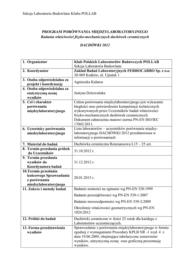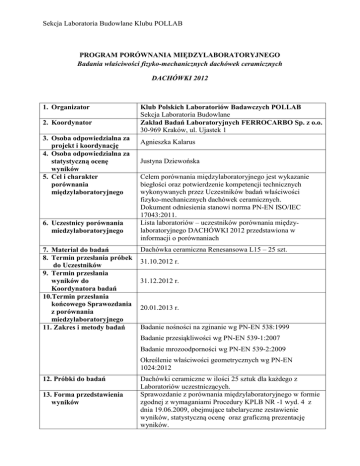 Sekcja Laboratoria Budowlane Klubu POLLAB PROGRAM PORÓWNANIA MIĘDZYLABORATORYJNEGO Badania właściwości fizyko-mechanicznych dachówek ceramicznych DACHÓWKI 2012 1. Organizator 2. Koordynator 3. Osoba odpowiedzialna za projekt i koordynację 4. Osoba odpowiedzialna za statystyczną ocenę wyników 5. Cel i charakter porównania międzylaboratoryjnego 6. Uczestnicy porównania miedzylaboratoryjnego 7. Materiał do badań 8. Termin przesłania próbek do Uczestników 9. Termin przesłania wyników do Koordynatora badań 10.Termin przesłania końcowego Sprawozdania z porównania miedzylaboratoryjnego 11. Zakres i metody badań Klub Polskich Laboratoriów Badawczych POLLAB Sekcja Laboratoria Budowlane Zakład Badań Laboratoryjnych FERROCARBO Sp. z o.o. 30-969 Kraków, ul. Ujastek 1 Agnieszka Kalarus Justyna Dziewońska Celem porównania międzylaboratoryjnego jest wykazanie biegłości oraz potwierdzenie kompetencji technicznych wykonywanych przez Uczestników badań właściwości fizyko-mechanicznych dachówek ceramicznych. Dokument odniesienia stanowi norma PN-EN ISO/IEC 17043:2011. Lista laboratoriów – uczestników porównania międzylaboratoryjnego DACHÓWKI 2012 przedstawiona w informacji o porównaniach Dachówka ceramiczna Renesansowa L15 – 25 szt. 31.10.2012 r. 31.12.2012 r. 20.01.2013 r. Badanie nośności na zginanie wg PN-EN 538:1999 Badanie przesiąkliwości wg PN-EN 539-1:2007 Badanie mrozoodporności wg PN-EN 539-2:2009 Określenie właściwości geometrycznych wg PN-EN 1024:2012 12. Próbki do badań 13. Forma przedstawienia wyników Dachówki ceramiczne w ilości 25 sztuk dla każdego z Laboratoriów uczestniczących. Sprawozdanie z porównania międzylaboratoryjnego w formie zgodnej z wymaganiami Procedury KPLB NR -1 wyd. 4 z dnia 19.06.2009, obejmujące tabelaryczne zestawienie wyników, statystyczną ocenę oraz graficzną prezentację wyników. Sekcja Laboratoria Budowlane Klubu POLLAB PROGRAM PORÓWNANIA MIĘDZYLABORATORYJNEGO Badania właściwości fizyko-mechanicznych dachówek ceramicznych DACHÓWKI 2012 14. Wyposażenie pomiarowe i badawcze 15. Poufność Badania należy przeprowadzić z wykorzystaniem WPiB będącego w posiadaniu danego laboratorium, spełniające wymagania normy PN-EN ISO/IEC 17025:2005 p. 5.5 oraz posiadające udokumentowany status sprawdzania i/lub wzorcowania. Uzyskane wyniki badań nie będą publikowane, a wszelkie informacje uzyskane w ramach niniejszego programu są informacjami poufnymi i mogą być udostępniane jedynie osobom lub jednostkom upoważnionym.
