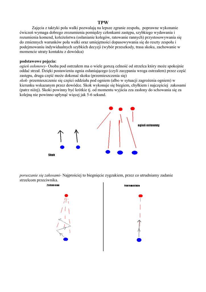 TPW Zajęcia z taktyki pola walki pozwalają na lepsze zgranie zespołu, poprawne wykonanie ćwiczeń wymaga dobrego zrozumienia pomiędzy członkami zastępu, szybkiego wydawania i rozumienia komend, koleżeństwa (osłanianie kolegów, ratowanie rannych) przystosowywania się do zmiennych warunków pola walki oraz umiejętności dopasowywania się do reszty zespołu i podejmowaniu indywidualnych szybkich decyzji (wybór przeszkody, trasa skoku, zachowanie w momencie utraty kontaktu z dowódca) podstawowe pojęcia: ogień osłonowy- Osoba pod ostrzałem ma o wiele gorszą celność od strzelca który może spokojnie oddać strzał. Dzięki postawieniu ognia osłaniającego (czyli zasypaniu wroga ostrzałem) przez część zastępu, druga część może dokonać skoku (przemieszczenia się) skok- przemieszczenie się części oddziału pod ogniem (albo w sytuacji zagrożenia ogniem) w kierunku wskazanym przez dowódce. Skok wykonuje się biegiem, chyłkiem i najczęściej zakosami (patrz niżej). Skoki powinny być krótkie tj. od momentu wyjścia zza zasłony do schowania się za kolejną nie powinno upłynąć więcej jak 5-6 sekund. poruszanie się zakosami- Najprościej to biegnięcie zygzakiem, przez co utrudniamy zadanie strzelcom przeciwnika. poruszanie się chyłkiem- Aby zmniejszyć pole celu wrogim strzelcom, podczas wrogiego ostrzału należy poruszać się w postawie pochylonej (ale na tyle aby możliwy był bieg) ogień krzyżowy- Pojęcie a jednocześnie jedna z żelaznych reguł tpw. Zawarcie wroga w ogień krzyżowych jest bardzo często równoznaczne z wygraniem potyczki. Otrzymywanie ognia z przodu i z jednej z flank (czyli bycie pod ogniem krzyżowym) uniemożliwia 100% schowanie się za przeszkodą i utrudnia manewrowanie oddziałem. Miejsce w którym krzyżuje się nasz ogień nazywamy strefą śmierci i jest to bardzo trafne określenie. Należy pamiętać aby oddziały nie zawierały wroga w ogień krzyżowy z dwóch przeciwnych stron (np. z przodu i z tyłu) bo wtedy istnieje ryzyko ostrzelania swoich. Ideałem jest aby kąt pomiędzy własnym ostrzałem wynosił 90°