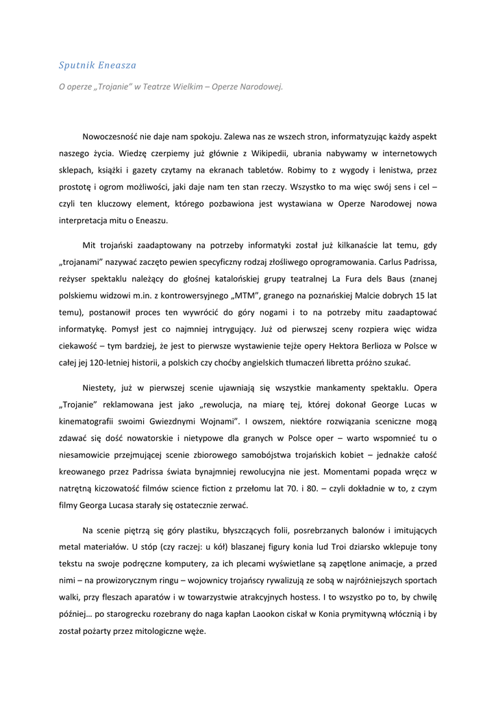 Sputnik Eneasza O operze „Trojanie” w Teatrze Wielkim – Operze Narodowej. Nowoczesność nie daje nam spokoju. Zalewa nas ze wszech stron, informatyzując każdy aspekt naszego życia. Wiedzę czerpiemy już głównie z Wikipedii, ubrania nabywamy w internetowych sklepach, książki i gazety czytamy na ekranach tabletów. Robimy to z wygody i lenistwa, przez prostotę i ogrom możliwości, jaki daje nam ten stan rzeczy. Wszystko to ma więc swój sens i cel – czyli ten kluczowy element, którego pozbawiona jest wystawiana w Operze Narodowej nowa interpretacja mitu o Eneaszu. Mit trojański zaadaptowany na potrzeby informatyki został już kilkanaście lat temu, gdy „trojanami” nazywać zaczęto pewien specyficzny rodzaj złośliwego oprogramowania. Carlus Padrissa, reżyser spektaklu należący do głośnej katalońskiej grupy teatralnej La Fura dels Baus (znanej polskiemu widzowi m.in. z kontrowersyjnego „MTM”, granego na poznańskiej Malcie dobrych 15 lat temu), postanowił proces ten wywrócić do góry nogami i to na potrzeby mitu zaadaptować informatykę. Pomysł jest co najmniej intrygujący. Już od pierwszej sceny rozpiera więc widza ciekawość – tym bardziej, że jest to pierwsze wystawienie tejże opery Hektora Berlioza w Polsce w całej jej 120-letniej historii, a polskich czy choćby angielskich tłumaczeń libretta próżno szukać. Niestety, już w pierwszej scenie ujawniają się wszystkie mankamenty spektaklu. Opera „Trojanie” reklamowana jest jako „rewolucja, na miarę tej, której dokonał George Lucas w kinematografii swoimi Gwiezdnymi Wojnami”. I owszem, niektóre rozwiązania sceniczne mogą zdawać się dość nowatorskie i nietypowe dla granych w Polsce oper – warto wspomnieć tu o niesamowicie przejmującej scenie zbiorowego samobójstwa trojańskich kobiet – jednakże całość kreowanego przez Padrissa świata bynajmniej rewolucyjna nie jest. Momentami popada wręcz w natrętną kiczowatość filmów science fiction z przełomu lat 70. i 80. – czyli dokładnie w to, z czym filmy Georga Lucasa starały się ostatecznie zerwać. Na scenie piętrzą się góry plastiku, błyszczących folii, posrebrzanych balonów i imitujących metal materiałów. U stóp (czy raczej: u kół) blaszanej figury konia lud Troi dziarsko wklepuje tony tekstu na swoje podręczne komputery, za ich plecami wyświetlane są zapętlone animacje, a przed nimi – na prowizorycznym ringu – wojownicy trojańscy rywalizują ze sobą w najróżniejszych sportach walki, przy fleszach aparatów i w towarzystwie atrakcyjnych hostess. I to wszystko po to, by chwilę później… po starogrecku rozebrany do naga kapłan Laookon ciskał w Konia prymitywną włócznią i by został pożarty przez mitologiczne węże. Taka niekonsekwencja zdarza się na każdym kroku. Scena polowania i ucieczki Eneasza z Dydoną do jednej z podkartagińskich jaskiń nie dość, że po uproszczeniu i skróceniu staje się zupełnie niezrozumiała, to pełna jest jeszcze elementów zupełnie niepasujących do obranej przez reżysera scenografii – jak choćby cieni podążających na koniach rycerzy. Nie lepiej prezentuje się boski posłaniec Merkury, spuszczany z nieba na scenę w sputniku wyglądającym jak rodem ze Związku Sowieckiego lat 60. Nawet kilka wprowadzonych do scenariusza elementów komicznych śmieszy raczej jakością wykonania niż tym, co – zdaje się – przyświecało planom reżysera. Trudno także określić jednoznacznie jaki właściwe cel mają te wszystkie zabiegi. Niemal wszystko – migocące laptopy, błyszczące rury czy plastikowe karabiny – wydaje się być czystą sztuką dla sztuki, a żaden z elementów nie niesie ze sobą jakiegokolwiek przesłania, jakiejkolwiek idei, którą reżyser chciałby natchnąć widza. Nawet animacje towarzyszące każdej ze scen, choć w większości dobrze wykonane i przejmujące, w swojej symbolice bywają niekiedy naiwne, a niekiedy wręcz śmieszne. Obrana konwencja dawała okazję na podkreślenie pewnego uniwersalizmu opisanej przez Wergiliusza, a przez Berlioza przeinterpretowanej historii tułaczki Eneasza i jego ludu. W zobrazowanej w Operze Narodowej formie cała ta otoczka wydaje się być zabiegiem… czysto marketingowym. A szkoda. Bo przecież kluczem do dobrej opery jest muzyka i zdolności wokalne występujących. I tym na szczęście niczego zarzucić nie można – głosy dobrane są dobrze, orkiestra spisuje się tak, jak powinna spisywać się orkiestra na poziomie światowym, a arie Kasandry potrafią wywołać gęsią skórkę nawet u nieregularnego bywalca. Wokal co raz to zachwyca pięknem, dynamiką, czasem także dramatyzmem. Linia melodyczna broni się więc sama. Cóż jednak z tego, gdy to, co widać na scenie bardziej przeszkadza niż pomaga wczuć się w nią? Koneserzy zamkną oczy delektując się unoszącymi się po sali tonami. A pozostali? Pozostali albo przemęczą się przez te prawie pięć godzin, albo zrezygnują podczas któregoś z antraktów. Marek Skrzetuski Hector Berlioz wg Wergiliusza TROJANIE Dyrygent: Valery Gergiev Reżyseria: Carlus Padrissa (La Fura dels Baus) Dekoracje: Roland Olbeter Kostiumy: Chu Uroz Choreografia: Emil Faski, Chus Moreno Projekt świateł: Peter van Praet Realizacja projektu świateł: Joan Pedrola Współpraca muzyczna: Mikhail Tatarnikov Przygotowanie chóru: Bogdan Gola Projekcje wideo: Francisco Aleu Riera Chór i Orkiestra Opera Narodowej oraz tancerze i statyści obsada: Eneasz – Sergey Semishkur, Korebus – Alexander Gergalov, Pantus – Robert Gierlach, Narbal – Rafał Siwek, Iopas – David Sotgiu, Askaniusz – Katarzyna Trylnik, Kasandra – Sylvie Brunet, Dydona – Anna Lubańska, Anna – Margarita Mamsirova, Hylas – Mateusz Zajdel, Priam – Jacek Janiszewski, Grecki wódz – Mieczysław Milun, Cień Hektora – Piotr Wołosz, Helenus – Krzysztof Szmyt, żołnierz trojański – Jacek Kostoń, Michał Piskor, Bóg Me
