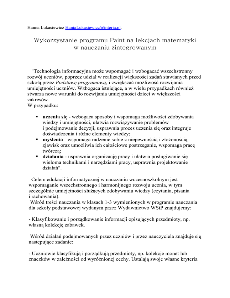 Hanna Łukasiewicz [email protected]. Wykorzystanie programu Paint na lekcjach matematyki w nauczaniu zintegrowanym "Technologia informacyjna może wspomagać i wzbogacać wszechstronny rozwój uczniów, poprzez udział w realizacji większości zadań stawianych przed szkołą przez Podstawę programową, i zwiększać możliwość rozwijania umiejętności uczniów. Wzbogaca istniejące, a w wielu przypadkach również stwarza nowe warunki do rozwijania umiejętności dzieci w większości zakresów. W przypadku: uczenia się - wzbogaca sposoby i wspomaga możliwości zdobywania wiedzy i umiejętności, ułatwia rozwiązywanie problemów i podejmowanie decyzji, usprawnia proces uczenia się oraz integruje doświadczenia i różne elementy wiedzy; myślenia - wspomaga radzenie sobie z niepewnością i złożonością zjawisk oraz umożliwia ich całościowe postrzeganie, wspomaga pracę twórczą; działania - usprawnia organizację pracy i ułatwia posługiwanie się wieloma technikami i narzędziami pracy, usprawnia projektowanie działań". Celem edukacji informatycznej w nauczaniu wczesnoszkolnym jest wspomaganie wszechstronnego i harmonijnego rozwoju ucznia, w tym szczególnie umiejętności służących zdobywaniu wiedzy (czytania, pisania i rachowania). Wśród treści nauczania w klasach 1-3 wymienionych w programie nauczania dla szkoły podstawowej wydanym przez Wydawnictwo WSiP znajdujemy: - Klasyfikowanie i porządkowanie informacji opisujących przedmioty, np. własną kolekcję zabawek. Wśród działań podejmowanych przez uczniów i przez nauczyciela znajduje się następujące zadanie: - Uczniowie klasyfikują i porządkują przedmioty, np. kolekcje monet lub znaczków w zależności od wyróżnionej cechy. Ustalają swoje własne kryteria porządkowania, włączają nowe przedmioty do istniejących kategorii, np. rysunek psa do kolekcji zwierząt. w związku z powyższym głównym tematem mojej pracy będzie wykorzystanie programu graficznego Paint do szerszego zrozumienia pojęć związanych z elementami zbiorów w nauczaniu zintegrowanym. Przystępując do pracy z małymi dziećmi należy szczególnie mieć na uwadze ich sposób poznawania rzeczywistości. Uczniowie w tym wieku znajdują się jeszcze na poziomie myślenia praktycznego, obrazowo - ruchowego, dopiero później przechodzą na poziom myślenia abstrakcyjnego, dlatego dużo łatwiej przyswajają wiadomości i umiejętności poprzez działanie. Zatem pierwsze zajęcia należałoby rozpocząć od ćwiczeń praktycznych utrwalających znajomość podstawowych figur geometrycznych, ponieważ one będą wykorzystane w trakcie realizacji głównego zadania. Można to osiągnąć wykorzystując pomoc często wykorzystywaną na lekcjach matematyki w klasach młodszych tzw. klocki logiczne. Jest to zestaw klocków w czterech kształtach (prostokąt, kwadrat, trójkąt, koło)i trzech kolorach (niebieski, żółty i czerwony). Rozdajemy uczniom komplety klocków i stawiamy zadania: - pokaż żółty trójkąt, - wyjmij czerwony kwadrat, - wskaż niebieskie koło, - podnieś zielony prostokąt itp. Przy okazji zostaną również utrwalone kolory, ponieważ często zdarza się , że nie wszyscy uczniowie potrafią już je rozróżniać. Należy także pamiętać o zasadzie stopniowania trudności, czyli o stopniowym przechodzeniu od ćwiczeń prostych, mniej złożonych do coraz bardziej skomplikowanych. Zajęcia 1 Temat :Rozróżnianie podstawowych figur geometrycznych. Cele: - Doskonalenie umiejętności rozróżniania podstawowych figur geometrycznych: trójkąt, kwadrat, prostokąt, koło. - Poznanie przybornika programu graficznego Paint. - Rysowanie figur geometrycznych. Przebieg zajęć: 1. Uruchomienie programu graficznego Paint. 2. Poznanie podstawowych możliwości przybornika. 3. Rysowanie figur, ewentualna pomoc nauczyciela. Oto przykładowy rysunek: 4. Napisz wewnątrz figur ile mają boków. w wyniku wykonania tego zadania uczniowie poznali sposoby rysowania figur oraz zapoznali się z przybornikiem programu. Dla dzieci, które wcześniej wykonają zadanie można polecić podpisanie figur. Zajęcia 2 Temat: Układanie z poznanych figur różnych ornamentów i wzorów. Cele zajęć: - Doskonalenie umiejętności rozróżniania figur, oraz ich rysowania przy pomocy programu Paint. - Dalsze poznawanie możliwości programu - poznanie opcje: Kopiuj, Wklej. - Rozwijanie wyobraźni i pomysłowości poprzez tworzenie różnych ornamentów z figur geometrycznych. - Poznanie możliwości pracy z wycinkiem. Przebieg zajęć: 1. Zapoznanie z tematem zajęć. Dzisiaj w dalszym ciągu będziemy pracowali z figurami geometrycznymi i programem Paint. Proszę o uruchomienie programu. Spróbujcie z poznanych figur zbudować np. pociąg, jakąś postać lub inny wzór. 2. Dzieci przystępują do pracy. Rysują figury i stwierdzają, że bardzo trudno jest wykonać zadanie, ponieważ nie zawsze udaje się narysować figurę tam gdzie się chce oraz narysować dwie identyczne figury. 3. Nauczyciel prezentuje dzieciom możliwości pracy z wycinkiem oraz sposób kopiowania figur. 4. Uczniowie ćwiczą poznane umiejętności i dalej pracują nad zadaniami. 5. Omówienie wykonany prac przez dzieci poprzez udzielenie odpowiedzi na następujące pytania: - co przedstawia twój rysunek? - z jakich figur go zbudowałeś? - w jaki sposób ozdobiłeś pracę? Przykładowe rysunki: Zajęcia 3 Temat: Klasyfikacja figur geometrycznych ze względu na kształt. Wyodrębnianie zbiorów. Cele zajęć: - Kształcenie umiejętności klasyfikowania przedmiotów według określonej cechy (klasyfikacja figur). - Utrwalenie pojęcia "zbiór". - Doskonalenie umiejętności pracy z wycinkiem. Przebieg zajęć: 1. Polecamy dzieciom otworzyć plik o nazwie "Zbiory". Uczniowie wykonują polecenie. Ukazuje się następująca plansza: 2. Spróbujcie rozmieścić figury tak, aby w każdej pętli znalazły się figury o tym samym kształcie. Podpiszcie ut