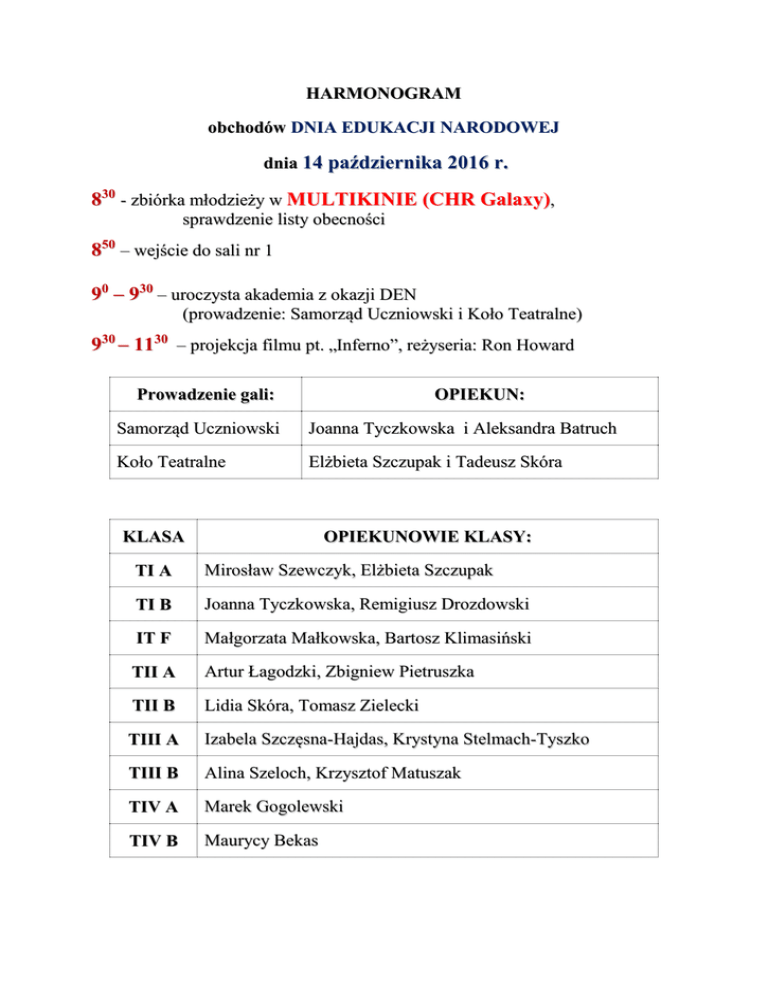 HARMONOGRAM obchodów DNIA EDUKACJI NARODOWEJ dnia 14 października 2016 r. 830 - zbiórka młodzieży w MULTIKINIE (CHR Galaxy), sprawdzenie listy obecności 850 – wejście do sali nr 1 90 – 930 – uroczysta akademia z okazji DEN (prowadzenie: Samorząd Uczniowski i Koło Teatralne) 930 – 1130 – projekcja filmu pt. „Inferno”, reżyseria: Ron Howard Prowadzenie gali: OPIEKUN: Samorząd Uczniowski Joanna Tyczkowska i Aleksandra Batruch Koło Teatralne Elżbieta Szczupak i Tadeusz Skóra KLASA OPIEKUNOWIE KLASY: TI A Mirosław Szewczyk, Elżbieta Szczupak TI B Joanna Tyczkowska, Remigiusz Drozdowski IT F Małgorzata Małkowska, Bartosz Klimasiński TII A Artur Łagodzki, Zbigniew Pietruszka TII B Lidia Skóra, Tomasz Zielecki TIII A Izabela Szczęsna-Hajdas, Krystyna Stelmach-Tyszko TIII B Alina Szeloch, Krzysztof Matuszak TIV A Marek Gogolewski TIV B Maurycy Bekas