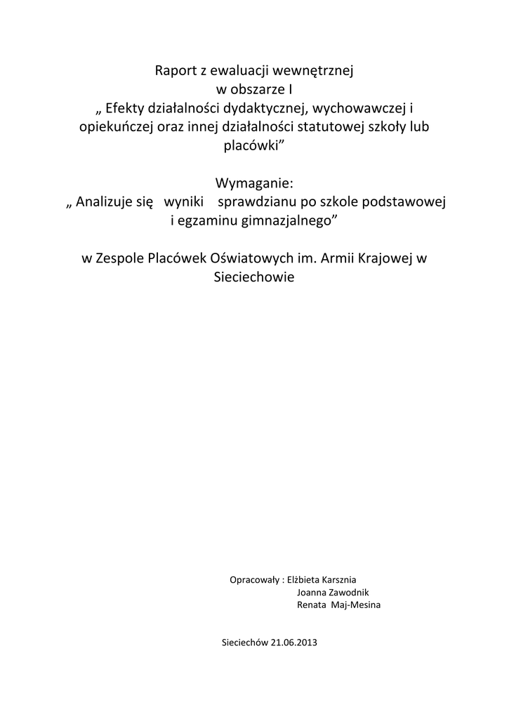Raport z ewaluacji wewnętrznej w obszarze I „ Efekty działalności dydaktycznej, wychowawczej i opiekuńczej oraz innej działalności statutowej szkoły lub placówki” Wymaganie: „ Analizuje się wyniki sprawdzianu po szkole podstawowej i egzaminu gimnazjalnego” w Zespole Placówek Oświatowych im. Armii Krajowej w Sieciechowie Opracowały : Elżbieta Karsznia Joanna Zawodnik Renata Maj-Mesina Sieciechów 21.06.2013 1. Spis treści. 1.1 Cele ewaluacji. 1.2 Narzędzia i metody badawcze. 2.Ocena stanu obecnego. 2.1 Ankieta skierowana do nauczycieli i wyniki ankiety 2.2 Ankieta skierowana do wychowawców i wyniki ankiety. 2.3 Wywiad z Dyrektorem. 3. Podsumowanie Zespołu Matematyczno – Przyrodniczego. 3.1.Wnioski Zespołu Matematyczno – Przyrodniczego. 3.2 Propozycje do dalszej pracy. 4. Podsumowanie Zespołu Humanistycznego. 4.1 Wnioski Zespołu Humanistycznego. 5. Ankieta skierowana do uczniów i jej wyniki Zespołu Języków Obcych. 5.1 Podsumowanie Zespołu Języków Obcych. 5.2 Wnioski Zespołu Języków Obcych. 1.WSTĘP 1.1 Cel ewaluacji: Zbadanie czy wyniki sprawdzianu i egzaminu gimnazjalnego są analizowane w celu poprawy jakości nauki. Zbadanie, czy do analizy stosuje się różne metody. Zbadanie czy wnioski z analiz są wdrażane. Zbadanie , czy wdrażane wnioski przyczyniają się do wzrostu efektu kształcenia. 1.2 Narzędzia i metody, grupa badawcza: analiza dokumentacji szkolnej, ankieta skierowana do nauczycieli, wychowawców, wywiad z Dyrektorem szkoły. 2. OCENA STANU OBECNEGO Grupę badawczą stanowili nauczyciele, wychowawcy, zespół analizujący wyniki sprawdzianu oraz Dyrektor szkoły. Badanie zostało przeprowadzone w warunkach szkolnych. Ankietowanych było 64%nauczycieli i 88% wychowawców; wywiad został przeprowadzony z wszystkimi wychowawcami, osobami wchodzącymi w skład zespołów analizującego wyniki sprawdzianu oraz Dyrektorem szkoły. Podczas badania nie było przeszkód technicznych. W analizowaniu zebranych danych brali udział wszyscy członkowie zespołu ds. ewaluacji sprawdzianu klas VI i egzaminu gimnazjalnego. 2.1 Ankieta skierowana do nauczycieli i jej wyniki. W poszukiwaniu odpowiedzi na pytania kluczowe uzyskano poniższe odpowiedzi z ankiety skierowanej do nauczycieli: Pytanie kluczowe nr 1: Czy analizowane są w szkole wyniki sprawdzianu/egzaminów gimnazjalnych?. Czy analizowane są w szkole wyniki sprawdzianu/egzaminu? 15 10 5 0 tak nie 100% nauczycieli odpowiedziało, że w szkole są analizowane wyniki sprawdzianów i egzaminów gimnazjalnych. Pytanie kluczowe nr 2: Czy uczestniczy Pani/Pan w analizowaniu wyników sprawdzianu/egzaminu? Odpowiedzi do pytania 2. 15 10 5 0 tak nie 85% nauczycieli odpowiedziało, że uczestniczy w analizowaniu wyników sprawdzianu i egzaminu. Pytanie kluczowe nr 3: Czy analizowane wyniki są pracą zespołową nauczycieli? Odpowiedzi do pytania 3. 15 10 5 0 tak nie 92% nauczycieli odpowiedziało, że analiza wyników jest praca zespołową. Pytanie kluczowe nr 4: Czy wnioski z analizy sprawdzianu przedstawia się Dyrekcji Szkoły i Radzie Pedagogicznej? Odpowiedzi do pytania 4. 15 10 5 0 tak nie 100% nauczycieli odpowiedziało, że wnioski z analizy przedstawia się Dyrekcji i Radzie Pedagogicznej. Pytanie kluczowe nr 5: Czy wnioski z analizy uwzględnia Pan/Pani w dalszej pracy dydaktycznej? Odpowiedzi do pytania 5. 15 10 5 0 tak nie 85% nauczycieli odpowiedziało, że uwzględnia wnioski w swojej pracy dydaktycznej. Pytanie kluczowe nr 6: W jaki sposób wykorzystuje Pan/Pani analizę wyników sprawdzianu/egzaminu w swojej pracy? Na podstawie udzielonych odpowiedzi stwierdzono, że wykorzystują wyniki analizy w następujący sposób: - zmiany metod pracy, - więcej ćwiczeń utrwalających zagadnienia trudne na zajęciach dodatkowych, - lekcje powtórzeniowe, - inne zajęcia. Pytanie kluczowe nr 7: Czy widzi Pan/Pani efekty wykorzystania w swojej pracy analizy wyników sprawdzianu /egzaminu? Odpowiedzi do pytania 7. 12 10 8 6 4 2 0 tak nie 69% nauczycieli stwierdziło, że widzi efekty wykorzystania w swojej pracy analizy wyników. Pytanie kluczowe nr 8: Czy uważa Pan/Pani, ze należy dokonywać zmian w sposobie postępowania w zakresie analizowania danych i wdrażania wniosków? Odpowiedzi do pytania 8. 12 10 8 6 4 2 0 tak nie 77% nauczycieli stwierdziło, że nie należy dokonywać zmian w sposobie postępowania w zakresie analizowania danych i wdrażania wniosków. Pytanie kluczowe nr 9: Czy widzi Pan/Pani potrzebę szkoleń w zakresie analizy , interpretacji i wykorzystania wyników sprawdzianu/egzaminu? 7,2 7 6,8 6,6 6,4 6,2 6 5,8 5,6 5,4 Odpowiedzi do pytania 9. tak nie 54% nauczycieli stwierdziło, że widzi potrzebę szkoleń w zakresie analizy , interpretacji i wykorzystania wyników sprawdzianu/egzaminu? 2.2 Ankieta skierowana do wychowawców i jej wyniki. W poszukiwaniu odpowiedzi na pytania kluczowe uzyskano poniższe odpowiedzi z ankiety skierowanej do wychowawców: Pytanie kluczowe nr 1: Czy znane są Panu/Pani warunki środowiskowe i rodzinne swoich wychowanków? 100% wychowawców stwierdziło, że znane są im warunki środowiskowe i rodzinne swoich wychowanków. Pytanie kluczowe nr 2: Czy informuje Pan/Pani rodziców o procedurach przeprowadzania sprawdzian/egzaminu? 100% wychowawców stwierdziło, że informuje rodziców o procedurach przeprowadzania sprawdzian/egzaminu. Pytanie kluczowe nr 3: Czy informuje Pan/Pani rodziców o możliwości dostosowania warunków sprawdzianu/egzaminu do indywidualnych potrzeb ucznia? 100% wychowawców stwierdziło, że informuje rodziców o możliwości dostosowania warunków sprawdzianu/egzaminu do indywidualnych potrzeb ucznia. Pytanie kluczowe nr 4: Czy rodzice chcą skorzystać z tej możliwości? 100% wychowawców stwierdziło, że chcą skorzystać z tej możliwości. Pytanie kluczowe nr 5: Czy współpracuje Pan/Pani z nauczycielami przedmiotów w zakresie wspomagania uczniów ze specjalnymi potrzebami edukacyjnymi? 100% wychowawcó