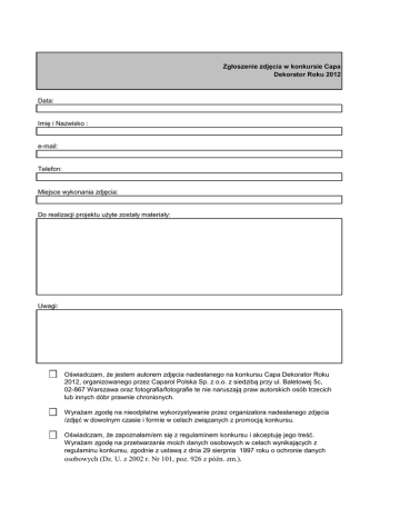 Zgłoszenie zdjęcia w konkursie Capa Dekorator Roku 2012 Data: Imię i Nazwisko : e-mail: Telefon: Miejsce wykonania zdjęcia: Do realizacji projektu użyte zostały materiały: Uwagi: Oświadczam, że jestem autorem zdjęcia nadesłanego na konkursu Capa Dekorator Roku 2012, organizowanego przez Caparol Polska Sp. z o.o. z siedzibą przy ul. Baletowej 5c, 02-867 Warszawa oraz fotografia/fotografie te nie naruszają praw autorskich osób trzecich lub innych dóbr prawnie chronionych. Wyrażam zgodę na nieodpłatne wykorzystywanie przez organizatora nadesłanego zdjęcia /zdjęć w dowolnym czasie i formie w celach związanych z promocją konkursu. Oświadczam, że zapoznałam/em się z regulaminem konkursu i akceptuję jego treść. Wyrażam zgodę na przetwarzanie moich danych osobowych w celach wynikających z regulaminu konkursu, zgodnie z ustawą z dnia 29 sierpnia 1997 roku o ochronie danych osobowych (Dz. U. z 2002 r. Nr 101, poz. 926 z późn. zm.).