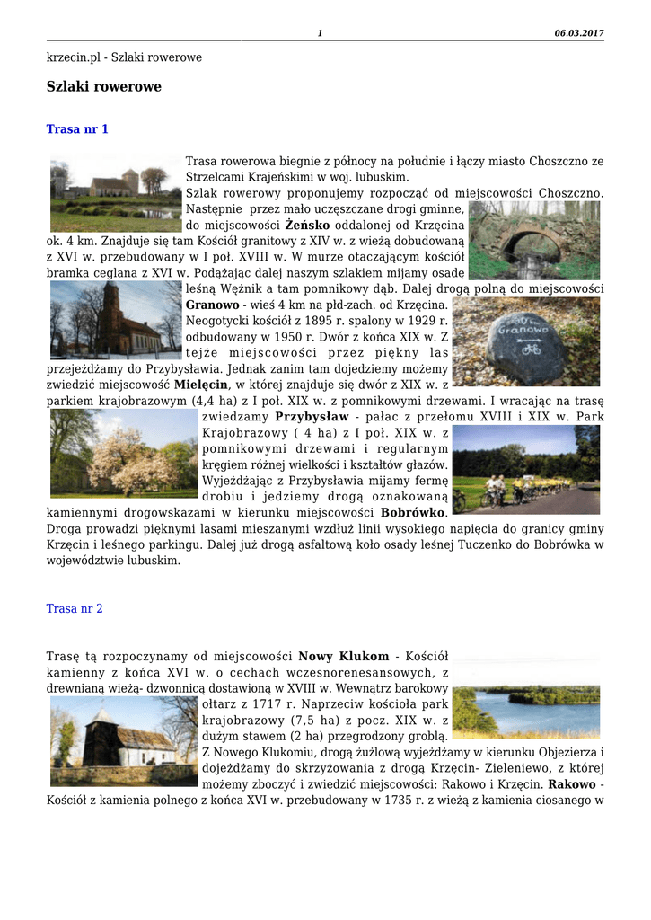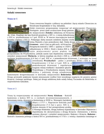 1 06.03.2017 krzecin.pl - Szlaki rowerowe Szlaki rowerowe Trasa nr 1 Trasa rowerowa biegnie z północy na południe i łączy miasto Choszczno ze Strzelcami Krajeńskimi w woj. lubuskim. Szlak rowerowy proponujemy rozpocząć od miejscowości Choszczno. Następnie przez mało uczęszczane drogi gminne, do miejscowości Żeńsko oddalonej od Krzęcina ok. 4 km. Znajduje się tam Kościół granitowy z XIV w. z wieżą dobudowaną z XVI w. przebudowany w I poł. XVIII w. W murze otaczającym kościół bramka ceglana z XVI w. Podążając dalej naszym szlakiem mijamy osadę leśną Wężnik a tam pomnikowy dąb. Dalej drogą polną do miejscowości Granowo - wieś 4 km na płd-zach. od Krzęcina. Neogotycki kościół z 1895 r. spalony w 1929 r. odbudowany w 1950 r. Dwór z końca XIX w. Z tejże miejscowości przez piękny las przejeżdżamy do Przybysławia. Jednak zanim tam dojedziemy możemy zwiedzić miejscowość Mielęcin, w której znajduje się dwór z XIX w. z parkiem krajobrazowym (4,4 ha) z I poł. XIX w. z pomnikowymi drzewami. I wracając na trasę zwiedzamy Przybysław - pałac z przełomu XVIII i XIX w. Park Krajobrazowy ( 4 ha) z I poł. XIX w. z pomnikowymi drzewami i regularnym kręgiem różnej wielkości i kształtów głazów. Wyjeżdżając z Przybysławia mijamy fermę drobiu i jedziemy drogą oznakowaną kamiennymi drogowskazami w kierunku miejscowości Bobrówko. Droga prowadzi pięknymi lasami mieszanymi wzdłuż linii wysokiego napięcia do granicy gminy Krzęcin i leśnego parkingu. Dalej już drogą asfaltową koło osady leśnej Tuczenko do Bobrówka w województwie lubuskim. Trasa nr 2 Trasę tą rozpoczynamy od miejscowości Nowy Klukom - Kościół kamienny z końca XVI w. o cechach wczesnorenesansowych, z drewnianą wieżą- dzwonnicą dostawioną w XVIII w. Wewnątrz barokowy ołtarz z 1717 r. Naprzeciw kościoła park krajobrazowy (7,5 ha) z pocz. XIX w. z dużym stawem (2 ha) przegrodzony groblą. Z Nowego Klukomiu, drogą żużlową wyjeżdżamy w kierunku Objezierza i dojeżdżamy do skrzyżowania z drogą Krzęcin- Zieleniewo, z której możemy zboczyć i zwiedzić miejscowości: Rakowo i Krzęcin. Rakowo Kościół z kamienia polnego z końca XVI w. przebudowany w 1735 r. z wieżą z kamienia ciosanego w 2 06.03.2017 górnejkondygnacjidrewnianą,dobudowanąw1890r.zbarokowymwyposażeniemwnętrza. Pseudoklasycystyczny dworek z pocz. XX w. Krzęcin Jest to duża wieś nad rzeczką Małą Iną. Kościół z XVII w. podworski park (5,5 ha) założony pod koniec XVIII w. z pomnikowymi drzewami. Na płn.-zach. od wsi położone są trzy niewielkie jeziora: Krzęcin (24 ha), Czyste (10 ha) i Żeńsko (29 ha). Po powrocie na trasę wjeżdżamy do miejscowości Objezierze - duża wieś położona między dwoma rynnowymi jeziorami: Bukowskim (61 ha) oraz jeziorem Objezierze (18 ha). Kościół z XVIII w. murowany z kamienia i cegły z wieżą z 1825 r. Z Objezierza koło remizy strażackiej wyruszamy w kierunku Chłopowa. Jest to wieś na przesmyku pomiędzy jeziorami Chłopowo (73 ha), a Kościelnym (18 ha). Barokowy kościół z późnogotyckim tryptykiem z XV w. wewnątrz. Jadąc ulicą Bukową w stronę Rembusza, około 500 metrów za wsią znajduje się potężny dąb (obw. 735 cm), pomnik przyrody. Trzymając się trasy nr 2 wracamy do Chłopowa i wyjeżdżamy ulicą Leśną w kierunku Strzelec Krajeńskich. Po około 2 km skręcamy zgodnie z ustawionym kamiennym drogowskazem na drogę leśną prowadzącą do Bobrówka. Dojeżdżamy do punktu czerpania wody, przy rozlewisku leśnym zwanym "Kanadą". Z miejsca tego rozciąga się łądny widok na rozlewisko - miejsce lęgowe dzikiego ptactwa (łabędź niemy, gęś gęgawa, żuraw) oraz siedlisko coraz częściej występujących bobrów. Z punktu czerpania wody jedziemy leśną drogą w kierunku południowym do drogi powiatowej Choszczno-Strzelce Krajeńskie i dalej drogą leśną do parkingu na granicy gminy, gdzie łączymy się z trasą nr 1. Centralne położenie ośrodka administracyjnego jakim jest Krzęcin w stosunku do pozostałych miejscowości gminy i dobry układ dróg, pozwala praktycznie poza wymienionymi tutaj trasami objechać gminę dookoła i umożliwia powrót z każdej miejscowości do Krzęcina. MAPA SZLAKÓW ROWEROWYCH 3 LEGENDA TRASA I Żeńsko - Granowo - Przybysław - Bobrówko TRASA II Nowy Klukom - Objezierze - Chłopowo - Bobrówko 06.03.2017 4 06.03.2017