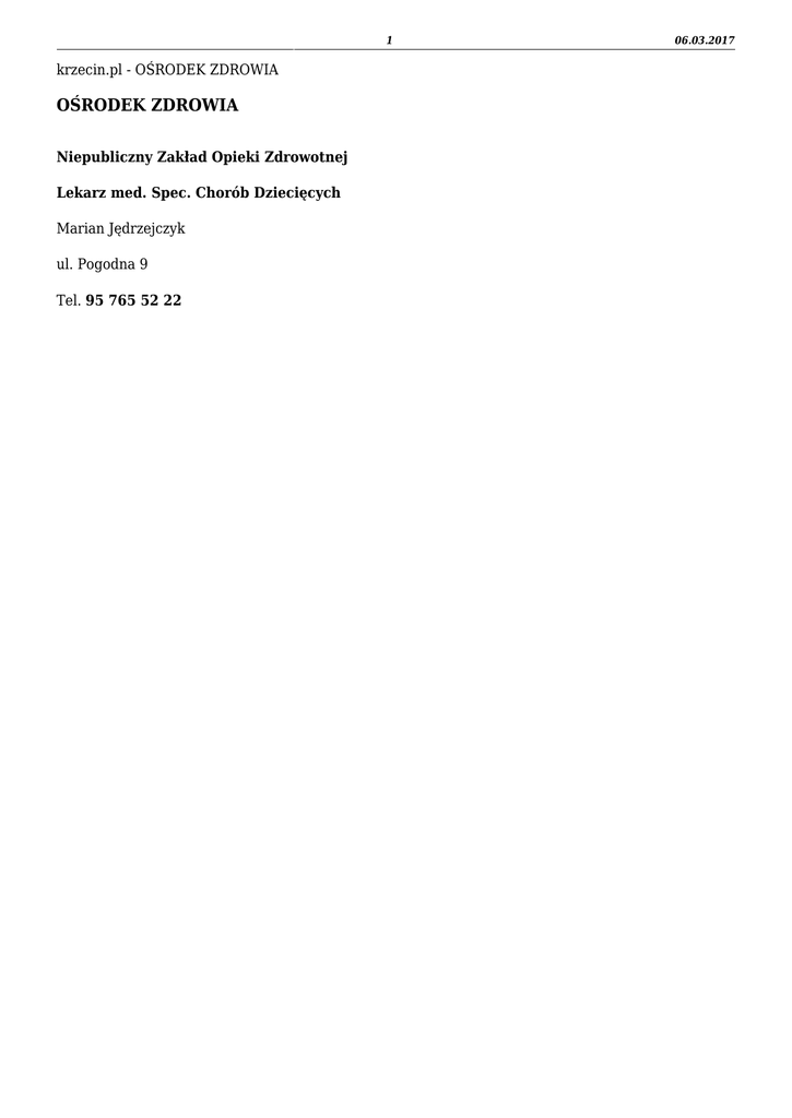 1 krzecin.pl - OŚRODEK ZDROWIA OŚRODEK ZDROWIA Niepubliczny Zakład Opieki Zdrowotnej Lekarz med. Spec. Chorób Dziecięcych Marian Jędrzejczyk ul. Pogodna 9 Tel. 95 765 52 22 06.03.2017