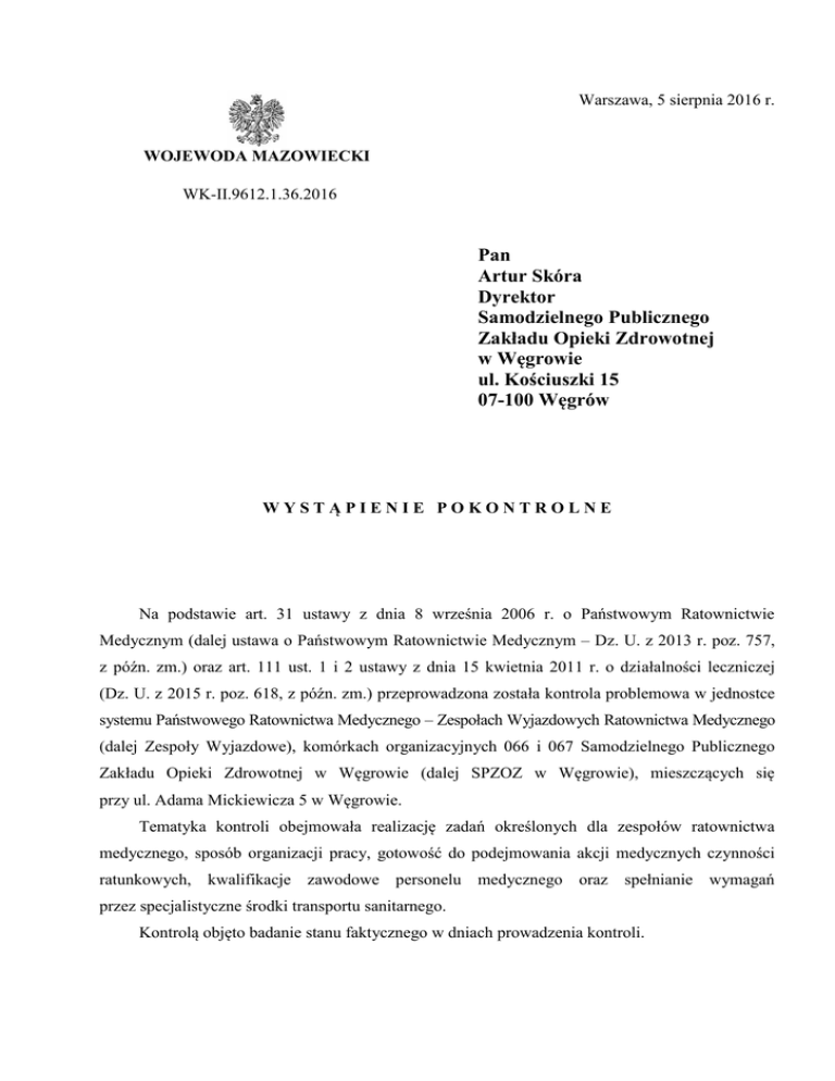 Warszawa, 5 sierpnia 2016 r. WOJEWODA MAZOWIECKI WK-II.9612.1.36.2016 Pan Artur Skóra Dyrektor Samodzielnego Publicznego Zakładu Opieki Zdrowotnej w Węgrowie ul. Kościuszki 15 07-100 Węgrów WYSTĄPIENIE POKONTROLNE Na podstawie art. 31 ustawy z dnia 8 września 2006 r. o Państwowym Ratownictwie Medycznym (dalej ustawa o Państwowym Ratownictwie Medycznym – Dz. U. z 2013 r. poz. 757, z późn. zm.) oraz art. 111 ust. 1 i 2 ustawy z dnia 15 kwietnia 2011 r. o działalności leczniczej (Dz. U. z 2015 r. poz. 618, z późn. zm.) przeprowadzona została kontrola problemowa w jednostce systemu Państwowego Ratownictwa Medycznego – Zespołach Wyjazdowych Ratownictwa Medycznego (dalej Zespoły Wyjazdowe), komórkach organizacyjnych 066 i 067 Samodzielnego Publicznego Zakładu Opieki Zdrowotnej w Węgrowie (dalej SPZOZ w Węgrowie), mieszczących się przy ul. Adama Mickiewicza 5 w Węgrowie. Tematyka kontroli obejmowała realizację zadań określonych dla zespołów ratownictwa medycznego, sposób organizacji pracy, gotowość do podejmowania akcji medycznych czynności ratunkowych, kwalifikacje zawodowe personelu medycznego oraz spełnianie wymagań przez specjalistyczne środki transportu sanitarnego. Kontrolą objęto badanie stanu faktycznego w dniach prowadzenia kontroli. W związku z kontrolą, której szczegółowe wyniki przedstawione zostały w protokole kontroli, podpisanym bez zastrzeżeń w dniu 13 czerwca 2016 r., przekazuję Panu Dyrektorowi niniejsze wystąpienie pokontrolne. W trakcie kontroli ustalono, że w gotowości wyjazdowej pozostawały dwa Zespoły Wyjazdowe – specjalistyczny (gotowość całodobowa) i podstawowy (gotowość w godzinach 1000 – 2200). Pomieszczenia będące miejscem stacjonowania Zespołów Wyjazdowych oraz specjalistyczne środki transportu sanitarnego wyposażone zostały w środki łączności zapewniające stały kontakt z centrum powiadamiania ratunkowego. Sprzęt i aparatura medyczna wykorzystywane do udzielania świadczeń zdrowotnych umożliwiały niezwłoczne przeprowadzanie medycznych czynności ratunkowych. Leki znajdujące się w wyposażeniu Zespołów Wyjazdowych posiadały ważne terminy przydatności do stosowania. Specjalistyczne środki transportu sanitarnego spełniały wymagania określone w Polskiej Normie PN-EN 1789+A1. Na podstawie harmonogramów pracy Zespołów Wyjazdowych ustalono, że świadczenia opieki zdrowotnej podejmowane w celu ratowania osób w stanie nagłego zagrożenia zdrowotnego w warunkach pozaszpitalnych udzielane były przez personel medyczny posiadający wymagane kwalifikacje zawodowe i zapewniający odpowiednią obsadę dla zespołu specjalistycznego i podstawowego. Świadczenia medyczne wykonywane były przez 10 lekarzy systemu, z których 8 posiadało specjalizację lub tytuł specjalisty albo ukończyło co najmniej drugi rok specjalizacji w dziedzinach: medycyny ratunkowej (jeden lekarz), chorób wewnętrznych (jeden lekarz), ortopedii i traumatologii narządu ruchu (jeden lekarz), anestezjologii i intensywnej terapii (dwóch lekarzy), chirurgii ogólnej (trzech lekarzy). Dwóch pozostałych lekarzy posiadało wypracowane 3000 godzin w wykonywaniu zawodu lekarza – jeden w izbie przyjęć szpitala, a drugi w zespołach ratownictwa medycznego. Świadczenia medyczne zapewniane były również przez 22 ratowników medycznych. W dokumentacji podmiotu leczniczego zgromadzono dokumenty potwierdzające prawo wykonywania zawodu aktualnie zatrudnionej kadry lekarskiej oraz zaświadczenia o przygotowaniu zawodowym ratowników medycznych. W wyniku analizy treści Rejestru skarg, reklamacji i wniosków SPZOZ w Węgrowie za okres od 1 stycznia 2015 r. do dnia zakończenia kontroli ustalono, że w okresie tym wpłynęło dziesięć spraw skargowych – osiem w 2015 r. i dwie w 2016 r. W zakresie pracy zespołów ratownictwa medycznego nie zarejestrowano żadnych skarg, natomiast odnotowane zostało podziękowanie pacjentki, w którym wyrażała uznanie dla zespołu specjalistycznego zapewniającego jej fachową opiekę medyczną w trakcie transportu do szpitala. Rejestru skarg, reklamacji i wniosków prowadzony był w sposób przejrzysty i uporządkowany. 2 Na podstawie przeprowadzonej analizy Kart zlecenia wyjazdu zespołu ratownictwa medycznego oraz Kart medycznych czynności ratunkowych, sporządzonych w okresie od 1 do 30 kwietnia 2016 r. przez Zespoły Wyjazdowe, dokonano następujących ustaleń. Zespół podstawowy w 25 przypadkach na 57 zrealizowanych zleceń wyjazdu do miejsca zdarzenia znajdującego się poza miastem powyżej 10 tysięcy mieszkańców przekroczył maksymalny czas dotarcia, który – zgodnie z art. 24 ust. 1 pkt 3 ustawy o Państwowym Ratownictwie Medycznym – nie może być dłuższy niż 20 minut. Przekroczenie wyniosło: 1 (w trzech przypadkach), 2 (w dwóch przypadkach), 3 (w trzech przypadkach), 4, 5 (w czterech przypadkach), 6 (w dwóch przypadkach), 8, 9 (w pięciu przypadkach), 10 (w dwóch przypadkach), 12 i 14 minut. Zespół specjalistyczny również przekroczył maksymalny czas dotarcia w 13 przypadkach na 55 zrealizowanych zleceń wyjazdu poza obszar miasta. Przekroczenie wynosiło: 1, 2 (w trzech przypadkach), 4 (w dwóch przypadkach), 5 (w dwóch przypadkach), 6 (w trzech przypadkach), 8 i 10 minut. Przedstawiając powyższe ustalenia pragnę poinformować Pana Dyrektora, że pozytywnie oceniono kwalifikacje i zabezpieczenie kadry medycznej w Zespołach Wyjazdowych Ratownictwa Medycznego oraz warunki i wyposażenie specjalistycznych środków transportu sanitarnego, niemniej należy podjąć działania usprawniające organizację pracy zespołów w celu zapewnienia odpowiednich parametrów czasu dotarcia na miejsce zdarzenia od chwili przyjęcia zgłoszenia przez dyspozytora medycznego – zgodnie z normą określoną w art. 24 ust. 1 pkt 3 ustawy o Państwowym Ratownictwie Medycznym. Jednocześnie zobowiązuję Pana Dyrektora do poinformowania Wojewody Mazowiecki