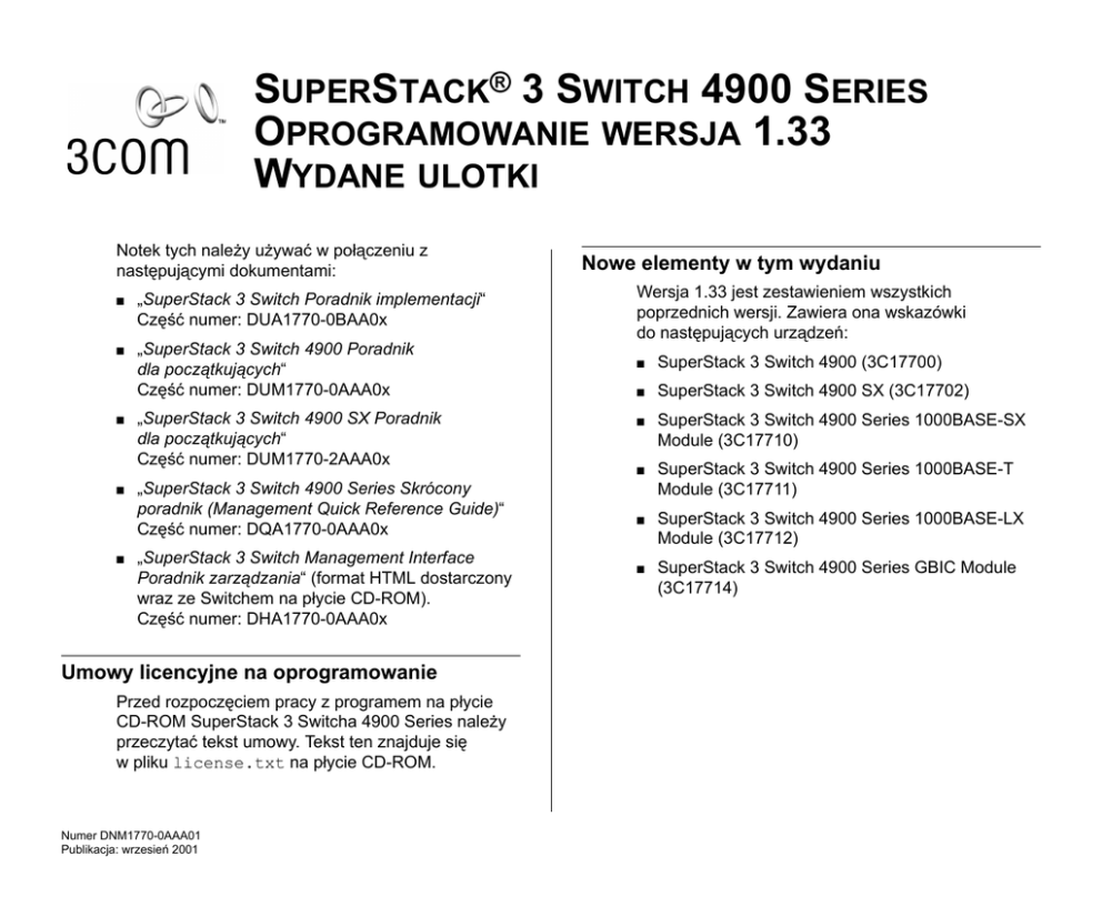 superstack ® 3 switch 4900 series oprogramowanie wersja wydane