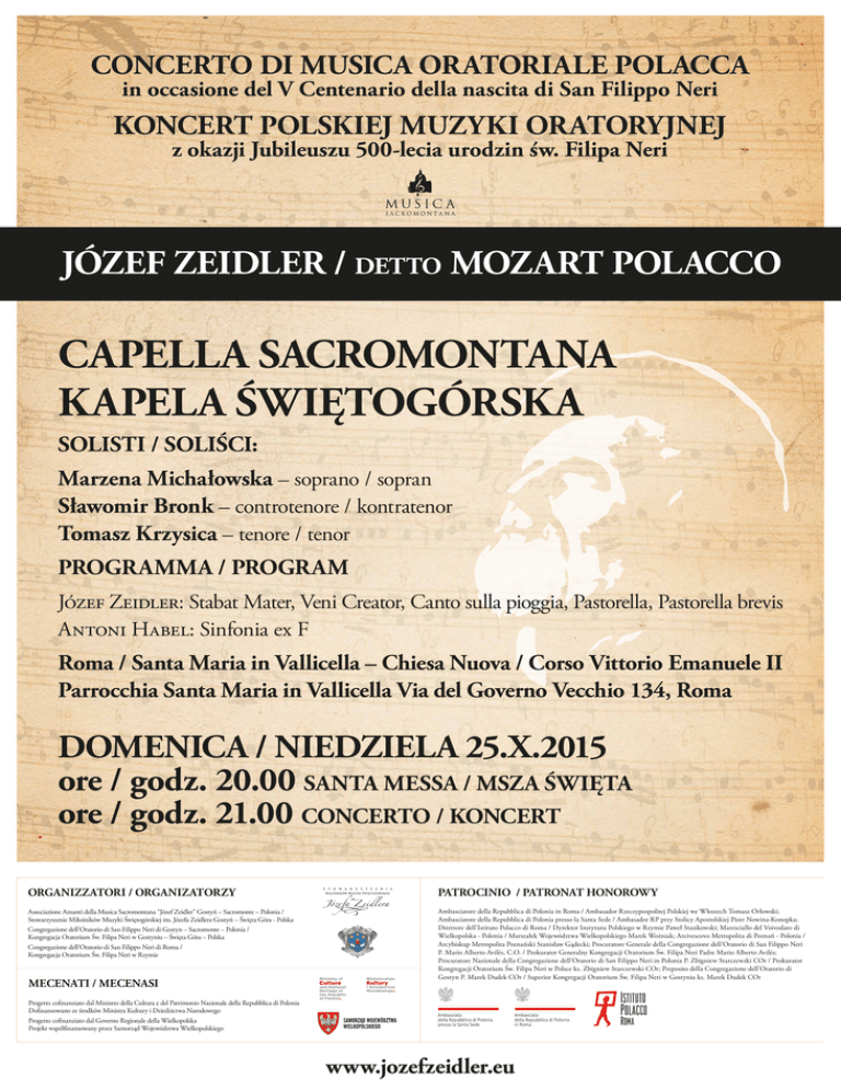 CONCERTO DI MUSICA ORATORIALE POLACCA in occasione del V Centenario della nascita di San Filippo Neri KONCERT POLSKIEJ MUZYKI ORATORYJNEJ z okazji Jubileuszu 500-lecia urodzin św. Filipa Neri JÓZEF ZEIDLER / DETTO MOZART POLACCO CAPELLA SACROMONTANA KAPELA ŚWIĘTOGÓRSKA SOLISTI / SOLIŚCI: Marzena Michałowska – soprano / sopran Sławomir Bronk – controtenore / kontratenor Tomasz Krzysica – tenore / tenor PROGRAMMA / PROGRAM Józef Zeidler: Stabat Mater, Veni Creator, Canto sulla pioggia, Pastorella, Pastorella brevis Antoni Habel: Sinfonia ex F Roma / Santa Maria in Vallicella – Chiesa Nuova / Corso Vittorio Emanuele II Parrocchia Santa Maria in Vallicella Via del Governo Vecchio 134, Roma DOMENICA / NIEDZIELA 25.X.2015 ore / godz. 20.00 SANTA MESSA / MSZA ŚWIĘTA ore / godz. 21.00 CONCERTO / KONCERT ORGANIZZATORI / ORGANIZATORZY PATROCINIO / PATRONAT HONOROWY Associazione Amanti della Musica Sacromontana “Józef Zeidler” Gostyń – Sacromonte – Polonia / Stowarzyszenie Miłośników Muzyki Świętogórskiej im. Józefa Zeidlera Gostyń – Święta Góra - Polska Congregazione dell’Oratorio di San Filippo Neri di Gostyn – Sacromonte – Polonia / Kongregacja Oratorium Św. Filipa Neri w Gostyniu – Święta Góra – Polska Congregazione dell’Oratorio di San Filippo Neri di Roma / Kongregacja Oratorium Św. Filipa Neri w Rzymie Ambasciatore della Repubblica di Polonia in Roma / Ambasador Rzeczypospolitej Polskiej we Włoszech Tomasz Orłowski; Ambasciatore della Repubblica di Polonia presso la Santa Sede / Ambasador RP przy Stolicy Apostolskiej Piotr Nowina-Konopka; Direttore dell'Istituto Polacco di Roma / Dyrektor Instytutu Polskiego w Rzymie Paweł Stasikowski; Maresciallo del Voivodato di Wielkopolska - Polonia / Marszałek Województwa Wielkopolskiego Marek Woźniak; Arcivescovo Metropolita di Poznań - Polonia / Arcybiskup Metropolita Poznański Stanisław Gądecki; Procuratore Generale della Congregazione dell’Oratorio di San Filippo Neri P. Mario Alberto Avilés, C.O. / Prokurator Generalny Kongregacji Oratorium Św. Filipa Neri Padre Mario Alberto Avilés; Procuratore Nazionale della Congregazione dell’Oratorio di San Filippo Neri in Polonia P. Zbigniew Starczewski COr / Prokurator Kongregacji Oratorium Św. Filipa Neri w Polsce ks. Zbigniew Starczewski COr; Preposito della Congregazione dell'Oratorio di Gostyn P. Marek Dudek COr / Superior Kongregacji Oratorium Św. Filipa Neri w Gostyniu ks. Marek Dudek COr MECENATI / MECENASI logo Ambasady RP w Watykanie.pdf 1 2015-09-15 20:52:14 logo Ambasady RP w Rzymie.pdf 1 2015-09-15 20:51:28 Progetto cofinanziato dal Ministro della Cultura e del Patrimonio Nazionale della Repubblica di Polonia Dofinansowano ze środków Ministra Kultury i Dziedzictwa Narodowego Progetto cofinanziato dal Governo Regionale della Wielkopolska Projekt współfinansowany przez Samorząd Województwa Wielkopolskiego www.jozefzeidler.eu