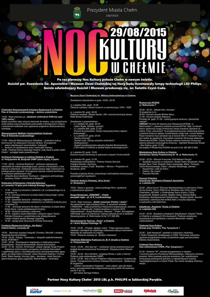 Prezydent Miasta Chełm zaprasza 29/08/2015 Po raz pierwszy Noc Kultury pokaże Chełm w nowym świetle. Kościół pw. Rozesłania Św. Apostołów i Muzeum Ziemi Chełmskiej tej Nocy będą iluminowały lampy technologii LED Philips. Goście odwiedzający Kościół i Muzeum przekonają się, że: Światło-Czyni-Cuda. Muzeum Ziemi Chełmskiej im. Wiktora Ambroziewicza w Chełmie Zwiedzanie indywidualne w godz. 18.00 - 24.00 ul. Lubelska 56A, godz. 18.00 Otwarcie wystawy „Nasze muzeum a czarniecczycy 1919 - 1939”. Chełmskie Stowarzyszenie Inicjatyw Społecznych w Chełmie Plac dr Edwarda Łuczkowskiego – zbiórka uczestników 15.00 - Rajd rowerowy pt. „Szlakiem chełmskich PGR-ów czyli 120% normy”. Każdy uczestnik rajdu otrzyma dzwonek do roweru, a po przejechaniu około połowy trasy przewidziany jest postój w klimatycznym miejscu z pieczeniem kiełbasek oraz ugaszenie pragnienia okolicznościową oranżadą. Stowarzyszenie WeRwA i Automobilklub Chełmski Plac dr Edwarda Łuczkowskiego 17.00 - Wieczór Motoryzacyjnych Zabytków - „preludium kultury technicznej” do właściwych nocnych atrakcji. W programie: • pokaz zabytkowych samochodów i motocykli, • konkurs na najciekawsze auta i motocykle imprezy. 18.00 - Festiwal kultury dawnego Chełma „Cały świat to jeden wielki Chełm” - przegląd kapel podwórkowych. Archiwum Państwowe w Lublinie Oddział w Chełmie ul. Partyzantów 40, Budynek CHBP (stara część), II piętro 17.00 - 20.00 - „Archiwa Rodzinne” - archiwum zaprasza po wskazówki do badań genealogicznych, pomoc w korzystaniu z baz danych w internecie, możliwość zeskanowania zdjęć rodzinnych na profesjonalnym sprzęcie. W programie również nowinki techniczne w archiwach państwowych oraz: • „Otwarte drzwi skarbnicy” Archiwum - magazynu archiwalnego, • wystawa „Chełm i chełmianie w fotografii”. Kulturalne ZaTańczenie z Estradą Dziecięcą ul. Lwowska 14 (plac pod redakcją Nowego Tygodnia) • • • • • • • • 17.00 - taneczny korowód z balonami z pl. Łuczkowskiego na ul. Lwowską 14, 17.10 - animacje taneczne na bazie baletu klasycznego i tańca współczesnego, 17.20 - opowieści taneczne - konkursy z nagrodami, 17.30 - happening teatralny wystawiony na balkonie budynku przy Lwowskiej 14, 17.45 - animacje taneczne dla dzieci i młodzieży na bazie tańca street dance, nauka podstawowych kroków, 18.00 - taneczne konkursy z balonami, 18.15 - wspólna nauka flashmoba i ułożenie napisu Taniec Estrada Dziecięca z uczestników oraz sfotografowanie z okien redakcji gazety Nowego Tygodnia, 18.30 - występ grup tanecznych Estrady Dziecięcej. Fundacja Wspierania Kultury „Na Styku” Galeria Atelier, Lwowska 24 18.00 - Wernisaż wystawy fotografii „Portrety i Monidła” z kolekcji Ryszarda Karczmarskiego. 18.30 - 20.00 - Pokazy i warsztaty z fotografii wielkoformatowej temat „PORTRET”. 19.00 - 20.00 - Wywoływanie negatywów w tradycyjnej ciemni. Prowadzenie - Ryszard Karczmarski, Roman Kravczenko. 20:00 - 21:30 - koncert „W klimacie”: zespół „Django Tango Project”. Repertuar zróżnicowany, począwszy od walców francuskich i cygańskiego jazzu z charakterystycznym akompaniamentem gipsy gitary, po tango Astora Piazzolli, utwory Richarda Galliano i Chicka Corei. Skład zespołu: Konrad Ligas – akordeon, Jacek Serczyk – gitara klasyczna, gitara cygańska, Michał Rapka – kontrabas. Restauracja KOZAK ul. Reformacka 7 Zwiedzanie z przewodnikiem: • ul. Lubelska 55, godz. 20.30 „Adam Myjak. Rzeźba, rysunek”, • ul. Lubelska 56A, godz. 21.00 „Powrót do przeszłości. Dzieje tradycyjnej kultury regionu chełmskiego”, • ul. Lubelska 57, godz. 20.00 „Skarby przyrody”, „Tamten czas. Obrazy artystów chełmskich”, „Kolekcjonerzy”, „Zespół rezydencjonalno-sakralny Daniela Romanowicza z XIII wieku w Chełmie w świetle badań archeologicznych”. 20.00 - 22.30 - „Miejski folk u Kozaka” W programie m.in.: 20.00 - koncert zespołu Bimber Boys, 21.30 - koncert zespołu Kataryna. Ponadto ok. godz. 21.00 - rozstrzygnięcie konkursu „Samochód marzeń”. UWAGA! Od dnia 24 sierpnia przy Restauracji KOZAK, ul. Reformacka 7, ustawiony zostanie samochód Fiat 126p, na którym klienci restauracji mogą umieszczać swoje marzenie zapisane na kartce. Poza „marzeniem” na przygotowanej przez restaurację kartce, uczestnik konkursu będzie musiał wpisać swoje imię i numer telefonu. Koszt marzenia musi zamykać się w kwocie 500 zł i marzenie musi być realne do spełnienia. Zwycięskie marzenie sfinansują właściciele Restauracji KOZAK. Osoby biorące udział w konkursie muszą być obecne podczas rozstrzygania konkursu - Ogródek Restauracji Kozak - Noc Kultury, godz. 21.00. Szczegóły w Restauracji KOZAK lub pod nr tel. (82 565 5 565). ul. Lubelska 55, godz. 19.00 Koncert muzyki barokowej w wykonaniu zespołu Contra belluM. Młodzieżowy Dom Kultury w Chełmie Dziedziniec Szkoły Podstawowej Nr 10, ul. Reformacka 13 ul. Lubelska 55, godz. 21.00 Prezentacja multimedialna - Patricia Victoria Schrock, Cologne-Aachen, Germany. Installation named „Fixed“, Blackbox + Mirrors + Projection on Sculpture, 2015. 20.00 - 22.00 - Wieczór Francuski „Pod Niebem Paryża” • Spektakl muzyczny w wykonaniu: Studia Teatru Wyobraźni, Klubu Boogie Opus Twist, Zespołu Tańca Jazzowego „Ballo”, Formacji Tańca Nowoczesnego „Foton”, Zespołu Wokalnego „Demex”, • Kawiarenka „Cafe de Paris”, • Galeria „De Lartes”, • Paryskie Monidło. ul. Lubelska 55, godz. 20.00 Otwarcie wystawy „Skarby baroku. 250. rocznica koronacji obrazu Matki Bożej Chełmskiej”. Ponadto projekcje filmów, prezentacje multimedialne towarzyszące poszczególnym wystawom. Centrum Kultury Filmowej „Kino Zorza” ul. Strażacka 2 19.00 - Seans z gwiazdą - pokaz polskiego filmu i spotkanie z zaproszonym gościem. Grupa Rowerowa „ODNOWA” - Chełm początek rajdu - pl. dr E. Łuc