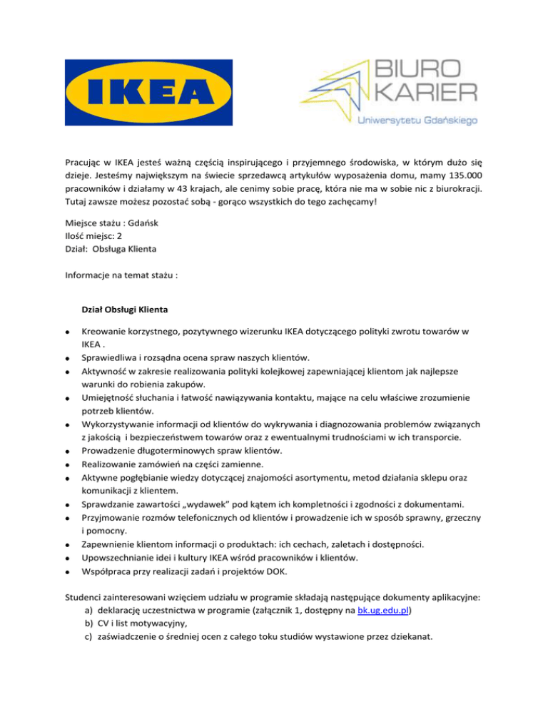 Pracując w IKEA jesteś ważną częścią inspirującego i przyjemnego środowiska, w którym dużo się dzieje. Jesteśmy największym na świecie sprzedawcą artykułów wyposażenia domu, mamy 135.000 pracowników i działamy w 43 krajach, ale cenimy sobie pracę, która nie ma w sobie nic z biurokracji. Tutaj zawsze możesz pozostać sobą - gorąco wszystkich do tego zachęcamy! Miejsce stażu : Gdańsk Ilość miejsc: 2 Dział: Obsługa Klienta Informacje na temat stażu : Dział Obsługi Klienta Kreowanie korzystnego, pozytywnego wizerunku IKEA dotyczącego polityki zwrotu towarów w IKEA . Sprawiedliwa i rozsądna ocena spraw naszych klientów. Aktywność w zakresie realizowania polityki kolejkowej zapewniającej klientom jak najlepsze warunki do robienia zakupów. Umiejętność słuchania i łatwość nawiązywania kontaktu, mające na celu właściwe zrozumienie potrzeb klientów. Wykorzystywanie informacji od klientów do wykrywania i diagnozowania problemów związanych z jakością i bezpieczeństwem towarów oraz z ewentualnymi trudnościami w ich transporcie. Prowadzenie długoterminowych spraw klientów. Realizowanie zamówień na części zamienne. Aktywne pogłębianie wiedzy dotyczącej znajomości asortymentu, metod działania sklepu oraz komunikacji z klientem. Sprawdzanie zawartości „wydawek” pod kątem ich kompletności i zgodności z dokumentami. Przyjmowanie rozmów telefonicznych od klientów i prowadzenie ich w sposób sprawny, grzeczny i pomocny. Zapewnienie klientom informacji o produktach: ich cechach, zaletach i dostępności. Upowszechnianie idei i kultury IKEA wśród pracowników i klientów. Współpraca przy realizacji zadań i projektów DOK. Studenci zainteresowani wzięciem udziału w programie składają następujące dokumenty aplikacyjne: a) deklarację uczestnictwa w programie (załącznik 1, dostępny na bk.ug.edu.pl) b) CV i list motywacyjny, c) zaświadczenie o średniej ocen z całego toku studiów wystawione przez dziekanat. Aplikacje z dopiskiem: STAŻ_IKEA_OBSŁUGA KLIENTA wysyłamy na adres mailowy [email protected] lub składamy osobiście w Biurze Karier : Biuro Karier UG Sopot, Armii Krajowej 110/203 Na aplikacje czekamy do 30 września 2014 Do aplikacji uprzejmie prosimy dołączyć następującą klauzulę: „Wyrażam zgodę na przetwarzanie moich danych osobowych zawartych w mojej ofercie pracy dla potrzeb niezbędnych do realizacji procesu rekrutacji zgodnie z ustawą z dnia 29 sierpnia 1997 r. o ochronie danych osobowych (Dz. U. z 2002 r. Nr 101, poz. 926, ze zm.)”
