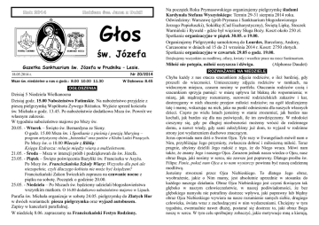 Rok 2014 Rokiem św. Jana z Dukli Głos św. Józefa Gazetka Sanktuarium św. Józefa w Prudniku – Lesie. Nr 20/2014 18.05.2014 r. Msze św. niedzielne u nas o godz.: 8.00 10.00 11.30 W Dębowcu: 8.45 OGŁOSZENIA Dzisiaj 5 Niedziela Wielkanocna Dzisiaj godz. 15.00 Nabożeństwo Fatimskie. Na nabożeństwo przyjdzie z pieszą pielgrzymką Wspólnota Żywego Różańca. Wyjście sprzed kościoła św. Michała o godz. 13.45. Po nabożeństwie dodatkowa Msza św. Powrót we własnym zakresie. W tygodniu nabożeństwo majowe po Mszy św. 20.05. - Wtorek – Święto św. Bernardyna ze Sieny. O godz. 15.00 Msza św. i Spotkanie z pieśnią i poezją Maryjną – program artystyczny chóru „Jutrzenka” oraz poetów z Klubu Ludzi Piszących. Po Mszy św. o 18.00 Wieczór z Biblią: Księga Ezdrasza: relacje między wiarą a małżeństwem. 21.05. - Środa – Msza w intencji próśb i podziękowań do św. Józefa. 23.05. - Piątek – Święto poświęcenia Bazyliki św. Franciszka w Asyżu. Po Mszy św. Franciszkańska Szkoły Wiary: Wszystko dla pań ale niezupełnie, czyli dlaczego kobieta nie może być księdzem? Franciszkański Zakon Świeckich zaprasza na czuwanie nocne z piątku na sobotę. Początek o godzinie 20.00. 25.05. - Niedziela – Po Mszach św. będziemy udzielali błogosławieństwa wszystkim matkom. O 16.00 dodatkowo nabożeństwo majowe w Lipach. Parafia św. Michała organizuje w sobotę 24.05. pielgrzymkę do Zlatych Hor w dwóch wariantach: piesza pielgrzymka oraz wyjazd autobusem. Zapisy w kancelarii parafialnej. W niedzielę 8.06. zapraszamy na Franciszkański Festyn Rodzinny. Na początek Roku Prymasowskiego organizujemy pielgrzymkę śladami Kardynała Stefana Wyszyńskiego: Termin 29-31 sierpnia 2014 roku. Odwiedzimy: Warszawę (grób Prymasa i Sanktuarium błogosławionego Jerzego Popiełuszki), Sokółkę (Cud Eucharystyczny), Świętą Lipkę, Stoczek Warmiński i Rywałd - gdzie był więziony Sługa Boży. Koszt około 250 zł. Spotkanie organizacyjne w piątek 30.05. o 19.00. Organizujemy Pielgrzymkę samolotową do Lourdes, Barcelony, Andory, Carcasonne w dniach od 15 do 21 września 2014 r. Koszt: 2750 złotych. Spotkanie organizacyjne w czwartek 29.05 o godz. 19.00. Dziękujemy wszystkim za modlitwę, ofiary, kwiaty i wszelkie prace na rzecz Sanktuarium. Miłość nie potępia, miłość oczyszcza i dźwiga. (Alphonse Daudet) ROZWAŻANIE NA NIEDZIELĘ Chyba każdy z nas otacza szacunkiem zdjęcia rodziców, o ileż bardziej, gdy przeszli do wieczności. Umieszczamy zdjęcia rodziców w ramkach, na widocznym miejscu, czasem nosimy w portfelu. Otaczaniu rodziców czcią i szacunkiem sprzyja pamięć: w miarę upływu lat blakną złe wspomnienia; w miarę, jak mądrzejmy rozumiemy, surowość rodzicielskich zakazów i kar, dostrzegamy w nich słusznie przejaw miłości rodziców; na ogół idealizujemy tatę i mamę, wskazując na nich, jako na punkt odniesienia dla naszych własnych dzieci. Często po wielu latach jesteśmy w stanie zrozumieć, jak bardzo nas kochali, jak bardzo się dla nas poświęcali, ile im zawdzięczamy. W młodości cieszymy się, gdy po długiej nieobecności możemy wrócić do rodzinnego domu, a nawet wtedy, gdy sami założyliśmy już dom, to wyjazd w rodzinne strony jest wydarzeniem duchowo znaczącym. Jezus opowiada nam dziś o Swoim Ojcu. Tyle razy w Ewangeliach mówił nam o Nim, przybliżając Jego przymioty, zwłaszcza dobroć i miłosierną miłość. Teraz pragnie, abyśmy dzielili Jego radość z tego, że do Niego wraca. Mówi nam także, że znamy Jego i naszego Ojca. Zarazem jednak nasza wiedza o Ojcu, nasz obraz Boga, jaki nosimy w sercu, nie zawsze jest poprawny. Dlatego prośba św. Filipa: Panie, pokaż nam Ojca a to nam wystarczy powinna być naszą codzienną modlitwą. Jesteśmy stworzeni przez Ojca Niebieskiego. To dlatego Jego obraz, wyobrażenie, jakie o Nim mamy, jest absolutnie uprzednie w stosunku do każdego naszego działania. Obraz Ojca Niebieskiego jest czymś tkwiącym tak głęboko w naszym człowieczeństwie, w naszej podświadomości, że bez głębokiego namysłu nie potrafimy dostrzec wpływu, jaki poprawny lub błędny obraz Ojca Niebieskiego wywiera na nasze rozumienie samych siebie, drugiego człowieka, świata wraz z zachodzącymi w nim wydarzeniami. Chciejmy w tym tygodniu, ewentualnie nawet dłużej, postarać się dostrzec to, jaki obraz Boga noszę w sercu. W tym celu spróbujmy zobaczyć, jakie motywacje mną a kierują, jak komentuję to, co się dzieje. Zobaczmy, ile jest w naszym życiu zasługiwania. Bodaj od wczesnego dzieciństwa staramy się zasłużyć na wszystko. Na miłość rodziców próbujemy zasługiwać dobrymi ocenami. Nie chcemy utracić również grona rówieśników, dlatego dzielimy również takie ich zachowania, na które się wewnętrznie nie zgadzamy - jednak lek przed izolacją przeważa. Poniewierana żona stara się rozpaczliwie odzyskać męża, dlatego znosi w milczeniu wyzwiska, upokorzenia, nawet bicie, godzi się nawet na bardzo poważne naruszenie porządku moralnego, bo inaczej on odejdzie. Rodzice z kolei chcą sobie zapewnić miłość dzieci kupowaniem markowej garderoby i drogimi prezentami, albo też pozwalając na wszystko lub prawie wszystko. Iloma to obietnicami i zapewnieniami stara się polityk zapewnić sobie przeliczalną na głosy lub punkty w rankingu popularności, przychylność wyborców! Z drugiej zaś strony, czy my sami nie obwarowujemy naszej życzliwości i miłości wieloma wymogami i warunkami? Co tak naprawdę mamy na myśli mówiąc, że za darmo umarło? Próbujemy w ten sposób poszukać usprawiedliwienia dla naszej interesowności, czy też dajemy wyraz naszemu przekonaniu o najgłębszej istocie stosunków międzyludzkich i gospodarczych? Skąd bierze się nasze - podniesione do rangi prawidła savoir vivre’u – certolenie się przed przyjęciem prezentu? A nasze odwzajemnianie otrzymanych podarków, to jeszcze t