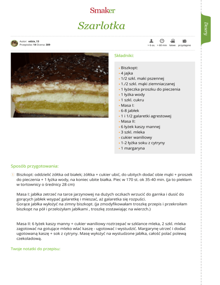 Szarlotka Autor: edzia_13 Przepisów: 14 Ocena: 309 > 6 os. > 60 min łatwe przystępne Składniki: Biszkopt: 4 jajka 1/2 szkl. maki pszennej 1./2 szkl. mąki ziemniaczanej 1 łyżeczka proszku do pieczenia 1 łyżka wody 1 szkl. cukru Masa I: 6-8 jabłek 1 i 1/2 galaretki agrestowej Masa II: 6 łyżek kaszy mannej 3 szkl. mleka cukier waniliowy 1-2 łyżka soku z cytryny 1 margaryna Sposób przygotowania: 1 Biszkopt: oddzielić żółtka od białek; żółtka + cukier ubić, do ubitych dodać obie mąki + proszek do pieczenia + 1 łyżka wody, na koniec ubite białka. Piec w 170 st. ok 35-40 min. (ja to piekłam w tortownicy o średnicy 28 cm) Masa I: jabłka zetrzeć na tarce jarzynowej na dużych oczkach wrzucić do garnka i dusić do gorących jabłek wsypać galaretkę i mieszać, aż galaretka się rozpuści. Gorące jabłka wyłożyć na zimny biszkopt. (ja zmodyfikowałam troszkę przepis i przekroiłam biszkopt na pół i przełożyłam jabłkami , troszkę zostawiając na wierzch.) Masa II: 6 łyżek kaszy manny + cukier waniliowy roztrzepać w szklance mleka, 2 szkl. mleka zagotować na gotujące mleko wlać kaszę - ugotować i wystudzić. Margarynę utrzeć i dodać ugotowaną kaszę + sok z cytryny. Masę wyłożyć na wystudzone jabłka, całość polać polewą czekoladową. Twoje notatki do przepisu: