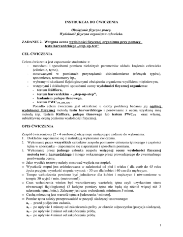 INSTRUKCJA DO ĆWICZENIA Obciążenie fizyczne pracą. Wydolność fizyczna organizmu człowieka. ZADANIE 2. Wstępna ocena wydolności fizycznej organizmu przy pomocy testu harvardzkiego „step-up-test” CEL ĆWICZENIA Celem ćwiczenia jest zapoznanie studentów z: - metodami i sposobami pomiaru niektórych parametrów układu krążenia człowieka (ciśnienie, tętno), - stosowanymi w pomiarach przyrządami: ciśnieniomierze (różnych typów), tętnomierze, termometry itp., - wybranymi skutkami fizjologicznymi obciążenia organizmu wysiłkiem mięśniowym, - wstępnymi i dokładnymi sposobami oceny wydolności fizycznej organizmu: - testem Rűffiera, - testem harvardzkim - „step-up-step”, - badaniem pułapu tlenowego, - testem PWC170, (150, 130) . Ponadto celem ćwiczenia jest określenie u osoby poddanej badaniu jej ogólnej wydolności fizycznej metodą testu harvardzkiego i porównanie z oceną uzyskaną inną metodą (np. testem Rűffiera, pułapu tlenowego lub testem PWC170 oraz własną, subiektywną oceną poziomu wydolności fizycznej. OPIS ĆWICZENIA Zespół ćwiczeniowy (2 - 4 osobowy) otrzymuje następujące zadanie do wykonania: 1. Dokładne zapoznanie się z instrukcją wykonania ćwiczenia. 2. Wykonanie przez wszystkich członków zespołu pomiarów ciśnienia tętniczego i częstości tętna w spoczynku – zapoznanie się z aparatami i sposobem pomiaru. 3. Wykonanie przez jednego członka zespołu wstępnej oceny wydolności fizycznej metodą testu harvardzkiego i innego wskazanego przez prowadzącego do ewentualnego porównania oceny. • Jako wysiłek testowy należy stosować wejścia na stopień. • Wysokość stopni jest zróżnicowana w zależności od płci i wieku ( dla osób do 45 roku życia przyjęta wysokość stopnia wynosi: - 33 cm dla kobiet i 40 cm dla mężczyzn. • Tempo wchodzenia powinno być jednakowe dla kobiet i mężczyzn i równomierne w tempie 30 wyjść / min. (metronom!). • Czas wchodzenia winien być warunkowany wartością tętna czyli uzyskaniem stanu równowagi fizjologicznej (3 kolejne pomiary tętna nie będą się różnić więcej niż 3 uderzenia tętna /min.). Zalecany jest czas wchodzenia minimum 5 minut. • Cechą mierzoną jest wartość tętna a [uderzenia / minutę]. • Pomiar tętna należy przeprowadzić w pozycji siedzącej testowanego: ao - przed podjęciem zadania, a1 - po upływie 1 minuty od zakończenia próby ,w okresie odpoczynku (pozycja siedząca), a2 - po upływie 2 minut od zakończenia próby, a3 - po upływie 4 minut od zakończenia próby. 1 • Obliczyć wskaźnik wydolności fizycznej HI według poniższego wzoru: czas wchodzenia [sek] x 100 HI = ---------------------------------------------2 (a1 + a2 + a3 ) • Uzyskany wynik należy porównać z wartościami zamieszczonymi poniżej uzyskując słowną klasyfikację wydolności fizycznej organizmu. • Orientacyjna ocena wydolności organizmu według testu „step-up-test”: Powyżej 90 89 - 80 70 - 65 64 - 55 poniżej 55 - bardzo dobra dobra kondycja przeciętna poniżej przeciętnej zła OPRACOWANIE ĆWICZENIA 1. Wykonać ćwiczenie według punktów z opisu powyżej. 2. Wyniki zapisać w tabeli: Nazwisko Imię testowanego 1. 2. 3… wiek /płeć wartości tętna a0 a1 a2 a3 wskaźnik HI Uwagi (porównanie) 3. Podać ocenę wydolności fizycznej według przedstawionej skali. 4. Napisać wnioski dotyczące wydolności organizmu w stosunku do stopnia trudności pracy fizycznej, którą ma testowany wykonać. 5. Uwagi własne studenta. PRZYRZĄDY, POMOCE, TABLICE Do wykonania ćwiczenia zespołowi przydzielone zostają: - stanowisko z wyposażeniem obejmującym niezbędne pomoce: - stopnie do wchodzenia - aparat do pomiaru ciśnienia krwi, - tętnomierz (napierśny lub inny), - metronom, - leżanka, - instrukcja ćwiczenia. LITERATURA 1. Koradecka D. i inni (1977) Bezpieczeństwo Pracy i Ergonomia Warszawa, CIOP. 2. Knapik S. i inni (1996) Ergonomia i ochrona pracy Kraków, AGH – skrypt 1464. 3. Wykowska M. (1995) Ćwiczenia laboratoryjne z ergonomii Kraków, AGH – skrypt 1412. 2