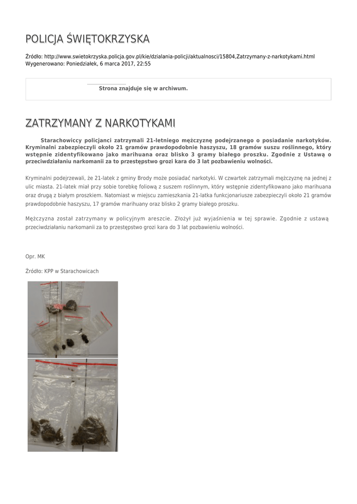POLICJA ŚWIĘTOKRZYSKA Źródło: http://www.swietokrzyska.policja.gov.pl/kie/dzialania-policji/aktualnosci/15804,Zatrzymany-z-narkotykami.html Wygenerowano: Poniedziałek, 6 marca 2017, 22:55 Strona znajduje się w archiwum. ZATRZYMANY Z NARKOTYKAMI Starachowiccy policjanci zatrzymali 21-letniego mężczyznę podejrzanego o posiadanie narkotyków. Kryminalni zabezpieczyli około 21 gramów prawdopodobnie haszyszu, 18 gramów suszu roślinnego, który wstępnie zidentyfikowano jako marihuana oraz blisko 3 gramy białego proszku. Zgodnie z Ustawą o przeciwdziałaniu narkomanii za to przestępstwo grozi kara do 3 lat pozbawieniu wolności. Kryminalni podejrzewali, że 21-latek z gminy Brody może posiadać narkotyki. W czwartek zatrzymali mężczyznę na jednej z ulic miasta. 21-latek miał przy sobie torebkę foliową z suszem roślinnym, który wstępnie zidentyfikowano jako marihuana oraz drugą z białym proszkiem. Natomiast w miejscu zamieszkania 21-latka funkcjonariusze zabezpieczyli około 21 gramów prawdopodobnie haszyszu, 17 gramów marihuany oraz blisko 2 gramy białego proszku. Mężczyzna został zatrzymany w policyjnym areszcie. Złożył już wyjaśnienia w tej sprawie. Zgodnie z ustawą przeciwdziałaniu narkomanii za to przestępstwo grozi kara do 3 lat pozbawieniu wolności. Opr. MK Źródło: KPP w Starachowicach Ocena: 0/5 (0) Tweetnij