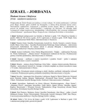 IZRAEL - JORDANIA Śladami Jezusa i Mojżesza (10 dni – samolotowo-autokarowa) Pielgrzymka do Ziemi Świętej jest jedyną w swoim rodzaju. To ziemia umiłowana i wybrana przez Boga. Ziemia, gdzie zrodziła się Ewangelia, w której tkwią korzenie naszej wiary. Nawiedzenie sanktuariów związanych z ziemskim życiem Jezusa, Maryi i Apostołów, to powrót do kolebki wiary chrześcijańskiej i rodzącego się Kościoła. To mozaika ludzi wyznających religię mojżeszową, muzułmańską i chrześcijańską. Jest wyrazem solidarności z franciszkanami – opiekunami Miejsc Świętych oraz z lokalnym Kościołem w Jerozolimie. 1 dzień: Spotkanie pielgrzymów na lotnisku w Berlinie o godz. 7.55. Dojazd na lotnisko z parafii. Odlot do Tel Avivu o godz. 10.55. Lądowanie w Izraelu o godz. 16.00. Hajfa. Góra Karmel – sanktuarium Stella Maris. Zakwaterowanie w Nazarecie. 2 dzień: Nazaret. Grota i bazylika Zwiastowania, kościół św. Józefa, Nazaret z czasów Jezusa, źródło Maryi. Góra Tabor – bazylika Przemienienia Pańskiego. Kana Galilejska – odnowienie przyrzeczeń małżeńskich. Po kolacji udział w procesji Maryjnej i międzynarodowej modlitwie różańcowej w bazylice Zwiastowania. 3 dzień: Jezioro Galilejskie. Góra Ośmiu Błogosławieństw. Tabgha – sanktuarium Prymatu św. Piotra. Kafarnaum – „Miasto Jezusa”. Przepłynięcie statkiem do Ein Gev. Przekroczenie granicy izraelsko-jordańskiej. Zakwaterowanie w Ammanie. 4 dzień: Amman – amfiteatr z czasów rzymskich i cytadela. Jerash – jedno z najlepiej zachowanych miast z czasów rzymskich. 5 dzień: Betania – miejsce chrztu Pańskiego. Góra Nebo – miejsce śmierci proroka Mojżesza. Madaba – prawosławny kościół św. Jerzego, w którym znajduje się słynna mozaikowa mapa z VI wieku. Zakwaterowanie w Petrze. 6 dzień: Petra. Zwiedzanie miasta wykutego w skale: skarbiec, amfiteatr, nekropolia, trybunał i więzienie. Przekroczenie granicy jordańsko-izraelskiej. Zakwaterowanie w Jerychu. 7 dzień: Jerycho – panorama Góry Kuszenia i sykomora. Kąpiel w Morzu Martwym. Przejazd przez Pustynię Judzką. Betania. Sanktuarium „Przyjaciół Pana Jezusa”: Łazarza, Marty i Marii. Zwiedzanie bazyliki Bożego Grobu i Kalwarii. Zakwaterowanie w Betlejem. 8 dzień: Jerozolima. Sanktuaria na Górze Oliwnej: Wniebowstąpienie, „Pater Noster”, „Dominus Flevit”, panorama Jerozolimy, Grób Maryi, Ogród Oliwny, bazylika Agonii. Kaplica Biczowania i Włożenia Krzyża. Nabożeństwo Drogi Krzyżowej ulicami Starej Jerozolimy. Zwiedzanie bazyliki Bożego Grobu. 9 dzień: Pole Pasterzy. Betlejem. Grota i bazylika Narodzenia. Abu Ghosz – jedno z trzech biblijnych Emaus. Syjon Chrześcijański: Wieczernik, kościół Zaśnięcia NMP. Mur Płaczu. Czas na prywatną modlitwę w bazylice Bożego Grobu i zakupy. 10 dzień: Odlot z Tel Avivu do kraju o godz. 6.20. Lądowanie w Berlinie o godz. 9.50 i zakończenie pielgrzymki, powrót do parafii. Codziennie odprawiana jest Msza święta Organizatorzy zastrzegają sobie możliwość zmian w programie W Izraelu oprowadza duchowny z Polski; w Jordanii miejscowy przewodnik Kapłani zabierają albę i białą stułę TERMIN PIELGRZYMKI 12-21 września 2014 roku CENA PIELGRZYMKI 2100 zł i 1190 USD (dopłata za pokój jednoosobowy wynosi 420 USD) Osoby przewlekle chore zobowiązane są do wykupienia dodatkowego ubezpieczenia, którego koszt wynosi 200 zł Zbiórka na dojazd i powrót z lotniska.Podaje ks. Adam ORGANIZATORZY ZAPEWNIAJĄ przelot samolotem na trasie Berlin-Tel Aviv i Tel Aviv-Berlin pełne wyżywienie (śniadanie, obiad i kolacja) zakwaterowanie w hotelach (pokoje 2 lub 3 osobowe z łazienką) autokar do dyspozycji grupy, przewodnik po miejscach świętych wszystkie bilety wstępu, taksówka na Górę Tabor, statek po Jeziorze Galilejskim wiza jordańska, opłaty przekroczenia granic, ubezpieczenie przewodnik-śpiewnik, znak grupy, certyfikat pielgrzyma BLIŻSZE INFORMACJE Ks. Adam Tel. 608538953 Parafia św. Faustyny Szczecin