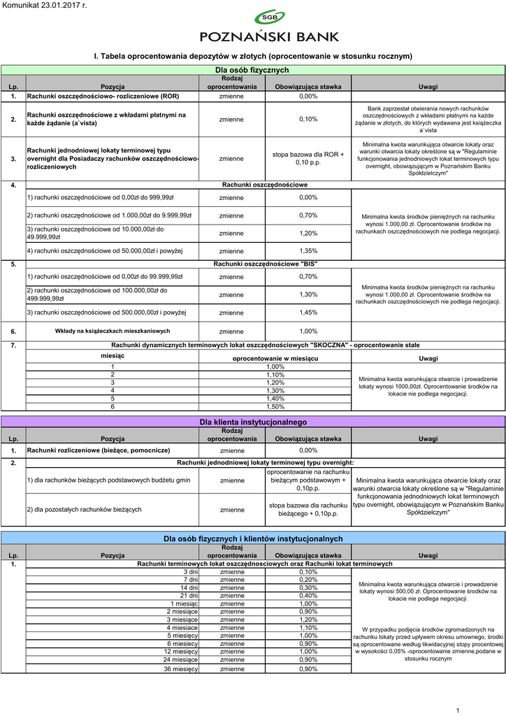 Komunikat 23.01.2017 r. I. Tabela oprocentowania depozytów w złotych (oprocentowanie w stosunku rocznym) Dla osób fizycznych Lp. 1. Pozycja Rachunki oszczędnościowo- rozliczeniowe (ROR) 2. Rachunki oszczędnościowe z wkładami płatnymi na każde żądanie (a`vista) 3. Rachunki jednodniowej lokaty terminowej typu overnight dla Posiadaczy rachunków oszczędnościoworozliczeniowych zmienne 0,10% Bank zaprzestał otwierania nowych rachunków oszczędnościowych z wkładami płatnymi na każde żądanie w złotych, do których wydawana jest książeczka a`vista zmienne stopa bazowa dla ROR + 0,10 p.p. Minimalna kwota warunkująca otwarcie lokaty oraz warunki otwarcia lokaty określone są w "Regulaminie funkcjonowania jednodniowych lokat terminowych typu overnight, obowiązującym w Poznańskim Banku Spółdzielczym" 1) rachunki oszczędnościowe od 0,00zł do 999,99zł zmienne 0,00% 2) rachunki oszczędnościowe od 1.000,00zł do 9.999,99zł zmienne 0,70% 3) rachunki oszczędnościowe od 10.000,00zł do 49.999,99zł zmienne 1,20% 4) rachunki oszczędnościowe od 50.000,00zł i powyżej zmienne 1,35% Uwagi Minimalna kwota środków pieniężnych na rachunku wynosi 1.000,00 zł. Oprocentowanie środków na rachunkach oszczędnościowych nie podlega negocjacji. Rachunki oszczędnościowe "BIS" 5. 7. Obowiązująca stawka 0,00% Rachunki oszczędnościowe 4. 6. Rodzaj oprocentowania zmienne 1) rachunki oszczędnościowe od 0,00zł do 99.999,99zł zmienne 0,70% 2) rachunki oszczędnościowe od 100.000,00zł do 499.999,99zł zmienne 1,30% 3) rachunki oszczędnościowe od 500.000,00zł i powyżej zmienne 1,45% zmienne 1,00% Wkłady na książeczkach mieszkaniowych Minimalna kwota środków pieniężnych na rachunku wynosi 1.000,00 zł. Oprocentowanie środków na rachunkach oszczędnościowych nie podlega negocjacji. Rachunki dynamicznych terminowych lokat oszczędnościowych "SKOCZNA" - oprocentowanie stałe miesiąc oprocentowanie w miesiącu 1,00% 1,10% 1,20% 1,30% 1,40% 1,50% 1 2 3 4 5 6 Uwagi Minimalna kwota warunkująca otwarcie i prowadzenie lokaty wynosi 1000,00zł. Oprocentowanie środków na lokacie nie podlega negocjacji. Dla klienta instytucjonalnego Lp. Pozycja Rodzaj oprocentowania Obowiązująca stawka zmienne 0,00% Uwagi 1. Rachunki rozliczeniowe (bieżące, pomocnicze) 2. Rachunki jednodniowej lokaty terminowej typu overnight: oprocentowanie na rachunku 1) dla rachunków bieżących podstawowych budżetu gmin bieżącym podstawowym + zmienne Minimalna kwota warunkująca otwarcie lokaty oraz 0,10p.p. warunki otwarcia lokaty określone są w "Regulaminie funkcjonowania jednodniowych lokat terminowych stopa bazowa dla rachunku typu overnight, obowiązującym w Poznańskim Banku 2) dla pozostałych rachunków bieżących zmienne Spółdzielczym" bieżącego + 0,10p.p. Dla osób fizycznych i klientów instytucjonalnych Lp. 1. Pozycja Rodzaj oprocentowania Uwagi Obowiązująca stawka Rachunki terminowych lokat oszczędnosciowych oraz Rachunki lokat terminowych 3 dni zmienne 0,10% 7 dni zmienne 0,20% Minimalna kwota warunkująca otwarcie i prowadzenie 14 dni zmienne 0,30% lokaty wynosi 500,00 zł. Oprocentowanie środków na 21 dni zmienne 0,40% lokacie nie podlega negocjacji. 1 miesiąc zmienne 1,00% 2 miesiące zmienne 0,90% 3 miesiące zmienne 1,20% 4 miesiace zmienne 1,10% W przypadku podjęcia środków zgromadzonych na 5 miesięcy zmienne 1,00% rachunku lokaty przed upływem okresu umownego, środki 6 miesiecy zmienne 0,90% są oprocentowane według likwidacyjnej stopy procentowej w wysokości 0,05% -oprocentowanie zmienne,podane w 12 miesięcy zmienne 1,00% stosunku rocznym 24 miesiące zmienne 0,90% 36 miesięcy zmienne 0,90% 1 2. Rachunki terminowych lokat oszczędnosciowych oraz Rachunki lokat terminowych 3 dni stałe 0,10% Minimalna kwota warunkująca otwarcie i prowadzenie 7 dni stałe 0,20% lokaty wynosi 500,00 zł. Przy wpłatach na rachunek lokaty kwoty nie mniejszej niż 50.000,00 zł istnieje możliwość 14 dni stałe 0,30% negocjowania stawki procentowej. 21 dni stałe 0,40% 1 miesiąc stałe 1,00% W przypadku podjęcia środków zgromadzonych na 2 miesiące stałe 1,10% rachunku lokaty przed upływem okresu umownego, środki 3 miesiące stałe 1,20% są oprocentowane według likwidacyjnej stopy procentowej 6 miesięcy stałe 1,30% w wysokości 0,05% -oprocentowanie zmienne, podane w stosunku rocznym 12 miesięcy stałe 1,60% Rachunki terminowych lokat oszczędnosciowych oraz Rachunki lokat terminowych 3. 4. 100 dni stałe 1,30% 4 miesiące stałe 1,30% 5 miesięcy stałe 1,30% stałe 3 dni 0,10% 0,10% 7 dni 0,20% 0,20% 14 dni 0,30% 0,30% Minimalna kwota warunkująca otwarcie i prowadzenie lokaty wynosi 500,00 zł. Oprocentowanie środków na 21 dni 0,40% 0,40% lokacie nie podlega negocjacji. 100 dni x x 1 miesiąc 1,00% 1,00% 2 miesiące 0,90% 1,10% 3 miesiące 1,20% 1,20% 4 miesiące 1,10% x W przypadku podjęcia środków zgromadzonych na 5 miesięcy 1,00% x rachunku lokaty przed upływem okresu umownego, środki są oprocentowane według likwidacyjnej stopy procentowej 6 miesięcy 0,90% 1,30% w wysokości 0,05% -oprocentowanie zmienne, podane w 12 miesięcy 1,00% 1,60% stosunku rocznym 24 miesiące 0,90% x 36 miesięcy 0,90% x Rachunki terminowych lokat oszczędnościowych oraz Rachunki lokat terminowych zakładane w ramach promocji lokat SGB- Lato 2016 5. Pozycja Rodzaj oprocentowania Obowiązująca stawka 3 miesiące stałe 1,20% 6 miesięcy 7. W przypadku podjęcia środków zgromadzonych na rachunku lokaty przed upływem okresu umownego, środki są oprocentowane według likwidacyjnej stopy procentowej w wysokości 0,05% -oprocentowanie zmienne, podane w stosunku rocznym Rachunki terminowych lokat oszczędnosciowych oraz Rachunki lokat terminowych otwieranych przez kanały bankowości elektronicznej zmienne 6. Minimalna kwota warunkująca otwarcie i prowadzenie lokaty wynosi 500,00 zł. Oprocentowanie środków na lokacie nie podlega negocjacji. stałe 1,
