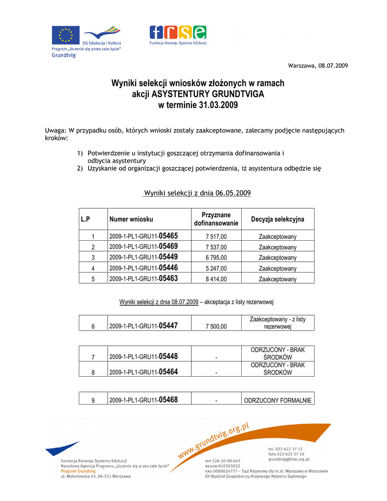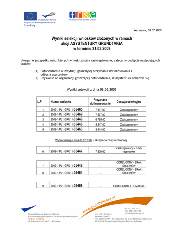 Warszawa, 08.07.2009 Wyniki selekcji wniosków złożonych w ramach akcji ASYSTENTURY GRUNDTVIGA w terminie 31.03.2009 Uwaga: W przypadku osób, których wnioski zostały zaakceptowane, zalecamy podjęcie następujących kroków: 1) Potwierdzenie u instytucji goszczącej otrzymania dofinansowania i odbycia asystentury 2) Uzyskanie od organizacji goszczącej potwierdzenia, iż asystentura odbędzie się Wyniki selekcji z dnia 06.05.2009 L.P Numer wniosku Przyznane dofinansowanie Decyzja selekcyjna 1 2009-1-PL1-GRU11-05465 7 517,00 Zaakceptowany 2 2009-1-PL1-GRU11-05469 7 537,00 Zaakceptowany 3 2009-1-PL1-GRU11-05449 6 795,00 Zaakceptowany 4 2009-1-PL1-GRU11-05446 5 247,00 Zaakceptowany 5 2009-1-PL1-GRU11-05463 8 414,00 Zaakceptowany Wyniki selekcji z dnia 08.07.2009 – akceptacja z listy rezerwowej Zaakceptowany - z listy rezerwowej 6 2009-1-PL1-GRU11-05447 7 500,00 7 2009-1-PL1-GRU11-05448 - 8 2009-1-PL1-GRU11-05464 - ODRZUCONY - BRAK ŚRODKÓW ODRZUCONY - BRAK ŚRODKÓW 9 2009-1-PL1-GRU11-05468 - ODRZUCONY FORMALNIE