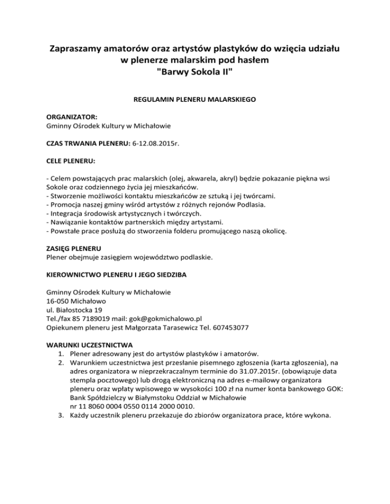 Zapraszamy amatorów oraz artystów plastyków do wzięcia udziału w plenerze malarskim pod hasłem "Barwy Sokola II" REGULAMIN PLENERU MALARSKIEGO ORGANIZATOR: Gminny Ośrodek Kultury w Michałowie CZAS TRWANIA PLENERU: 6-12.08.2015r. CELE PLENERU: - Celem powstających prac malarskich (olej, akwarela, akryl) będzie pokazanie piękna wsi Sokole oraz codziennego życia jej mieszkańców. - Stworzenie możliwości kontaktu mieszkańców ze sztuką i jej twórcami. - Promocja naszej gminy wśród artystów z różnych rejonów Podlasia. - Integracja środowisk artystycznych i twórczych. - Nawiązanie kontaktów partnerskich między artystami. - Powstałe prace posłużą do stworzenia folderu promującego naszą okolicę. ZASIĘG PLENERU Plener obejmuje zasięgiem województwo podlaskie. KIEROWNICTWO PLENERU I JEGO SIEDZIBA Gminny Ośrodek Kultury w Michałowie 16-050 Michałowo ul. Białostocka 19 Tel./fax 85 7189019 mail: [email protected] Opiekunem pleneru jest Małgorzata Tarasewicz Tel. 607453077 WARUNKI UCZESTNICTWA 1. Plener adresowany jest do artystów plastyków i amatorów. 2. Warunkiem uczestnictwa jest przesłanie pisemnego zgłoszenia (karta zgłoszenia), na adres organizatora w nieprzekraczalnym terminie do 31.07.2015r. (obowiązuje data stempla pocztowego) lub drogą elektroniczną na adres e-mailowy organizatora pleneru oraz wpłaty wpisowego w wysokości 100 zł na numer konta bankowego GOK: Bank Spółdzielczy w Białymstoku Oddział w Michałowie nr 11 8060 0004 0550 0114 2000 0010. 3. Każdy uczestnik pleneru przekazuje do zbiorów organizatora prace, które wykona. ORGANIZACJA PLENERU Organizatorzy zapewniają: - noclegi, wyżywienie, - materiały plastyczne, - umożliwiają korzystanie z pomieszczeń Domu Ludowego i Centrum Produktu Lokalnego w Sokolu, - wystawę na zakończenie pleneru. POSTANOWIENIA KOŃCOWE 1. Uczestnicy wnoszą opłatę wpisowego w kwocie 100 zł do dnia 31.07.2015r. na numer konta bankowego GOK Bank Spółdzielczy w Białymstoku Oddział w Michałowie nr 11 8060 0004 0550 0114 2000 0010 2. Uczestnicy przyjeżdżają na koszt własny w terminie 6 sierpnia (czwartek). 3. Uczestnicy pleneru zobowiązani są do przestrzegania ogólnie przyjętych zasad koleżeńskiej współpracy. 4. Uczestnicy winni posiadać aktualne ubezpieczenie. UWAGA! Ilość miejsc ograniczona. KARTA ZGŁOSZENIA IMIĘ: NAZWISKO: WIEK: ADRES ZAMIESZKANIA: NUMER TELEFONU: MAIL: