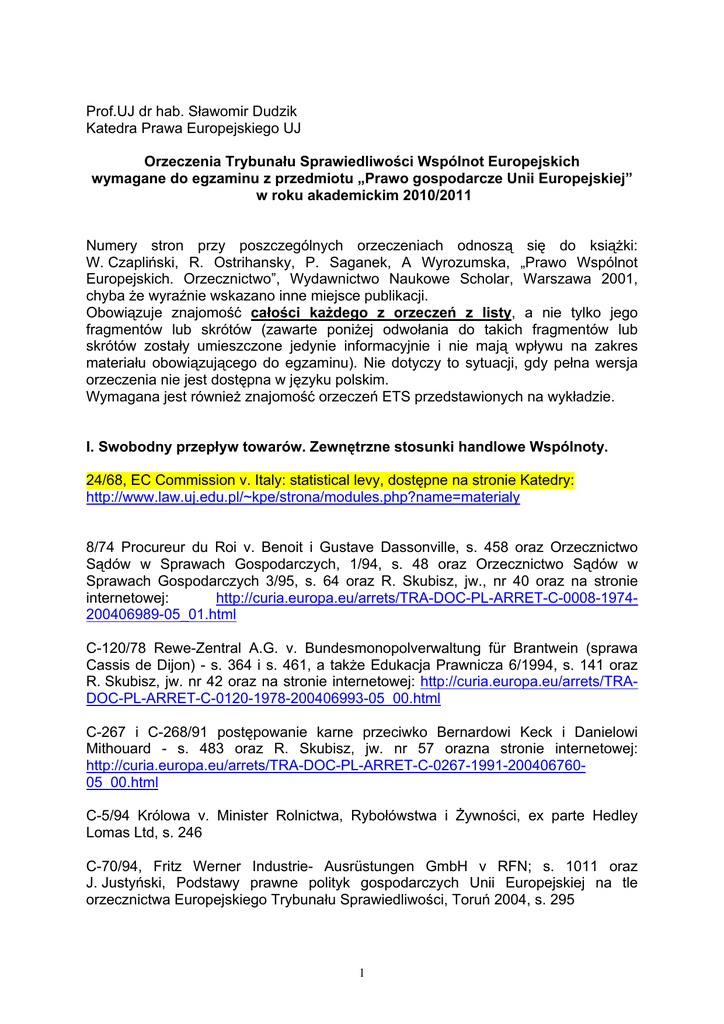 Prof.UJ dr hab. Sławomir Dudzik Katedra Prawa Europejskiego UJ Orzeczenia Trybunału Sprawiedliwości Wspólnot Europejskich wymagane do egzaminu z przedmiotu „Prawo gospodarcze Unii Europejskiej” w roku akademickim 2010/2011 Numery stron przy poszczególnych orzeczeniach odnoszą się do książki: W. Czapliński, R. Ostrihansky, P. Saganek, A Wyrozumska, „Prawo Wspólnot Europejskich. Orzecznictwo”, Wydawnictwo Naukowe Scholar, Warszawa 2001, chyba że wyraźnie wskazano inne miejsce publikacji. Obowiązuje znajomość całości każdego z orzeczeń z listy, a nie tylko jego fragmentów lub skrótów (zawarte poniżej odwołania do takich fragmentów lub skrótów zostały umieszczone jedynie informacyjnie i nie mają wpływu na zakres materiału obowiązującego do egzaminu). Nie dotyczy to sytuacji, gdy pełna wersja orzeczenia nie jest dostępna w języku polskim. Wymagana jest również znajomość orzeczeń ETS przedstawionych na wykładzie. I. Swobodny przepływ towarów. Zewnętrzne stosunki handlowe Wspólnoty. 24/68, EC Commission v. Italy: statistical levy, dostępne na stronie Katedry: http://www.law.uj.edu.pl/~kpe/strona/modules.php?name=materialy 8/74 Procureur du Roi v. Benoit i Gustave Dassonville, s. 458 oraz Orzecznictwo Sądów w Sprawach Gospodarczych, 1/94, s. 48 oraz Orzecznictwo Sądów w Sprawach Gospodarczych 3/95, s. 64 oraz R. Skubisz, jw., nr 40 oraz na stronie internetowej: http://curia.europa.eu/arrets/TRA-DOC-PL-ARRET-C-0008-1974200406989-05_01.html C-120/78 Rewe-Zentral A.G. v. Bundesmonopolverwaltung für Brantwein (sprawa Cassis de Dijon) - s. 364 i s. 461, a także Edukacja Prawnicza 6/1994, s. 141 oraz R. Skubisz, jw. nr 42 oraz na stronie internetowej: http://curia.europa.eu/arrets/TRADOC-PL-ARRET-C-0120-1978-200406993-05_00.html C-267 i C-268/91 postępowanie karne przeciwko Bernardowi Keck i Danielowi Mithouard - s. 483 oraz R. Skubisz, jw. nr 57 orazna stronie internetowej: http://curia.europa.eu/arrets/TRA-DOC-PL-ARRET-C-0267-1991-20040676005_00.html C-5/94 Królowa v. Minister Rolnictwa, Rybołówstwa i Żywności, ex parte Hedley Lomas Ltd, s. 246 C-70/94, Fritz Werner Industrie- Ausrüstungen GmbH v RFN; s. 1011 oraz J. Justyński, Podstawy prawne polityk gospodarczych Unii Europejskiej na tle orzecznictwa Europejskiego Trybunału Sprawiedliwości, Toruń 2004, s. 295 1 C-366/04, Georg Schwarz v. Bürgermeister der Landeshauptstadt Salzburg, dostępne na stronie internetowej: http://eurlex.europa.eu/LexUriServ/LexUriServ.do?uri=CELEX:62004J0366:PL:HTML C-265/95, Komisja Wspólnot Europejskich v. Republika Francuska, dostępne na stronie internetowej: http://eurlex.europa.eu/LexUriServ/LexUriServ.do?uri=CELEX:61995J0265:PL:HTML II. Swobodny przepływ osób. 66/85, Lawrie-Blum v. Kraj Badenia-Wirtembergia - str. 501 oraz R. Skubisz, jw., nr 77. 222/86, Union nationale des entraîneurs et cadres techniques professionnels du football v. Georges Heylens i inni, s. 578, http://www.doc.ukie.gov.pl/dt/61986J0222.doc C-415/93, Union Royale Belge des Societes de Football Association ASBL i inni v. Jean-Marc Bosman i inni – str. 564 oraz R. Skubisz, jw., nr 93 115 i 116/81, Rezguia Adoui v. Belgia i miasto Liège, Dominique Cornuaille v. Belgia, s. 550 oraz R. Skubisz, jw., nr 73, Case C-413/99, Baumbast and R. v. Secretary of State for the Home Department, Prawo Unii Europejskiej. Zagadnienia systemowe [red.] J. Barcz, wydanie drugie, uzupełnione, Wydawnictwo Prawo i Praktyka Gospodarcza, Warszawa 2003, s. 549550 oraz na stronie internetowej: http://curia.europa.eu/jurisp/cgibin/form.pl?lang=pl&newform=newform&Submit=Szukaj&alljur=alljur&jurcdj=jurcdj&ju rtpi=jurtpi&jurtfp=jurtfp&alldocrec=alldocrec&docj=docj&docor=docor&docop=docop& docav=docav&docsom=docsom&docinf=docinf&alldocnorec=alldocnorec&docnoj=do cnoj&docnoor=docnoor&radtypeord=on&typeord=ALL&docnodecision=docnodecisio n&allcommjo=allcommjo&affint=affint&affclose=affclose&numaff=C413%2F99&ddatefs=&mdatefs=&ydatefs=&ddatefe=&mdatefe=&ydatefe=&nomusuel =&domaine=&mots=&resmax=100 C-100/01, Ministre de l'Intérieur v Aitor Oteiza Olazabal, dostępne na stronie internetowej: http://eurlex.europa.eu/LexUriServ/LexUriServ.do?uri=CELEX:62001J0100:PL:HTML C-456/02, Michel Trojani v Centre public d'aide sociale de Bruxelles (CPAS), dostępne na stronie internetowej: http://curia.europa.eu/jurisp/cgibin/form.pl?lang=pl&alljur=alljur&jurcdj=jurcdj&jurtpi=jurtpi&jurtfp=jurtfp&numaff=&no musuel=trojani&docnodecision=docnodecision&allcommjo=allcommjo&affint=affint&a ffclose=affclose&alldocrec=alldocrec&docor=docor&docav=docav&docsom=docsom &docinf=docinf&alldocnorec=alldocnorec&docnoor=docnoor&radtypeord=on&newfor 2 m=newform&docj=docj&docop=docop&docnoj=docnoj&typeord=ALL&domaine=&mo ts=&resmax=100&Submit=Rechercher III. Swoboda zakładania przedsiębiorstw, świadczenia usług i przepływu kapitału. Prawo spółek 2/74, J. Reyners v. Państwo belgijskie, str. 592 oraz R. Skubisz, jw., nr 86. 81/87, The Queen v. H.M. Treasury and Commissioners of Inland Revenue, ex parte Daily Mail, str. 617 C-212/97, Centros v. Erhvers – og Selbskabsstyrelsen, s. 621 C-208/00, Überseering, „Przegląd Prawa Europejskiego” 2003, nr 2 C-411/03, SEVIC Systems AG, dostępne na stronie internetowej: http://curia.europa.eu/jurisp/cgibin/form.pl?lang=pl&newform=newform&Submit=Szukaj&alljur=alljur&jurcdj=jurcdj&ju rtpi=jurtpi&jurtfp=jurtfp&alldocrec=alldocrec&docj=docj&docor=docor&docop=docop& docav=docav&docsom=docsom&docinf=docinf&alldocnorec=alldocnorec&docnoj=do cnoj&docnoor=docnoor&radtypeord=on&typeord=ALL&docnodecision=docnodecisio n&allcommjo=allcommjo&affint=affint&affclose=affclose&numaff=c411%2F03&ddatefs=&mdatefs=&ydatefs=&ddatefe=&mdatefe=&ydatefe=&nomusuel =&domaine=&mots=&resmax=100 C-159/90, Society for the Protection of Unborn Children v. S. Grogan, str. 627 oraz R. Skubisz, jw., nr 97, C-384/93, Alpine Investment BV v. Minister Finansów, str. 653 oraz R. Skubisz, jw., nr 99. C-55/94, R. Gebha