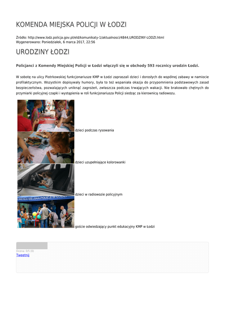 KOMENDA MIEJSKA POLICJI W ŁODZI Źródło: http://www.lodz.policja.gov.pl/eld/komunikaty-1/aktualnosci/4844,URODZINY-LODZI.html Wygenerowano: Poniedziałek, 6 marca 2017, 22:56 URODZINY ŁODZI Policjanci z Komendy Miejskiej Policji w Łodzi włączyli się w obchody 593 rocznicy urodzin Łodzi. W sobotę na ulicy Piotrkowskiej funkcjonariusze KMP w Łodzi zapraszali dzieci i dorosłych do wspólnej zabawy w namiocie profilaktycznym. Wszystkim dopisywały humory, była to też wspaniała okazja do przypomnienia podstawowych zasad bezpieczeństwa, pozwalających uniknąć zagrożeń, zwłaszcza podczas trwających wakacji. Nie brakowało chętnych do przymiarki policyjnej czapki i wystąpienia w roli funkcjonariusza Policji siedząc za kierownicą radiowozu. dzieci podczas rysowania dzieci uzupełniające kolorowanki dzieci w radiowozie policyjnym goście odwiedzający punkt edukacyjny KMP w Łodzi Ocena: 0/5 (0) Tweetnij