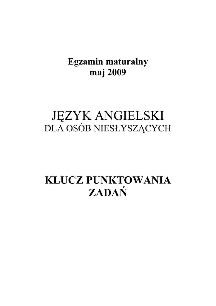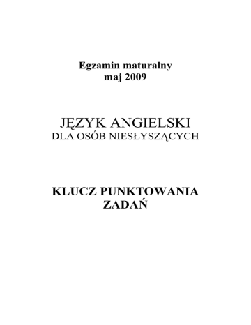 Egzamin maturalny maj 2009 JĘZYK ANGIELSKI DLA OSÓB NIESŁYSZĄCYCH KLUCZ PUNKTOWANIA ZADAŃ ROZUMIENIE PISANEGO TESKTU Zadanie 1. Jednostka testu Poprawna odpowiedź (1 pkt) 1. T 2. F 3. T 4. F 5. T Zadanie 2. Jednostka testu 1. 2. 3. Przykładowe poprawne odpowiedzi. Craig lives in England/ Britain/ the UK. Craig lives with his sister, mum and dad. Craig lives with his family. They watch TV. Craig wears a school uniform. 4. 5. Craig wears a white shirt, a blue sweatshirt and grey trousers. He washes the dishes. Zadanie 3. Jednostka testu Poprawna odpowiedź (1 pkt) 1. B 2. B 3. A 4. A Strona 2 z 6 Ocenianie (0 - 2 pkt) 2 pkt – odpowiedź zgodna z tekstem i pytaniem, poprawna językowo 1 pkt – odpowiedź zgodna z tekstem i pytaniem, błędy językowe w niewielkim stopniu zakłócają komunikację 0 pkt – odpowiedź niezgodna z tekstem i/lub pytaniem, błędy językowe uniemożliwiają komunikację Jeżeli zdający nie odpowiada całym zdaniem, otrzymuje maksimum 1 punkt. Zadanie 4. Poprawna Jednostka odpowiedź testu (1 pkt) 1. different 2. Asia 3. fewer 4. tiring 5. more 6. health REAGOWANIE JĘZYKOWE W CODZIENNYCH SYTUACJACH Zadanie 5. Poprawna Jednostka odpowiedź testu (1 pkt) 1. D 2. C 3. G 4. A 5. B 6. E Zadanie 6. Jednostka testu Poprawna odpowiedź (1 pkt) 1. matter 2. well 3. sore 4. runny 5. temperature 6. flu 7. stay Strona 3 z 6 Zadanie 7. Jednostka testu Przykładowe poprawne odpowiedzi 1. There are two children in the photograph. I can see two girls in the picture. 2. They are on a bus/train. 3. They are going home/on holiday. 4. They are sleeping because they are tired. 5. 6. I like travelling by car because it is fast. My favourite type of transport is plane because it is comfortable. I usually play with friends. I usually go abroad with my parents. Ocenianie (0 - 2 pkt) 2 pkt – odpowiedź zgodna z pytaniem oraz obrazkiem, poprawna językowo 1 pkt – odpowiedź zgodna z pytaniem oraz obrazkiem, błędy językowe w niewielkim stopniu zakłócają komunikację 0 pkt – odpowiedź niezgodna z pytaniem i/lub obrazkiem, błędy językowe uniemożliwiają komunikację Jeżeli zdający nie odpowiada całym zdaniem, otrzymuje maksimum 1 punkt. ROZPOZNAWANIE I STOSOWANIE STRUKTUR LEKSYKALNO-GRAMATYCZNYCH Zadanie 8. Poprawna Jednostka odpowiedź testu (1 pkt) 1. E 2. F 3. B 4. A 5. C Zadanie 9. Poprawna Jednostka odpowiedź testu (1 pkt) 1. D 2. F 3. C 4. E 5. A Strona 4 z 6 Zadanie 10. Jednostka testu Poprawna odpowiedź (1 pkt) 1. Are these 2. any 3. who 4. are you sitting 5. of Zadanie 11. Poprawna Jednostka odpowiedź testu (1 pkt) 1. has 2. saw 3. most 4. go 5. written PRZETWARZANIE TEKSTU Zadanie 12. Kryterium Ocenianie TREŚĆ 5–4 pkt – zdający poprawnie wykorzystuje wszystkie podane informacje we właściwym kontekście, tworzy logiczną całość, zgodną z poleceniem i przetwarzanym materiałem 3–2 pkt – zdający wykorzystuje przynajmniej połowę podanych informacji, tworzy tekst częściowo logiczny, częściowo zgodny z poleceniem i przetwarzanym materiałem 1–0 pkt – zdający wykorzystuje mniej niż połowę podanych informacji, wypowiedź jest nie w pełni logiczna, niezgodna z poleceniem, znacznie odbiega od treści przetwarzanego materiału BOGACTWO JĘZYKOWE 2 pkt – urozmaicone słownictwo, zróżnicowane struktury gramatyczne 1 pkt – mało urozmaicone słownictwo, niewielkie zróżnicowanie struktur gramatycznych 0 pkt – bardzo ubogie słownictwo, brak zróżnicowania struktur gramatycznych Jeżeli zdający wykorzystał mniej niż 6 informacji, otrzymuje 0 punktów niezależnie od jakości języka. Strona 5 z 6 Punktacja 0–5 0–2 3 pkt – sporadyczne błędy językowe nie zakłócające komunikacji 2 pkt – nieliczne błędy językowe w niewielkim stopniu zakłócające komunikację 1 pkt – dość liczne błędy językowe w znacznym stopniu zakłócające POPRAWNOŚĆ komunikację JĘZYKOWA 0 pkt – liczne błędy językowe uniemożliwiające komunikację 0–3 Jeżeli zdający wykorzystał mniej niż 6 informacji, otrzymuje 0 punktów niezależnie od liczby błędów. TWORZENIE WŁASNEGO TEKSTU Zadanie 13. Kryterium Ocenianie Punktacja Za każdą z pięciu informacji podanych w poleceniu można uzyskać 2 punkty: TREŚĆ FORMA BOGACTWO JĘZYKOWE 0 – 10 2 pkt – pełna informacja (zawiera wszystkie wymagane elementy) 1 pkt – częściowa informacja (zawiera część wymaganych elementów) 0 pkt – brak informacji. 3 pkt – wypowiedź zgodna z wymaganą formą, tekst spójny i logiczny 2 pkt – wypowiedź częściowo zgodna z wymaganą formą, tekst częściowo spójny i logiczny 1 pkt – wypowiedź w niewielkim stopniu zgodna z wymaganą formą, tekst w niewielkim stopniu spójny i logiczny 0 pkt – wypowiedź niezgodna z wymaganą formą, tekst niespójny, chaotyczny 4–3 pkt – bogate słownictwo, duże zróżnicowanie struktur gramatycznych 2–1 pkt – mało urozmaicone słownictwo, niewielkie zróżnicowanie struktur gramatycznych 0 pkt – bardzo ubogie słownictwo, brak zróżnicowania struktur gramatycznych 0–3 0–4 Jeżeli zdający przekazał mniej niż 2 informacje, otrzymuje 0 punktów niezależnie od jakości języka. 3 pkt – sporadyczne błędy językowe niezakłócające komunikacji 2 pkt – nieliczne błędy językowe w niewielkim stopniu zakłócające komunikację 1 pkt – dość liczne błędy językowe w znacznym stopniu zakłócające POPRAWNOŚĆ komunikację JĘZYKOWA 0 pkt – liczne błędy językowe uniemożliwiające komunikację Jeżeli zdający przekazał mniej niż 2 informacje, otrzymuje 0 punktów niezależnie od liczby błędów. Strona 6 z 6 0–3