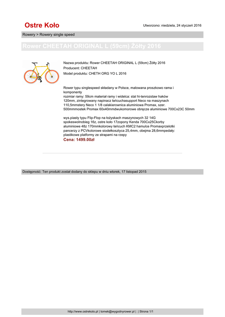 Ostre Koło Utworzono: niedziela, 24 styczeń 2016 Rowery > Rowery single speed Rower CHEETAH ORIGINAL L (59cm) Żółty 2016 Nazwa produktu: Rower CHEETAH ORIGINAL L (59cm) Żółty 2016 Producent: CHEETAH Model produktu: CHETH ORG YO L 2016 Rower typu singlespeed składany w Polsce, malowana proszkowo rama i komponenty rozmiar ramy: 59cm materiał ramy i widelca: stal hi-tenrozstaw haków 120mm, zintegrowany napinacz łańcuchasupport Neco na maszynach 110,5mmstery Neco 1 1/8 calakierownica aluminiowa Promax, szer. 500mmmostek Promax 60x40mmdwukomorowe obręcze aluminiowe 700Cx23C 50mm wys.piasty typu Flip-Flop na łożyskach maszynowych 32 14G spokeswolnobieg 16z, ostre koło 17zopony Kenda 700Cx25Ckorby aluminiowe 48z 170mmkolorowy łańcuch KMC2 hamulce Promaxprzelotki pancerzy z PCVkolorowe siodełkosztyca 25,4mm, obejma 28,6mmpedały: plastikowe platformy ze strapami na rzepy Cena: 1499.00zł Dostępność: Ten produkt został dodany do sklepu w dniu wtorek, 17 listopad 2015 http://www.ostrekolo.pl | [email protected] | | Strona 1/1