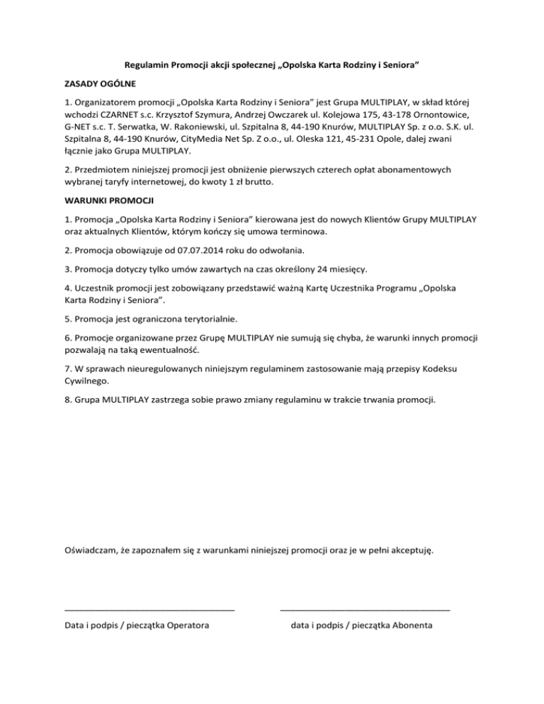 Regulamin Promocji akcji społecznej „Opolska Karta Rodziny i Seniora” ZASADY OGÓLNE 1. Organizatorem promocji „Opolska Karta Rodziny i Seniora” jest Grupa MULTIPLAY, w skład której wchodzi CZARNET s.c. Krzysztof Szymura, Andrzej Owczarek ul. Kolejowa 175, 43-178 Ornontowice, G-NET s.c. T. Serwatka, W. Rakoniewski, ul. Szpitalna 8, 44-190 Knurów, MULTIPLAY Sp. z o.o. S.K. ul. Szpitalna 8, 44-190 Knurów, CityMedia Net Sp. Z o.o., ul. Oleska 121, 45-231 Opole, dalej zwani łącznie jako Grupa MULTIPLAY. 2. Przedmiotem niniejszej promocji jest obniżenie pierwszych czterech opłat abonamentowych wybranej taryfy internetowej, do kwoty 1 zł brutto. WARUNKI PROMOCJI 1. Promocja „Opolska Karta Rodziny i Seniora” kierowana jest do nowych Klientów Grupy MULTIPLAY oraz aktualnych Klientów, którym kończy się umowa terminowa. 2. Promocja obowiązuje od 07.07.2014 roku do odwołania. 3. Promocja dotyczy tylko umów zawartych na czas określony 24 miesięcy. 4. Uczestnik promocji jest zobowiązany przedstawić ważną Kartę Uczestnika Programu „Opolska Karta Rodziny i Seniora”. 5. Promocja jest ograniczona terytorialnie. 6. Promocje organizowane przez Grupę MULTIPLAY nie sumują się chyba, że warunki innych promocji pozwalają na taką ewentualność. 7. W sprawach nieuregulowanych niniejszym regulaminem zastosowanie mają przepisy Kodeksu Cywilnego. 8. Grupa MULTIPLAY zastrzega sobie prawo zmiany regulaminu w trakcie trwania promocji. Oświadczam, że zapoznałem się z warunkami niniejszej promocji oraz je w pełni akceptuję. __________________________________ Data i podpis / pieczątka Operatora __________________________________ data i podpis / pieczątka Abonenta