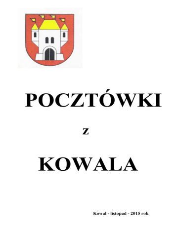 POCZTÓWKI z KOWALA Kowal - listopad - 2015 rok Pierwsze Pocztówki z Kowala. Pocztówki z okresu międzywojennego dotyczące Kowala. Pocztówka z okresu międzywojennego, jako „Pozdrowienia z Kowala.” Pocztówka z okresu międzywojennego, jako „Pozdrowienia z Kowala.” - w odcieniu brązowym. Pocztówka z okresu międzywojennego, - przedstawia projekt Domu Ludowego z 1920 roku, obecnie remiza OSP W Kowalu. Pocztówka z okresu międzywojennego, przedstawiająca kościół w Kowalu. Wydana przez Oddział Kujawskiego, Polskiego Towarzystwa Krajoznawczego. Została wykonana w Zakładzie Graficznym B. Wierzbicki i Spółka w Warszawie. Zdjęcia fotograficzne zrobione w formie pocztówki z roku 1921. Widokówki dotyczące Kowala. Widokówki czarnobiałe - wydane przez Biuro Wydawnicze „Ruch” w roku 1970-76. Widokówki kolorowe. - wydana przez Biuro Wydawniczo-Propagandowe „Ruch” w 1973r. - wydana przez Polskie Towarzystwo Turystyczno Krajoznawcze ( odbitka fotograficzna) -1973r. - wydana przez Krajową Agencje Wydawniczą „Ruch” w 1975r. - wydana przez Drukarnie PROWOD we Włocławku. - wydana przez Krajową Agencje Wydawniczą „Ruch” w 1977r. - wydana przez Oficynę „Pomorze” w Gdańsku. - wydana przez Krajową Agencje Wydawniczą „Ruch” w 1989r. - wydana przez Wydawnictwo LPRINT, DRUKARNIA W Lublinie. - wydana przez Oficynę „Pomorze” w Gdańsku, jako Kolekcja widokówek z Kujaw. - wydane przez Oficynę „Pomorze” w Gdańsku, jako Kolekcja widokówek z Kujaw. - wydana przez DDK Edition s.c., Poznań. - wydane przez Urząd Miasta Kowala w 2015r., projekt pani Anna Marcinkowska, ( pięć widokówek w etui). Karta edukacyjna. Kowal – cmentarz parafialny. - w/w karta jest jedną z 15 kart edukacyjnych wydanych przez Gostynińsko -Włocławski Park Krajobrazowy w Kowalu w grudniu 2014r. ( 15 kart w etui – „ Miejsca Pamięci Narodowej na terenie Gostynińsko -Włocławski Park Krajobrazowy i okolic”., tekst i zdjęcia Lesław Urbankiewicz.) Opracował: Zbigniew Kurpiński -widokówki pochodzą ze zbiorów Zbigniewa Kurpińskiego.