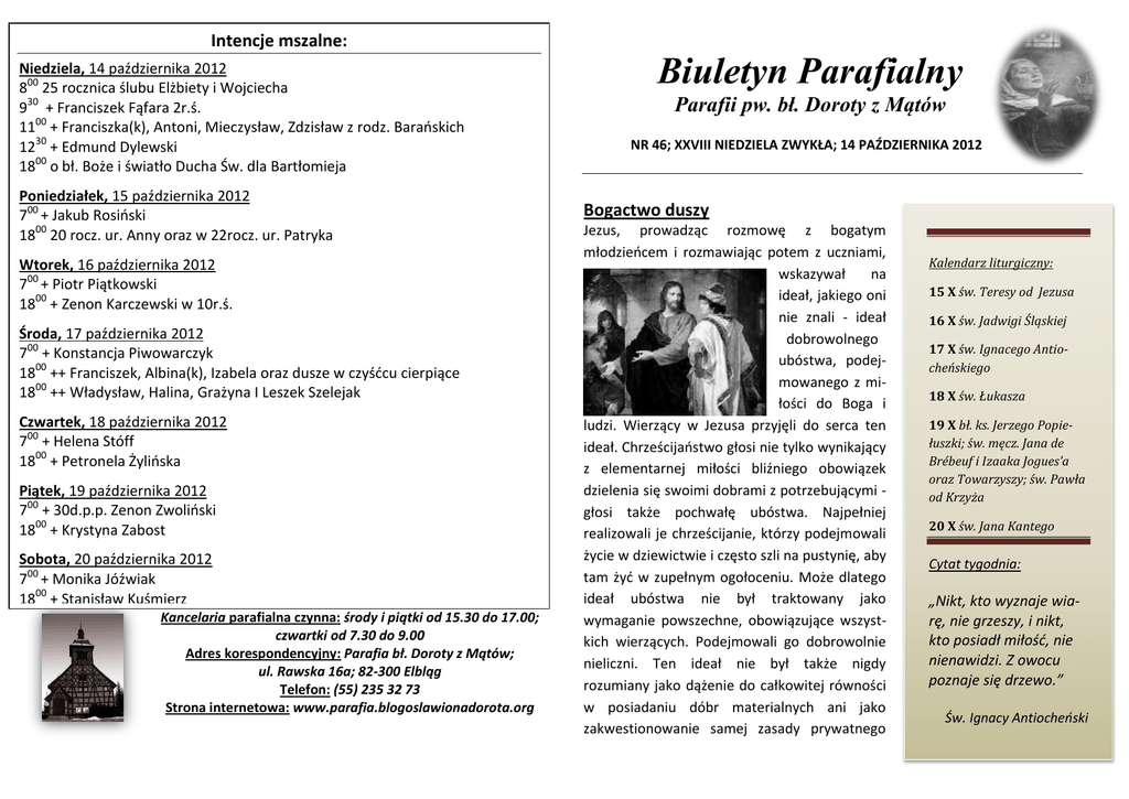 Intencje mszalne: Niedziela, 14 października 2012 800 25 rocznica ślubu Elżbiety i Wojciecha 930 + Franciszek Fąfara 2r.ś. 1100 + Franciszka(k), Antoni, Mieczysław, Zdzisław z rodz. Barańskich 1230 + Edmund Dylewski 1800 o bł. Boże i światło Ducha Św. dla Bartłomieja Poniedziałek, 15 października 2012 700 + Jakub Rosiński 1800 20 rocz. ur. Anny oraz w 22rocz. ur. Patryka Wtorek, 16 października 2012 700 + Piotr Piątkowski 1800 + Zenon Karczewski w 10r.ś. Środa, 17 października 2012 700 + Konstancja Piwowarczyk 1800 ++ Franciszek, Albina(k), Izabela oraz dusze w czyśćcu cierpiące 1800 ++ Władysław, Halina, Grażyna I Leszek Szelejak Czwartek, 18 października 2012 700 + Helena Stóff 1800 + Petronela Żylińska Piątek, 19 października 2012 700 + 30d.p.p. Zenon Zwoliński 1800 + Krystyna Zabost Sobota, 20 października 2012 700 + Monika Jóźwiak 1800 + Stanisław Kuśmierz Kancelaria parafialna czynna: środy i piątki od 15.30 do 17.00; czwartki od 7.30 do 9.00 Adres korespondencyjny: Parafia bł. Doroty z Mątów; ul. Rawska 16a; 82-300 Elbląg Telefon: (55) 235 32 73 Strona internetowa: www.parafia.blogoslawionadorota.org Biuletyn Parafialny Parafii pw. bł. Doroty z Mątów NR 46; XXVIII NIEDZIELA ZWYKŁA; 14 PAŹDZIERNIKA 2012 Bogactwo duszy Jezus, prowadząc rozmowę z bogatym młodzieńcem i rozmawiając potem z uczniami, wskazywał na ideał, jakiego oni nie znali - ideał dobrowolnego ubóstwa, podejmowanego z miłości do Boga i ludzi. Wierzący w Jezusa przyjęli do serca ten ideał. Chrześcijaństwo głosi nie tylko wynikający z elementarnej miłości bliźniego obowiązek dzielenia się swoimi dobrami z potrzebującymi głosi także pochwałę ubóstwa. Najpełniej realizowali je chrześcijanie, którzy podejmowali życie w dziewictwie i często szli na pustynię, aby tam żyć w zupełnym ogołoceniu. Może dlatego ideał ubóstwa nie był traktowany jako wymaganie powszechne, obowiązujące wszystkich wierzących. Podejmowali go dobrowolnie nieliczni. Ten ideał nie był także nigdy rozumiany jako dążenie do całkowitej równości w posiadaniu dóbr materialnych ani jako zakwestionowanie samej zasady prywatnego Kalendarz liturgiczny: 15 X św. Teresy od Jezusa 16 X św. Jadwigi Śląskiej 17 X św. Ignacego Antiocheńskiego 18 X św. Łukasza 19 X bł. ks. Jerzego Popiełuszki; św. męcz. Jana de Brébeuf i Izaaka Jogues’a oraz Towarzyszy; św. Pawła od Krzyża 20 X św. Jana Kantego Cytat tygodnia: „Nikt, kto wyznaje wiarę, nie grzeszy, i nikt, kto posiadł miłość, nie nienawidzi. Z owocu poznaje się drzewo.” Św. Ignacy Antiocheński posiadania. Chrześcijanie od początku wiedzieli, że ubóstwo i bogactwo nie jest kwestią matematyki: nie chodzi tutaj o proste ograniczenie ilości posiadanych dóbr materialnych i ich równomierne rozdzielanie. Zawsze będą biedniejsi i bogatsi i różnice majątkowe nie są złe same w sobie. Droga do bogactwa serca, bogactwa duszy, wiedzie przez wyzbycie się innego bogactwa. Takiego, które całą nadzieję pokłada w sobie, swoich możliwościach i zasobach. Człowiek o takim nastawieniu czuje się bogaty i mocny. On nie potrzebuje Boga. Swoje życie opiera na swoich możliwościach. Natomiast ubogi wie, że sam nie da rady, że jest niejako „skazany” na nieustanną pomoc Bożą. Święci znani… i nie znani Św. Ignacy Antiocheński Legenda głosi, że Ignacy był tym szczęśliwym dzieckiem, które kiedyś Chrystus postawił przed uczniami swoimi i rzekł: "Zaprawdę powiadam wam: Jeśli się nie odmienicie i nie staniecie jak dzieci, nie wejdziecie do królestwa niebieskiego. Kto się więc uniży, jak to dziecko, ten jest największy w królestwie niebieskim. I kto by przyjął jedno takie dziecko w imię moje, Mnie przyjmuje" (Mt 18, 1-4). Nie wiemy nic o latach dziecięcych i młodzieńczych Ignacego. Spotykamy go dopiero jako trzeciego z kolei biskupa Antiochii (po św. Piotrze Apostole i św. Ewodiuszu). W czasie prześladowania za cesarza Trajana został uwięziony i skazany na śmierć. Wysłano go pod eskortą żołnierzy do Rzymu, aby tam rzucić na pożarcie dzikim zwierzętom w czasie organizowanych właśnie igrzysk. W czasie podróży do Rzymu Ignacy zatrzymał się w Smyrnie, gdzie czekał na okręt. Korzystając z chwilowej przerwy, napisał 4 listy do gmin chrześcijańskich: w Efezie, Magnezji, w Trallach i w Rzymie. Wyszedł mu naprzeciw św. Polikarp z liczną delegacją, by uczcić w ten sposób bohatera. Polikarp dostarczył Ignacemu materiału do pisania i zobowiązał się odesłać jego listy do adresatów. W Troadzie Ignacy musiał ponownie przesiąść się na inny okręt. Skorzystał z okazji, by napisać listy do Filadelfii, Smyrny i do św. Polikarpa. Z Troady dojechano do Neapolu, miasta w Macedonii, a stąd Ignacy musiał podążać pieszo pod eskortą do Filippi, Salonik i Dyrrachium. Tam dopiero wszyscy wsiedli na statek i dojechali nim do portu włoskiego, Brindisi. Stąd znowu pieszo szli drogą lądową aż do Rzymu. Dla osiemdziesięcioletniego starca cała ta podróż była prawdziwą katorgą. W swoich listach Ignacy wyraził żarliwość wiary oraz głęboki pokój serca wobec czekającego go męczeństwa. Listy te są ważnym dokumentem wiary pierwotnego Kościoła. Św. Ignacy, "Teoforos" - jak przedstawia się w pismach, zginął śmiercią męczeńską na arenie w Rzymie. Dzieje jego bohaterskiej śmierci opisali między innymi: św. Ireneusz, Orygenes, Euzebiusz z Cezarei, św. Polikarp, św. Jan Chryzostom i św. Hieronim. Przyjmuje się, że śmierć miała miejsce ok. roku 107. Chrześcijanie zebrali ze czcią pozostałe na arenie kości Męczennika, a potem przewieziono je do Antiochii. Wiemy o tym z mowy św. Jana Chryzostoma, poświęconej Ignacemu. Cesarz Teodozjusz II (+ 450) nakazał umieścić relikwie św. Ignacego w świątyni Fortuny, zamienionej na katolicką. Trzecie przeniesienie relikwii odbyło się w roku 540, kiedy