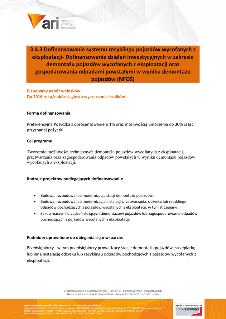 3.4.3 Dofinansowanie systemu recyklingu pojazdów wycofanych z eksploatacji- Dofinansowanie działań inwestycyjnych w zakresie demontażu pojazdów wycofanych z eksploatacji oraz gospodarowania odpadami powstałymi w wyniku demontażu pojazdów (NFOŚ) Planowany nabór wniosków: Do 2016 roku/nabór ciągły do wyczerpania środków Forma dofinansowania: Preferencyjna Pożyczka z oprocentowaniem 1% oraz możliwością umorzenia do 30% części przyznanej pożyczki. Cel programu: Tworzenie możliwości technicznych demontażu pojazdów wycofanych z eksploatacji, przetwarzania oraz zagospodarowania odpadów powstałych w wyniku demontażu pojazdów wycofanych z eksploatacji. Rodzaje projektów podlegających dofinansowaniu: Budowa, rozbudowa lub modernizacja stacji demontażu pojazdów; Budowa, rozbudowa lub modernizacja instalacji przetwarzania, odzysku lub recyklingu odpadów pochodzących z pojazdów wycofanych z eksploatacji, w tym strzępiarki; Zakup maszyn i urządzeń służących demontażowi pojazdów lub zagospodarowaniu odpadów pochodzących z pojazdów wycofanych z eksploatacji; Podmioty uprawnione do ubiegania się o wsparcie: Przedsiębiorcy- w tym przedsiębiorcy prowadzący stacje demontażu pojazdów, strzępiarkę lub inną instalację odzysku lub recyklingu odpadów pochodzących z pojazdów wycofanych z eksploatacji. Wysokość wsparcia: budżet- ponad 126 mln Maksymalny okres realizacji: do 31.12.2017r. Poziom dofinansowania: do 75% Przykładowe koszty kwalifikowalne: dostawy lub zakup niezbędnych dla osiągnięcia efektu ekologicznego oraz spełniających odpowiednie normy urządzeń i inwentarzowego wyposażenia technologicznego będących środkami trwałymi; nabycie nieruchomości gruntowych, budynków i budowli niezbędnych dla osiągnięcia efektu ekologicznego; przygotowanie terenu i zaplecza budowy oraz jego likwidacja; roboty budowlano-montażowe oraz demontażowe i rozbiórkowe; koszty usług niezbędnych do realizacji inwestycji, w tym koszty ekspertyz, nadzoru inwestorskiego, nadzoru autorskiego; obsługa inwestycji; Dlaczego warto nam zaufać? Kim jesteśmy? Agencja Rozwoju Innowacji SA jest firmą doradczo-szkoleniową specjalizującą się w tworzeniu i realizacji projektów finansowanych ze środków Unii Europejskiej. Cechuje nas wysoki profesjonalizm i dynamika rozwoju. W przeciągu 5 lat uzyskaliśmy pozycję jednego z liderów na Dolnym Śląsku w zakresie pozyskiwania środków w ramach Europejskiego Funduszu Społecznego oraz Europejskiego Funduszu Rozwoju Regionalnego. Zdobywamy fundusze zarówno na projekty własne jak i dla naszych partnerów. Wysokie kwalifikacje zespołu i uzyskane w pracy doświadczenie pozwala firmie osiągać znakomite wyniki w pozyskiwaniu środków, efektywnie zarządzać dotacjami i cieszyć się zaufaniem partnerów. Kontakt Biuro handlowe ARI SA ul. Sokolnicza 5/25, Wrocław Tel. 71 790 18 80 E-mail: [email protected]