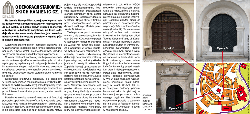 Rynek 6 portale przy rynku Starego Miasta w lublinie Rynek 9 Rynek Rynek 18 Opr. Biuro MKZ/tekst K. czerlunczakiewiczfot. k. czerlunczakiewicz, M. Trzewik na Autentyzm staromiejskich kamienic przejawia się w zachowanym materiale oraz formie architektonicznej, m.in. w bryle, detalu architektonicznym, układzie wnętrz oraz częściowo ich dekoracji i wyposażeniu. W wielu obiektach zachowały się bogato opracowane obramienia wjazdów, otworów okiennych i drzwiowych, gzymsy wydzielające kondygnacje budowli, polichromowane stropy, malowidła ścienne, dekoracje sgraffitowe. Jednym z elementów detalu architektonicznego zdobiącego fasady staromiejskich kamienic są portale. Najbardziej efektowne zachowały się częściowo w trzech kamienicach znajdujących się przy Rynku. Datowane są na I i II poł. XVI w. Oryginalne fragmenty wykonane zostały z wapienia sprowadzanego powszechnie przez lokalnych muratorów przede wszystkim z okolic Pińczowa. Portal w kamienicy numer 6 (narożna z ul. Grodzką) powstał w 1 poł. XVI w. Ma zwieńczenie w kształcie ostrołuku, opartego na rozglifionych węgarach i archiwolcie. Na jednym z glifów w dolnym odcinku węgarów znajduje się dekoracja imitująca splot sznura, częsty motyw opoj Na terenie Starego Miasta, znajduje się ponad setka zabytkowych kamienic powstałych na przestrzeni XV-XIX wieku. W bardzo dużym stopniu zachowały autentyczną substancję zabytkową, na którą składają się zarówno elementy pierwotne, jak i wszelkie nawarstwienia historyczne powstałe w wyniku późniejszych przekształceń. mienicy w 1 poł. XVII w. Wśród motywów dekoracyjnych pojawiają się rozety, główki anielskie, kartusze. Na belkowaniu nadproża znajdują się łacińskie inskrypcje: Dominus adiutor meus et protector meus, co oznacza Pan wspomożycielem moim i obrońcą moim (Psalm 17). Te same słowa odczytać można nad portalem krakowskiej kamienicy tzw. „Pod Trzema Koronami” przy ul. Kanoniczej 7. Druga inskrypcja brzmi: Sperantem autem in Domino misericordia circumdabit – Łaska ogarnia ufających Panu (Psalm 32). Słowa te interpretować można zapewne w kontekście symboliki związanej z zawierzeniem Bogu, który ochraniać ma mieszkańców kamienicy przed wszelkim złem i niebezpieczeństwem. Portal uległ częściowemu zniszczeniu podczas prowadzonych w XVII w. prac służących wzmocnieniu kamienicy. Został odsłonięty w latach 60-tych XX w., a następnie poddany pracom konserwatorskim i częściowej rekonstrukcji na podstawie zachowanego oryginału. Rzeźbiarsko opracowane portale znajdowały się nie tylko w fasadach kamienic, ale i we wnętrzach o czym w następnym odcinku. Wod o dekoracji staromiejskich kamienic cz. I pojawiający się w późnogotyckiej rzeźbie architektonicznej. Podczas późniejszych przekształceń elewacji kamienicy portal został zabudowany i odsłonięty dopiero w latach 30-tych XX w. w trakcie prac konserwatorskich prowadzonych na Starym Mieście przez Józefa Dutkiewicza. Także podczas prac konserwatorskich, ale prowadzonych w latach 90-tych XX w. odkryto portal w kamienicy numer 9 (narożna z ul. Złotą). Ma kształt łuku pełnego z węgarami w formie kanelowanych pilastrów i rozglifioną archiwoltą, posiada rozbudowaną dekorację ornamentalną roślinną i geometryczną, na którą składają się m.in. rozety i kostkowanie. Zupełnie inaczej opracowany architektonicznie i rzeźbiarsko jest renesansowo-manierystyczny portal w kamienicy numer 18. Ma kształt prostokąta z otworem wejściowym zamkniętym łukiem pełnym. Nadproże zwieńczone jest płaskorzeźbioną manierystyczną attyką, którą flankują charakterystyczne maszkarony, przypominające smocze głowy. Na środku tympanonu znajduje się medalion z herbem Konopniców i monogramem Andrzeja Konopnicy, który był jednym z właścicieli ka-