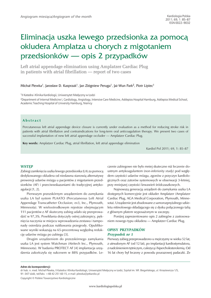 Kardiologia Polska 2011; 69, 1: 85–87 ISSN 0022–9032 Angiogram miesiąca/Angiogram of the month Eliminacja uszka lewego przedsionka za pomocą okludera Amplatza u chorych z migotaniem przedsionków — opis 2 przypadków Left atrial appendage elimination using Amplatzer Cardiac Plug in patients with atrial fibrillation — report of two cases Michał Plewka1, Jarosław D. Kasprzak1, Jan Zbigniew Peruga1, Jai−Wun Park2, Piotr Lipiec1 1II Katedra i Klinika Kardiologii, Uniwersytet Medyczny w Łodzi 2Department of Internal Medicine I, Cardiology, Angiology, Intensive Care Medicine, Asklepios Hospital Hamburg, Asklepios Medical School, Academic Teaching Hospital of University Hamburg, Niemcy Abstract Percutaneous left atrial appendage device closure is currently under evaluation as a method for reducing stroke risk in patients with atrial fibrillation and contraindications for long-term oral anticoagulation therapy. We present two cases of successful implantation of new left atrial appendage occluder — Amplatzer Cardiac Plug. Key words: Amplatzer Cardiac Plug, atrial fibrillation, left atrial appendage elimination Kardiol Pol 2011; 69, 1: 85–87 WSTĘP Zabiegi zamknięcia uszka lewego przedsionka (LA) za pomocą dedykowanego okludera od niedawna stanowią alternatywę prewencji udarów mózgu u pacjentów z migotaniem przedsionków (AF) i przeciwwskazaniami do tradycyjnej antykoagulacji [1, 2]. Pierwszym przezskórnym urządzeniem do zamykania uszka LA był system PLAATO (Percutaneous Left Atrial Appendage Transcatheter Occlusion; ev3, Inc., Plymouth, Minnesota). W wieloośrodkowym rejestrze obejmującym 111 pacjentów z AF skuteczny zabieg udało się przeprowadzić w 97,3%. Powikłania dotyczyły ostrej zakrzepicy, pęknięcia naczynia w miejscu wprowadzania zestawu i tamponady osierdzia podczas nakłuwania przegrody. Opublikowane wyniki wskazują na 65-procentową względną redukcję udarów mózgu po zabiegu [3]. Drugim urządzeniem do przezskórnego zamykania uszka LA jest system Watchman (Atritech Inc., Plymouth, Minnesota). W badaniu PROTECT AF [4] implantacja urządzenia zakończyła się sukcesem w 88% przypadków. Le- czenie zabiegowe nie było mniej skuteczne niż leczenie doustnym antykoagulantem (non-inferiority study) pod względem częstości udarów mózgu, zgonów z przyczyn kardiologicznych oraz zatorów systemowych w obserwacji 3-letniej, przy mniejszej częstości krwawień śródczaszkowych. Najnowszą generacją urządzeń do zamykania uszka LA dostępnych komercyjnie jest okluder Amplatzer (Amplatzer Cardiac Plug, AGA Medical Corporation, Plymouth, Minnesota). Urządzenie jest zbudowane z samorozprężalnego szkieletu nitinolowego składającego się z dysku połączonego talią z głównym płatem wyposażonym w zaczepy. Poniżej zaprezentowano opis 2 zabiegów z zastosowaniem nowego typu okludera — Amplatzer Cardiac Plug. OPISY PRZYPADKÓW Przypadek nr 1 Pierwszy zabieg przeprowadzono u mężczyzny w wieku 52 lat, z utrwalonym AF (od 12 lat), po implantacji kardiostymulatora, z nadciśnieniem tętniczym, cukrzycą i hipercholesterolemią. Od 16 lat chory był leczony z powodu pourazowej padaczki. Ze Adres do korespondencji: dr hab. n. med. Michał Plewka, II Katedra i Klinika Kardiologii, Uniwersytet Medyczny w Łodzi, Szpital im. Wł. Biegańskiego, ul. Kniaziewicza 1/5, 91–347 Łódź, tel/faks: +48 42 251 60 15, e-mail: [email protected] Copyright © Polskie Towarzystwo Kardiologiczne www.kardiologiapolska.pl 86 Michał Plewka et al. Rycina 1. Przypadek 1. Angiograficzna ocena uszka lewego przedsionka przed implantacją okludera Rycina 2. Przypadek 1. Obraz źle dobranego okludera — brak szczelności; kontrast poprzez dysk okludera wypełnia dystalną część uszka lewego przedsionka (strzałka) względu na interakcje między karbamazepiną i acenokumarolem występowały trudności z uzyskaniem terapeutycznej wartości INR, nawet mimo wysokich dawek acenokumarolu. W badaniu echokardiograficznym stwierdzono poszerzenie LA (46 mm), przerost mięśnia sercowego, niewielkie odcinkowe zaburzenia kurczliwości z frakcją wyrzutową lewej komory (LVEF) wynoszącą 57% i niewielką niedomykalność mitralną. W badaniu przezprzełykowym (TEE) stwierdzono optymalne warunki anatomiczne do implantacji zapinki, bez obecności skrzeplin wewnątrzsercowych. Na podstawie pomiarów echokardiograficznych i angiograficznych chorego zakwalifikowano do implantacji okludera Amplatzer o rozmiarze 22 mm (ryc. 1). Jednak po wprowadzeniu zapinki okazało się, że przyleganie do ścian uszka LA nie było optymalne (ryc. 2). Zdecydowano o wymianie okludera na rozmiar 24 mm, lepiej dopasowanego do anatomii uszka LA tego pacjenta (ryc. 3, 4). stwierdzono optymalne warunki anatomiczne do implantacji okludera, bez obecności skrzeplin wewnątrzsercowych. Chorego zakwalifikowano do implantacji okludera Amplatzer o rozmiarze 22 mm. Przypadek nr 2 Drugi zabieg wykonano u mężczyzny w wieku 55 lat, z napadowym AF, nadciśnieniem tętniczym, cukrzycą i hipertriglicerydemią. U chorego mimo wielokrotnych prób optymalizacji dawek acenokumarolu kilkukrotnie występowały istotne klinicznie krwawienia z przewodu pokarmowego oraz z żylaków kończyn dolnych. W przezklatkowym badaniu echokardiograficznym (TTE) stwierdzono: poszerzenie lewej komory (w skurczu 43 mm, w rozkurczu 58 mm), poszerzenie LA (58 mm), niewielką nieodmykalność mitralną I o, LVEF równą 50%. W badaniu TEE Technika zabiegu Zabiegi wykonano w znieczuleniu ogólnym, z dostępu przez żyłę udową. Pod kontrolą angiograficzną i obrazowania TEE wykonano nakłucie przegrody igłą Brockenbrough (Medtronic), wprowadzono okluder do uszka LA, po optymalizacji pozycji i kontrolnym podaniu kontrastu odłączano urządzenie od zestawu. Zabieg wykonywano u pacjentów nasyconych klopidogrelem, podczas procedury stosowano heparynę niefrakcjonowaną pod kontrolą aktywnego czasu koagulacji (ACT 250 s). Po zabiegu przez