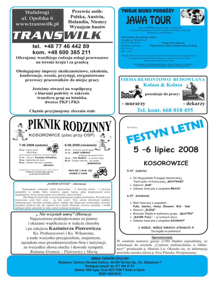 Przewóz osób: Polska, Austria, Holandia, Niemcy Wynajem busów tel. +48 77 46 442 89 kom. +48 600 385 211 Oferujemy wszelkiego rodzaju us³ugi przewozowe na terenie kraju i za granic¹ Obs³ugujemy imprezy okolicznoœciowe, szkolenia, konferencje, wesela, przysiêgi, zorganizowane przewozy pracowników do miejsc pracy Jesteœmy otwarci na wspó³pracê z biurami podró¿y w zakresie transferu grup na lotniska, dworce PKP i PKS Chêtnie przyjmujemy zlecenia sta³e Biuro od 15-lat specjalizuje siê w organizacji wycieczek, pielgrzymek, szkoleñ i konferencji dla firm i instytucji. JeŸdzimy po ca³ej Europie! Zapraszamy do naszego salonu: Gogolin ul. Strzelecka 2 Tel. 077-466 90 69 Wst¹p lub zadzwoñ. Godziny otwarcia: Zapewniamy mi³¹ i kompetentn¹ obs³ugê Pn Pt: 9-17 Sob: 9-13 Bogata oferta wczasów, wycieczek, kolonii i obozów krajowych i zagranicznych W sprzeda¿y równie¿ bilety autokarowe, promowe, lotnicze oraz ubezpieczenia turystyczne i inne. ZAPRASZAMY PO OFERTÊ ORBIS TRAVEL, TRAVEL TIME, ECCO HOLIDAY, ALFA STAR, EXIM TOURS, SINDBAD, ALMATUR I WIELE INNYCH FIRMA REMONTOWO BUDOWLANA Kolasa & Kolasa poszukuje do pracy: - murarzy - dekarzy Tel. kont. 668 018 455 Ju¿ wkrótce... Y T S E F I N T N LE 5 –6 lipiec 2008 KOSOROWICE 5.07. (sobota) „OGRÓD SZTUKI” – informacja Proponujemy wykonanie dzie³a plastycznego – w dowolnej formie – z u¿yciem materia³ów tj. kredki, farby, kolorowy papier, karton, glina dostarczonych przez organizatorów. Prace musz¹ wi¹zaæ siê z tematem „Nasza Gmina”. Dla lubi¹cych niezwyk³e wyzwania proponujemy konkurs pod has³em „Wszystko jest tworzywem, czyli byle czym – na byle czym”. Przy u¿yciu dowolnych œrodków zdobienniczych, dowoln¹ technik¹ nale¿y ozdobiæ lub plastycznie przekszta³ciæ dowolny przedmiot u¿ytkowy tak, aby zamieni³ siê w dzie³o. Materia³y, surowce, narzêdzia i œrodki zdobi¹ce nale¿y przynieœæ ze sob¹, a prace wykonaæ na miejscu. „ Nie wszystek umrê” (Horacy) Najszczersze podziêkowania za pomoc i okazane wspó³czucie w trakcie choroby i po odejœciu Kazimierza Piotrowicza: Ks. Proboszczowi i Ks. Wikaremu, a nade wszystko przyjacio³om, znajomym, s¹siadom oraz przedstawicielom firm i instytucji, za wszystkie s³owa otuchy i dowody sympatii. Romana Gramza – Piotrowicz z Mart¹ · IX Wojewódzki Przegl¹d Amatorskiej Twórczoœci Artystycznej „WIATRAKI” · Kabaret „RAK” · Zabawa taneczna z zespo³em BRAVO 6.07. (niedziela) · Blok taneczny z zespo³ami: Fuks, Santex, Ha³as, Element, Wal – Nak · Koncert „ELENI” · Biesiada Œl¹ska w wykonaniu grupy „QUATRO” · „BAYER FULL” – w rytmach disco · Zabawa taneczna z zespo³em DIAMANT I WIELE, WIELE INNYCH ATRAKCJI !!! Szczegó³y na plakatach. Sprostowanie W ostatnim numerze gazety (2/08) b³êdnie napisaliœmy, ¿e informacje do artyku³u „Centrum multimedialne w bibliotece!” przekaza³a p. Mariola Lis. Okaza³o siê, ¿e informacjê przes³a³a autorka tekstu p. Ewa Pilarska. Przepraszamy. GMINA TARNÓW OPOLSKI Wydawca: Gminny Oœrodek Kultury; 46-050 Tarnów Op., Os. Zak³adowe 7 Redaguje zespó³, tel. 077 464 47 81 Nak³ad 1000 egzp. Druk NOT FSN-T Rada w Opolu ISSN 1428-2410
