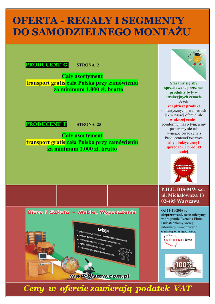 OFERTA - REGAŁY I SEGMENTY DO SAMODZIELNEGO MONTAŻU PRODUCENT G STRONA 2 Cały asortyment transport gratis cała Polska przy zamówieniu za minimum 1.000 zł. brutto PRODUCENT F STRONA 25 Cały asortyment transport gratis cała Polska przy zamówieniu za minimum 1.000 zł. brutto Staramy się aby sprzedawane przez nas produkty były w atrakcyjnych cenach. Jeżeli znajdziesz produkt o identycznych parametrach jak w naszej ofercie, ale w niższej cenie – poinformuj nas o tym, a my postaramy się tak wynegocjować ceny z Producentem/Dostawcą aby obniżyć cenę i sprzedać Ci produkt taniej. P.H.U. BIS-MW s.c. ul. Michałowicza 13 02-495 Warszawa Od 21-11-2008 r. nieprzerwanie uczestniczymy w programie Rzetelna Firma i udostępniamy szereg informacji świadczących o naszej wiarygodności. Ceny w ofercie zawierają podatek VAT Ceny z VAT REGALIKI I SEGMENTY DO SAMODZIELNEGO MONTAŻU PRODUCENT G Większość asortymentu POSIADA CERTYFIKATY Szafka przyścienna - Choinka Szafki do kącików są wykorzystywane do prezentacji prac plastycznych dzieci, ale mogą także spełniać rolę botanicznych kącików, gdzie dzieci pielęgnują rośliny i opiekują się małymi zwierzątkami. Ciekawa konstrukcja pozwala na postawienie ich w narożniku, przy ścianie, a wyposażenie w kółka służy łatwemu przemieszczaniu. Szafka wykonana ze slejki i MDF-u. Wym.: wys. 138 x szer. 126 x gł. 36 cm 476,99 zł. Szafka narożna - Choinka Szafka wykonana ze skejki i MDF-u. Wym.: wys. 138 x szer. 68 x gł. 68 cm 410,99 zł. Biuro i Szkoła – Meble, Wyposażenie PHU BIS-MW s.c. Monika Chomiakowska-Widulińska, Waldemar Widuliński ul. Michałowicza 13 02-495 Warszawa poniedziałek-piątek 8:30-16:30 Tel. 22 4252599, 22 8367221 Tel. kom. +48 500510323 www.bismw.com.pl e-mail: [email protected] Strona 2 z 38 Ceny z VAT Regał Żagiel Regał w kolorze pastelowym zielonym lub pomarańczowym (do wyboru), wykonany z płyty wiórowej laminowanej o grubości 18mm. Krawędzie regału oklejone ABS 1. Regał posiada 3 otwarte półki z przegrodami. Wym.: wys. 121 x szer. 100 x gł. 40 cm 329,90 zł. Szafka Żabka z kontenerkiem 349,90 zł. Lewa lub prawa (do wyboru) Szafka z kontenerkiem wykonana z płyty wiórowej laminowanej. Kontenerek posiada wysokiej jakości kółka umożliwiające wysunięcie kontenerka. Szafka 'Żabka' idealnie dopasowuje się do systemu szafek Feria. Wym.: wys. 96 x szer. 77 x gł. 47 cm Biuro i Szkoła – Meble, Wyposażenie PHU BIS-MW s.c. Monika Chomiakowska-Widulińska, Waldemar Widuliński ul. Michałowicza 13 02-495 Warszawa poniedziałek-piątek 8:30-16:30 Tel. 22 4252599, 22 8367221 Tel. kom. +48 500510323 www.bismw.com.pl e-mail: [email protected] Strona 3 z 38 Ceny z VAT Szafka z piankami SZPIEG W skład zestawu wchodzą: regał z półkami na zabawki i książki, dwa funkcjonalne kontenerki na kółkach do przechowywania klocków i drobnych zabawek oraz 3 piankowe materacyki. Wym.: wys.136 x szer. 206 x gł. 55 cm 999,90 zł. Szafka z piankami JABŁUSZKO Szafka wykonana z plyty wiórowej z piankowymi aplikacjami jabłuszek. Wym.: wys.136 x szer. 206 x gł. 55 cm 999,90 zł. Biuro i Szkoła – Meble, Wyposażenie PHU BIS-MW s.c. Monika Chomiakowska-Widulińska, Waldemar Widuliński ul. Michałowicza 13 02-495 Warszawa poniedziałek-piątek 8:30-16:30 Tel. 22 4252599, 22 8367221 Tel. kom. +48 500510323 www.bismw.com.pl e-mail: [email protected] Strona 4 z 38 Ceny z VAT Żaglówka 428,90 zł. Fantazyjny, inspirowany motywem płynącej żaglówki regał koreluje w sposób proporcjonalny elementy estetyki, funkcjonalności i higieny. Utrzymany w pięknej, intensywnej kolorystyce i wyposażony w dużą ilość półek ozdabia wnętrze i pomaga zaprowadzić ład wśród pokaźnej liczby przedmiotów, których na co dzień potrzebują wychowankowie. Istnieje możliwość zmiany układu żagli na lewą lub prawą stronę w zależności od potrzeb w sali. Wym.: dł. 162 cm x wys. 152 cm x gł. 51 cm. Biblioteczka przedszkolna Wym: wys. 68 x szer. 36 x gł. 34 cm 149,90 zł. Puf do biblioteczki – 1 sztuka Wym: wys. 30 x szer. 30 x gł. 30 cm. 1 szt. 106,99 zł. Biblioteczka z siedziskiem Wielofunkcyjna biblioteczka pozwalająca na eksponowanie książek, gier i pomocy edukacyjnych. Miękka pufa zapewnia miejsce do siedzenia Wym: wys. 82 x szer. 151 x gł. 34 cm W zestawie znajduje się piankowe siedzisko. 399,90 zł. Strona 5 z 38 Ceny z VAT Skrzynia skarbów "Papuga" Nie tylko dla piratów i małych wielbicieli przygód. W ogromnej skrzyni przechowa rekwizyty dziecięca teatralna trupa. Ładny kształt kuferka, prześliczne kolory i zwierzęce motywy doskonale uzupełnią aranżację wielu bajkowych sal. Wym.: dł. 100 x gł. 39 x wys. 50 cm 435,99 zł. Toaletka Wym.: 103 x 70 x 41 cm. 359,90 zł Taboret do toaletki Wym.: 30 x 30 x 30 cm. 99,90 zł Teatrzyk wielofunkcyjny Teatrzyk wykonany ze sklejki może też po odwróceniu być sklepikiem. Zabawa w teatr rozwija inteligencje emocjonalną, pozwala pokonać bariery w komunikacji, zachęca do wyrażania uczuć i myśli, integruje grupę. Po stronie sklepiku znajduje się 6 przegródek oraz dwie szufladki np. na pieniążki. Wym.: 110 x 100 cm. 599,99 zł Biuro i Szkoła – Meble, Wyposażenie PHU BIS-MW s.c. Monika Chomiakowska-Widulińska, Waldemar Widuliński ul. Michałowicza 13 02-495 Warszawa poniedziałek-piątek 8:30-16:30 Tel. 22 4252599, 22 8367221 Tel. kom. +48 500510323 www.bismw.com.pl e-mail: [email protected] Strona 6 z 38 Ceny z VAT Sklepik z ladą Uroczy i funkcjonalny sklepik, niewiele odbiegający od rzeczywistości. Wykonany z drewna, z wieloma półkami i dużymi ladami daje możliwość wspólnej zabawy wielu dzieciom. Nie zawiera wyposażenia. Wym.: wys. 155 x szer. 120 x gł. 105 cm 799,99 zł. Mały stragan Wesoły mebelek do zabaw iluzyjnych. Niezastąpiony jako element interesującej aranżacji szkolnych lub przedszkolnych wnętrz oraz fragment scenografii np. do inscenizacji tak lubianego przez dzieci i dyd