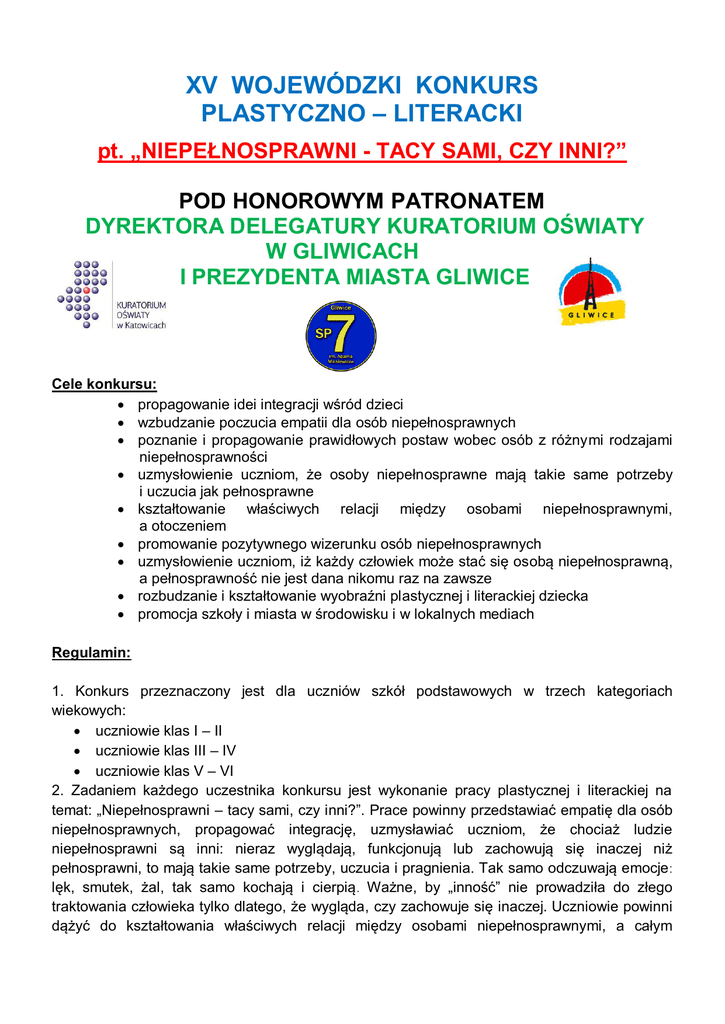 XV WOJEWÓDZKI KONKURS PLASTYCZNO – LITERACKI pt. „NIEPEŁNOSPRAWNI - TACY SAMI, CZY INNI?” POD HONOROWYM PATRONATEM DYREKTORA DELEGATURY KURATORIUM OŚWIATY W GLIWICACH I PREZYDENTA MIASTA GLIWICE Cele konkursu: propagowanie idei integracji wśród dzieci wzbudzanie poczucia empatii dla osób niepełnosprawnych poznanie i propagowanie prawidłowych postaw wobec osób z różnymi rodzajami niepełnosprawności uzmysłowienie uczniom, że osoby niepełnosprawne mają takie same potrzeby i uczucia jak pełnosprawne kształtowanie właściwych relacji między osobami niepełnosprawnymi, a otoczeniem promowanie pozytywnego wizerunku osób niepełnosprawnych uzmysłowienie uczniom, iż każdy człowiek może stać się osobą niepełnosprawną, a pełnosprawność nie jest dana nikomu raz na zawsze rozbudzanie i kształtowanie wyobraźni plastycznej i literackiej dziecka promocja szkoły i miasta w środowisku i w lokalnych mediach Regulamin: 1. Konkurs przeznaczony jest dla uczniów szkół podstawowych w trzech kategoriach wiekowych: uczniowie klas I – II uczniowie klas III – IV uczniowie klas V – VI 2. Zadaniem każdego uczestnika konkursu jest wykonanie pracy plastycznej i literackiej na temat: „Niepełnosprawni – tacy sami, czy inni?”. Prace powinny przedstawiać empatię dla osób niepełnosprawnych, propagować integrację, uzmysławiać uczniom, że chociaż ludzie niepełnosprawni są inni: nieraz wyglądają, funkcjonują lub zachowują się inaczej niż pełnosprawni, to mają takie same potrzeby, uczucia i pragnienia. Tak samo odczuwają emocje : lęk, smutek, żal, tak samo kochają i cierpią . Ważne, by „inność” nie prowadziła do złego traktowania człowieka tylko dlatego, że wygląda, czy zachowuje się inaczej. Uczniowie powinni dążyć do kształtowania właściwych relacji między osobami niepełnosprawnymi, a całym otoczeniem i swoją pracą plastyczną i literacką odpowiedzieć na pytanie: czy ludzie niepełnosprawni są inni, czy tacy sami jak ludzie zdrowi? W ocenie prac ważne jest ciekawe i nietuzinkowe ujęcie tematu w pracy literackiej oraz oryginalność techniki w pracy plastycznej. 3. Każdy uczestnik konkursu powinien wykonać pracę plastyczną na temat: „Niepełnosprawni – tacy sami, czy inni?” na kartce bloku technicznego formatu A4 . 4. Technika pracy jest dowolna, ale powinna być oryginalna i ciekawa. Prosimy o ciekawe rozwiązania plastyczne i interesujące, oryginalne materiały, użyte do wykonania pracy (nie tylko same kredki!). 5. Do pracy plastycznej, każdy uczestnik dołącza pracę literacką: 12 - wersowy (3 zwrotki) wiersz rymowany, własnego autorstwa, dotyczący pracy plastycznej, napisany na komputerze czcionką Arial ’14 na oddzielnej, żółtej kartce ksero formatu A4. 6. Komplet prac od jednego uczestnika (pracę plastyczną i literacką) należy włożyć do jednej koszulki. Każda szkoła może nadesłać dowolną ilość prac. Wszystkie prace (plastyczne i literackie) muszą być opisane na odwrocie: imię i nazwisko uczestnika, klasa, imię i nazwisko opiekuna, nazwę i numer szkoły, miejscowość oraz telefon i e-mail do szkoły i opiekuna. 7. Jury wyłoni laureatów w każdej grupie wiekowej. Zostaną przyznane 3 miejsca i trzy wyróżnienia w każdej z grup. 8. Prace uczniów należy przesłać w opakowaniu (zabezpieczyć przed uszkodzeniem) na adres: SP7 w Gliwicach, ul. Tarnogórska 59, Gliwice 44-100 w terminie do 20 kwietnia 2015 r. Liczy się data dotarcia prac do SP 7! 9. Dla laureatów konkursu w każdej kategorii przewidziane są dyplomy i nagrody rzeczowe, a dla opiekunów laureatów podziękowania. 10. Najciekawsze prace zostaną wyeksponowane na wystawie pokonkursowej 11. Wyniki konkursu zostaną opublikowane na stronie internetowej naszej szkoły: www.sp7gliwice.pl 30 kwietnia 2015 r. 12. Uroczystość wręczenia nagród odbędzie się 14 maja 2015 r. w Urzędzie Miasta Gliwice (I piętro, hol przy dawnej sali sesyjnej). Prosimy o podanie kontaktowych adresów mailowych opiekunów uczniów. 13. Prace konkursowe nie będą zwracane i przechodzą na własność organizatorów. 14. Nadesłanie prac na konkurs jest jednoznaczne z wyrażeniem zgody na publikację prac i nazwisk uczniów na wystawie i w mediach (załącznik – zgoda na przetwarzanie danych osobowych i zgoda na wykorzystanie wizerunku uczestnika) Serdecznie zapraszamy do udziału w konkursie! Organizatorki: mgr Beata Oparczyk, mgr Anna Hora-Lis PATRONAT MEDIALNY: PARTNERZY I SPONSORZY: ZGODA NA PRZETWARZANIE DANYCH OSOBOWYCH Wyrażam zgodę na gromadzenie, przetwarzanie i wykorzystywanie danych osobowych mojego dziecka imię i nazwisko…………………………………………………………………………., kl.………………. Adres szkoły, do której uczęszcza uczestnik: …………………………………………………………………………………………….…… na potrzeby przeprowadzenia Wojewódzkiego Konkursu „Niepełnosprawni – tacy sami, czy inni?” 1. Zostałem/-am poinformowany/-a o celu zbierania danych osobowych mojego dziecka. 2. Świadomy/-a jestem uprawnień przysługujących mi na podstawie art. 24 ust. 1 pkt. 3 ustawy z dnia 29.08.1997 r. o ochronie danych osobowych (Dz. U. Z 2002 r. Nr 101 poz.926 z późn. zm.) tj. o prawie dostępu do treści tych danych oraz ich poprawiania i uzupełniania. …………………………………………… …………………………………… Miejscowość i data oraz czytelny podpis obojga rodziców/opiekunów prawnych ZGODA NA WYKORZYSTANIE WIZERUNKU Udzielam SP 7 w Gliwicach nieodwołalnego i nieodpłatnego prawa wielokrotnego wykorzystywania zdjęć z wizerunkiem mojego dziecka …………………………………………………………………………………………….…… imię i nazwisko ucznia …………………………………………………………………………………………