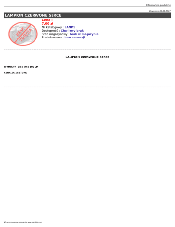 Informacje o produkcie Utworzono 06-03-2017 LAMPION CZERWONE SERCE Cena : 7,00 zł Nr katalogowy : LAMP1 Dostępność : Chwilowy brak Stan magazynowy : brak w magazynie Średnia ocena : brak recenzji LAMPION CZERWONE SERCE WYMIARY - 38 x 70 x 102 CM CENA ZA 1 SZTUKĘ Wygenerowano w programie www.oscGold.com
